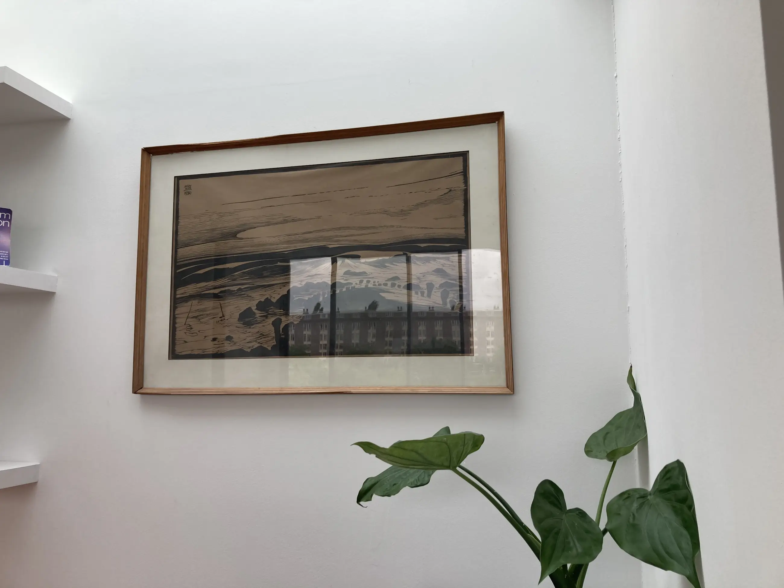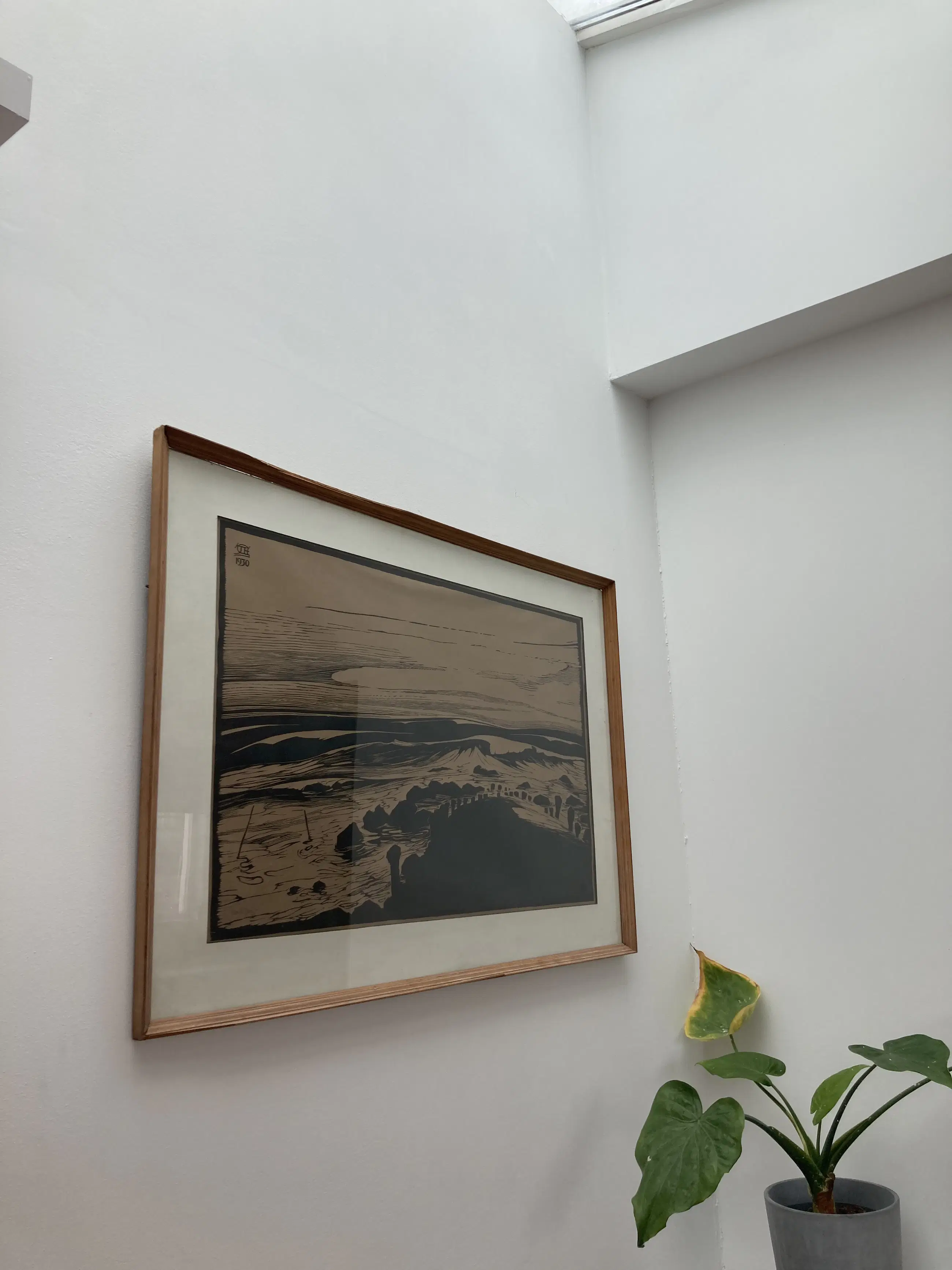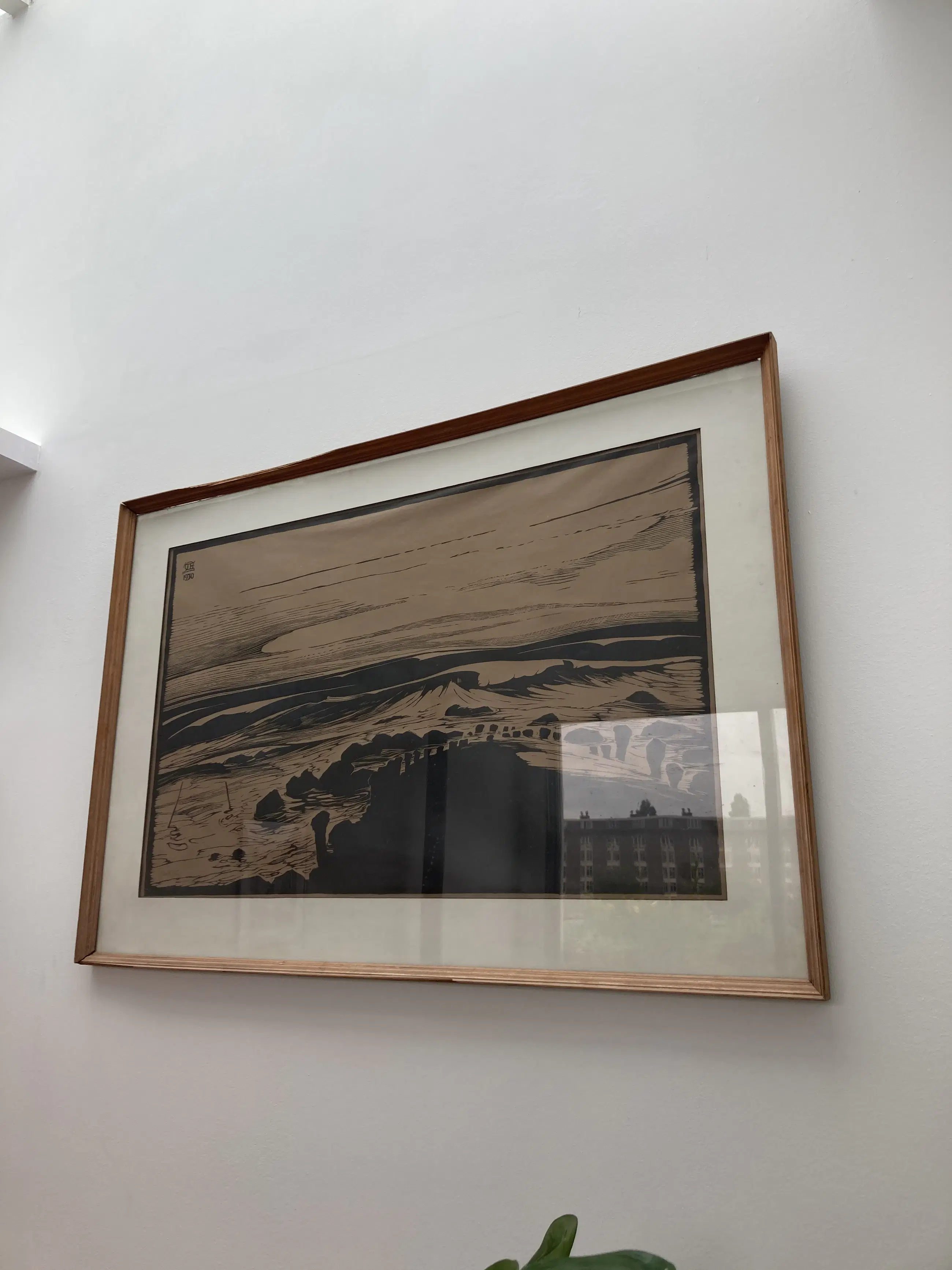 Kustgezicht Houtsnede 1930 53 x 84 cm 73 x 107 cm Lijst heeft beschadigingen.