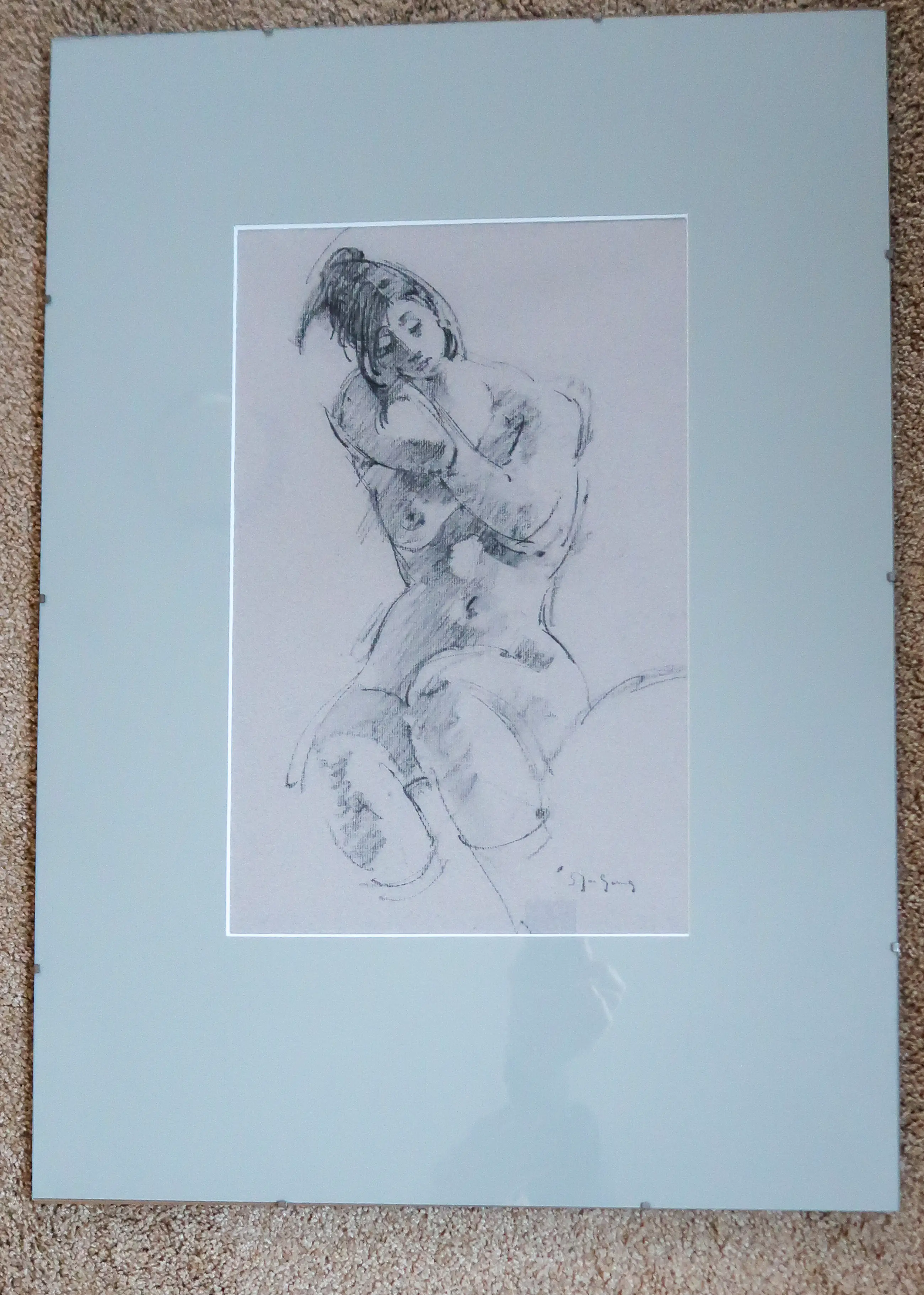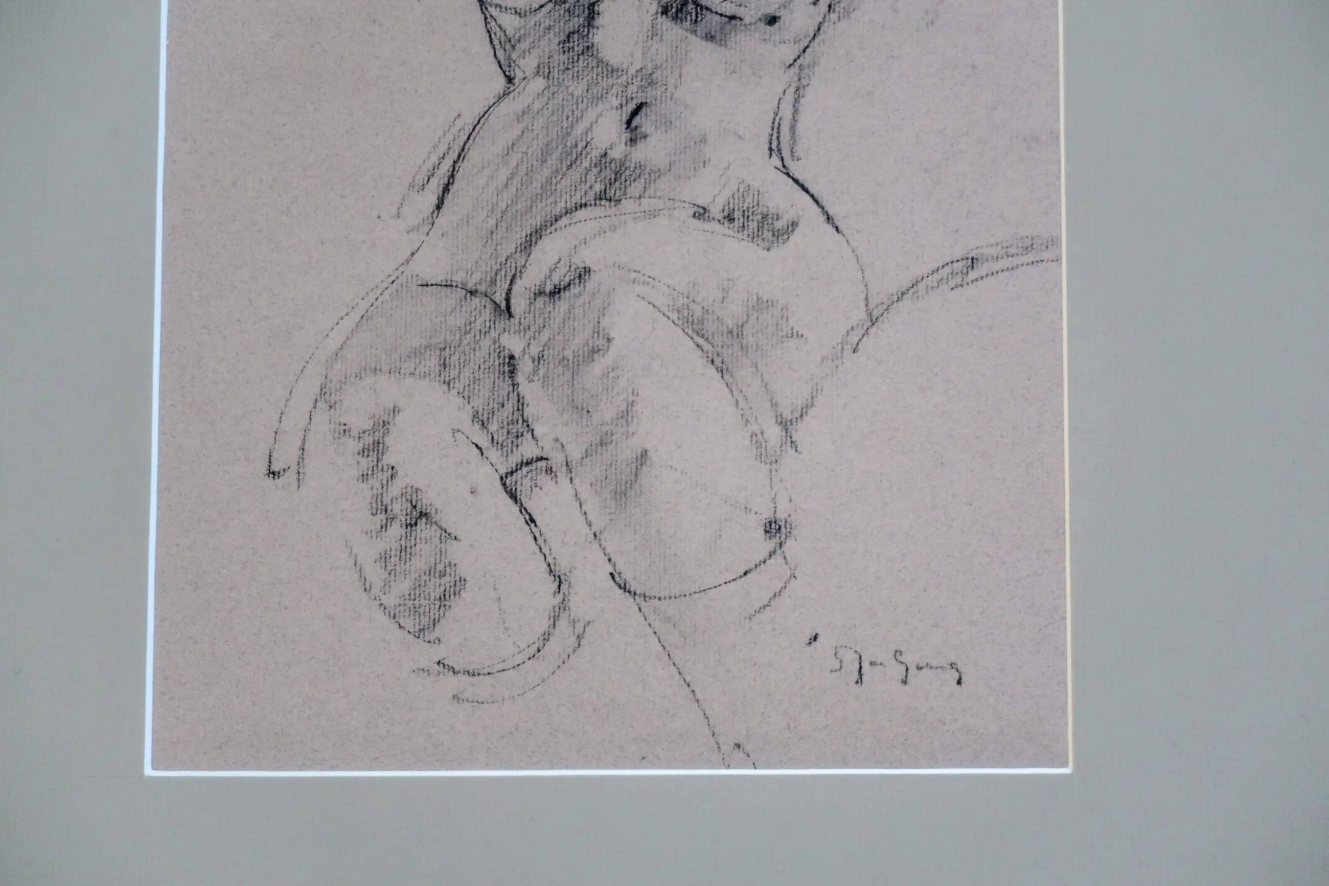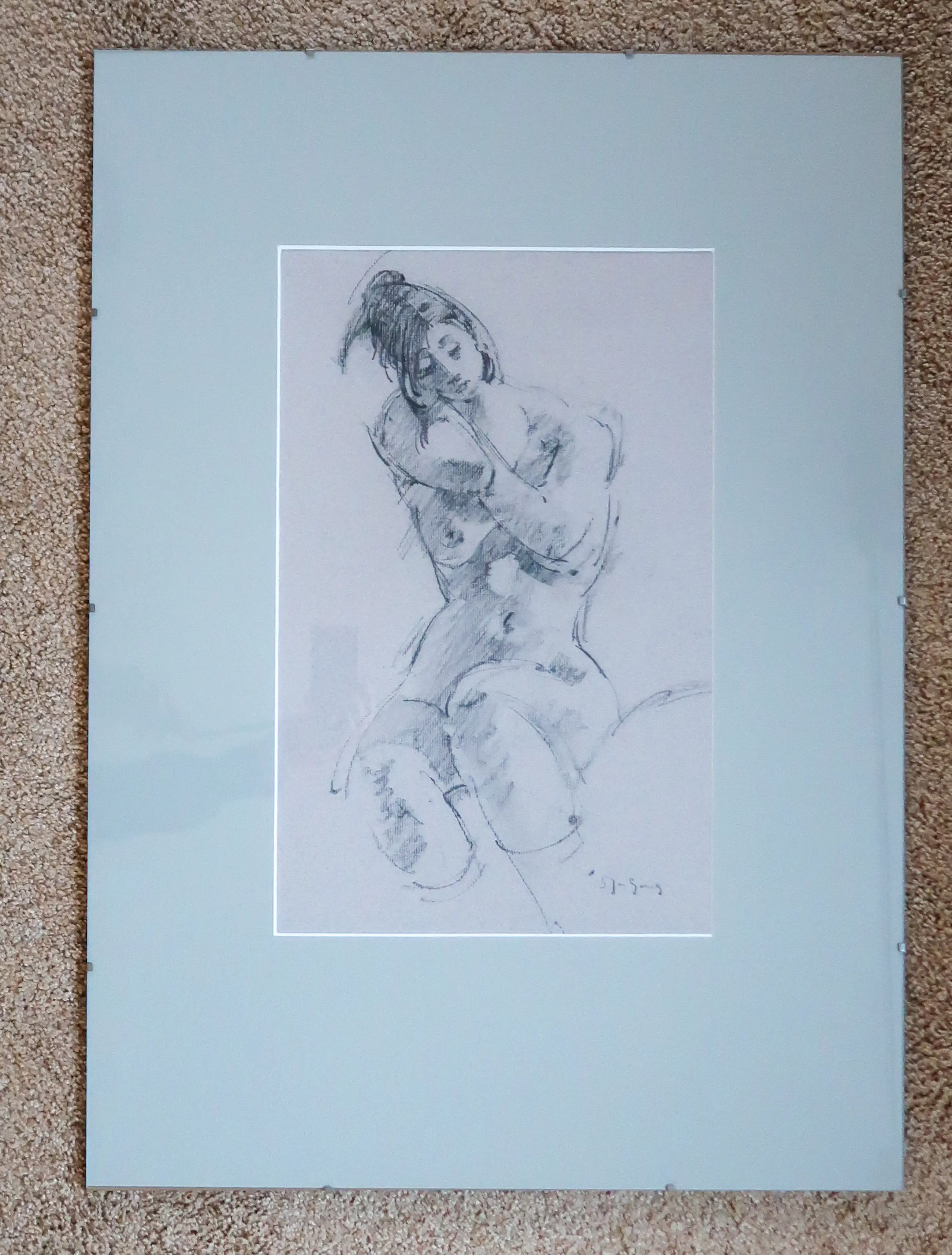 Ingelijste tekening van een zittende naakte vrouw. De techniek was houtskool gefixeerd om de tekening stabiel te houden op iets creme / beige papier.