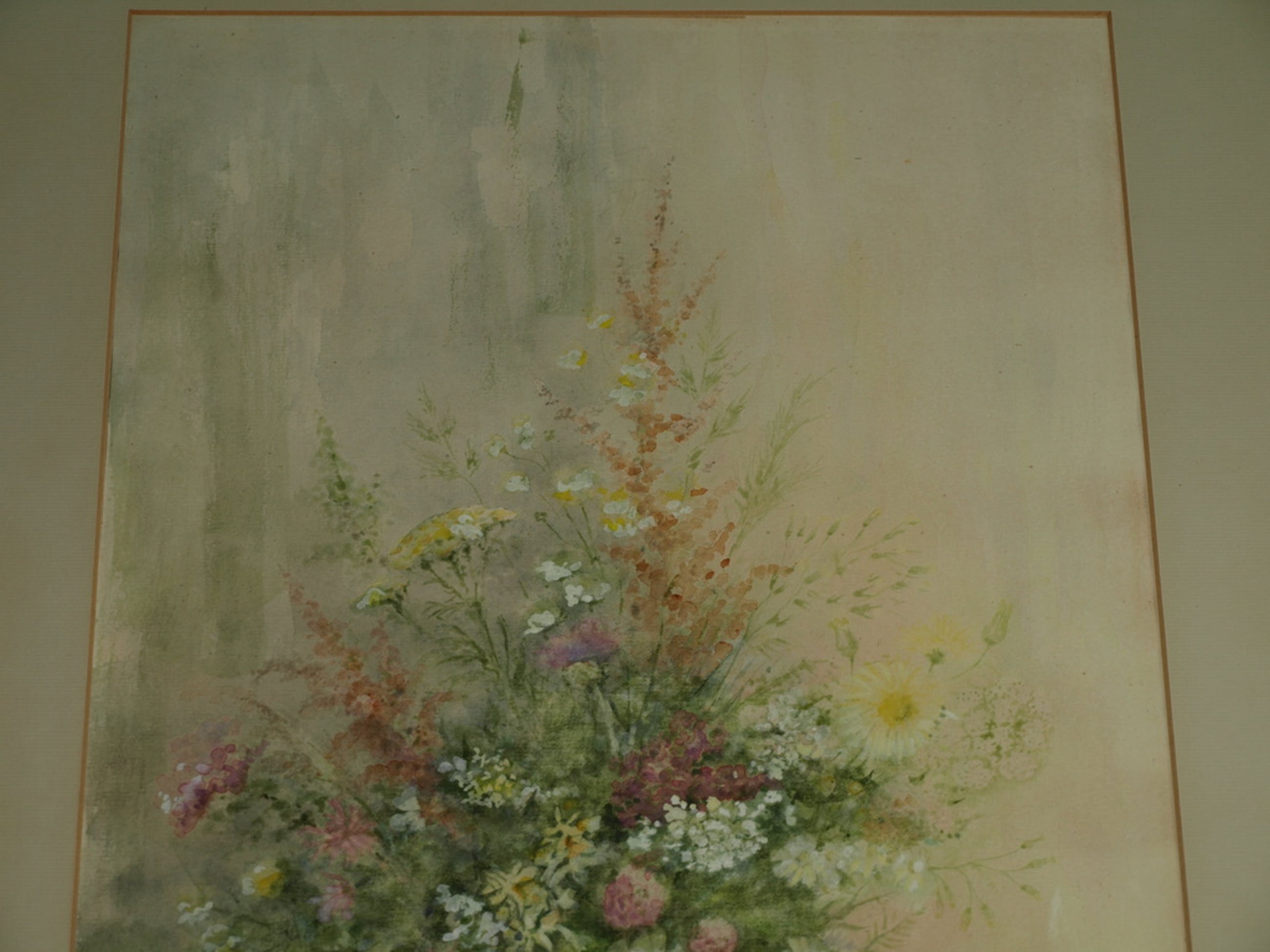 Een grote aquarel van de kunstenaar Jan Goselink uit 1985 met een voorstelling van een vaas bloemen met ernaast een brief....