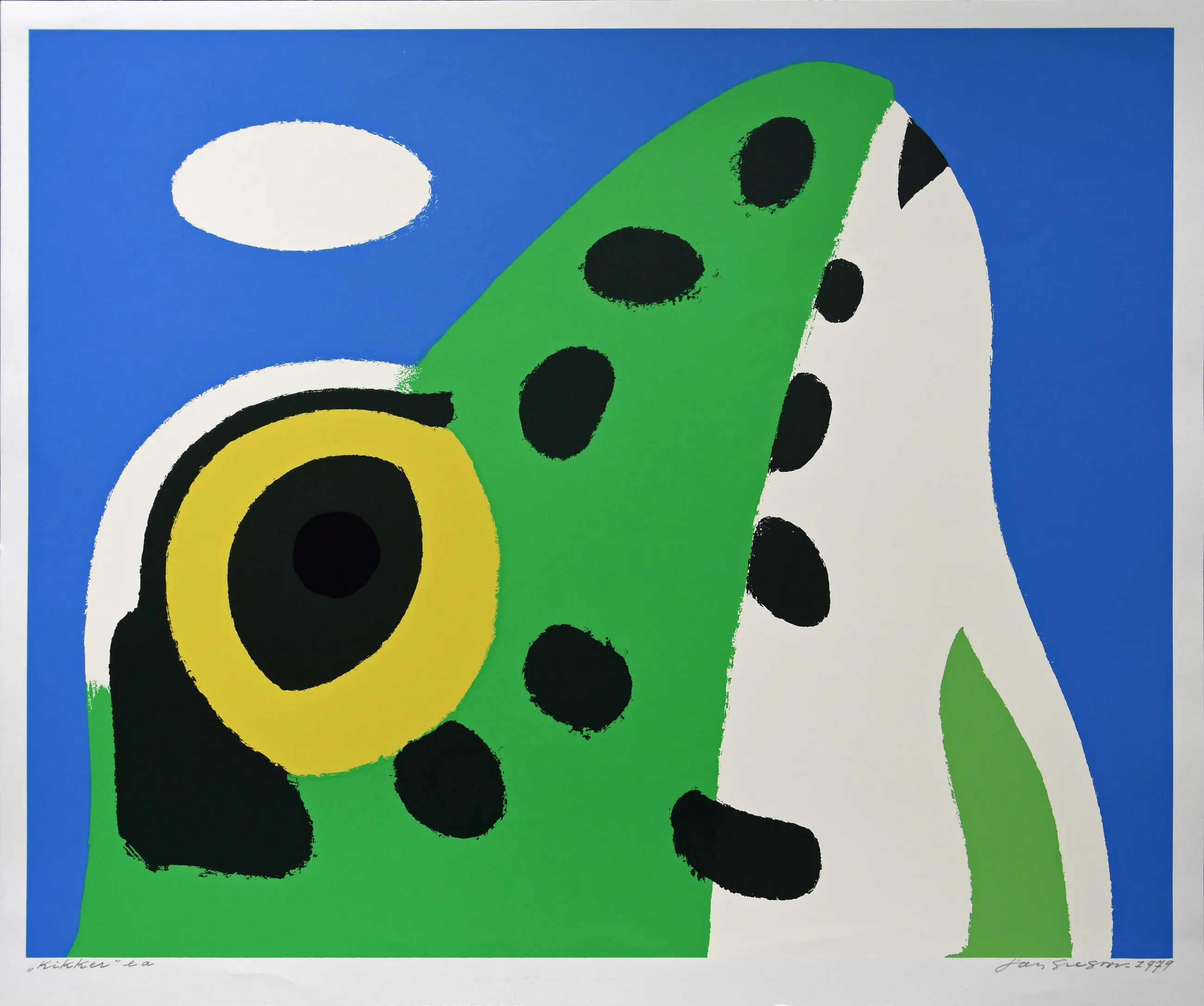 Frisse, gestileerde zeefdruk van een kikker door Jan Gregoor; met vermelding "e.a.".