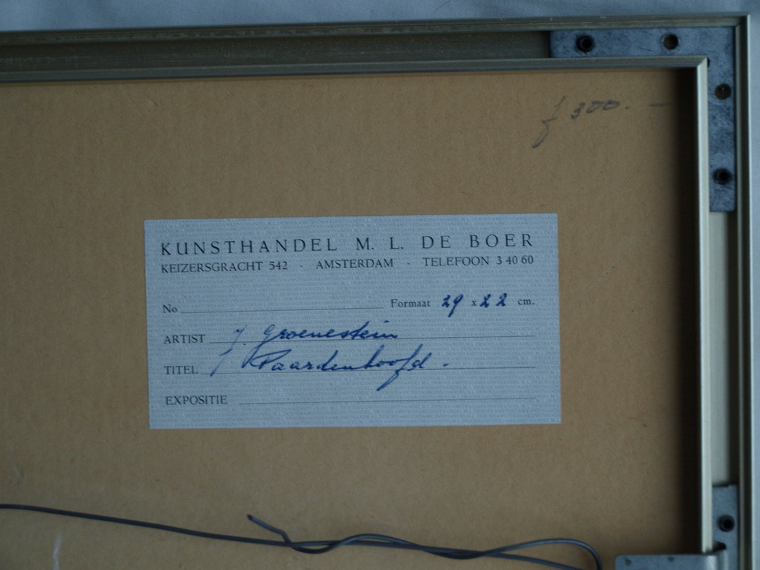 Gesigneerd en ingelijst in een aluminium lijst met passe-partout en glasplaat. Op de achterkant zit een papier van Kunsthandel M.L. de Boer, Keizersgracht Amsterdam met de vermelding van de naam van de kunstenaar en de titel van dit werk. Ook staat daar de oorspronkelijke galerieprijs vermeld: Fl 300,-.