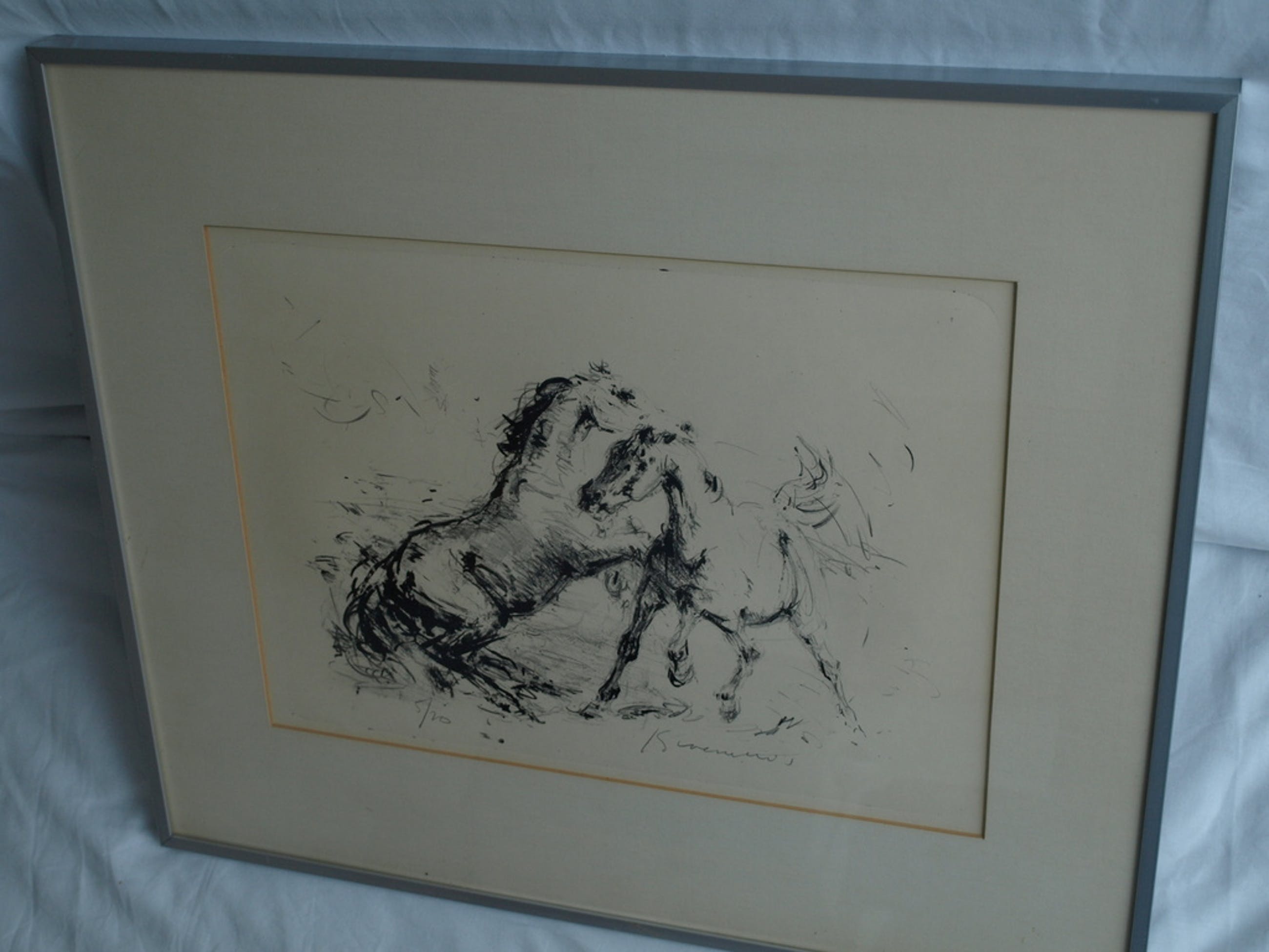 Handgesigneerd en –genummerd met potlood. Ingelijst in een aluminium lijst met passe-partout en glasplaat.