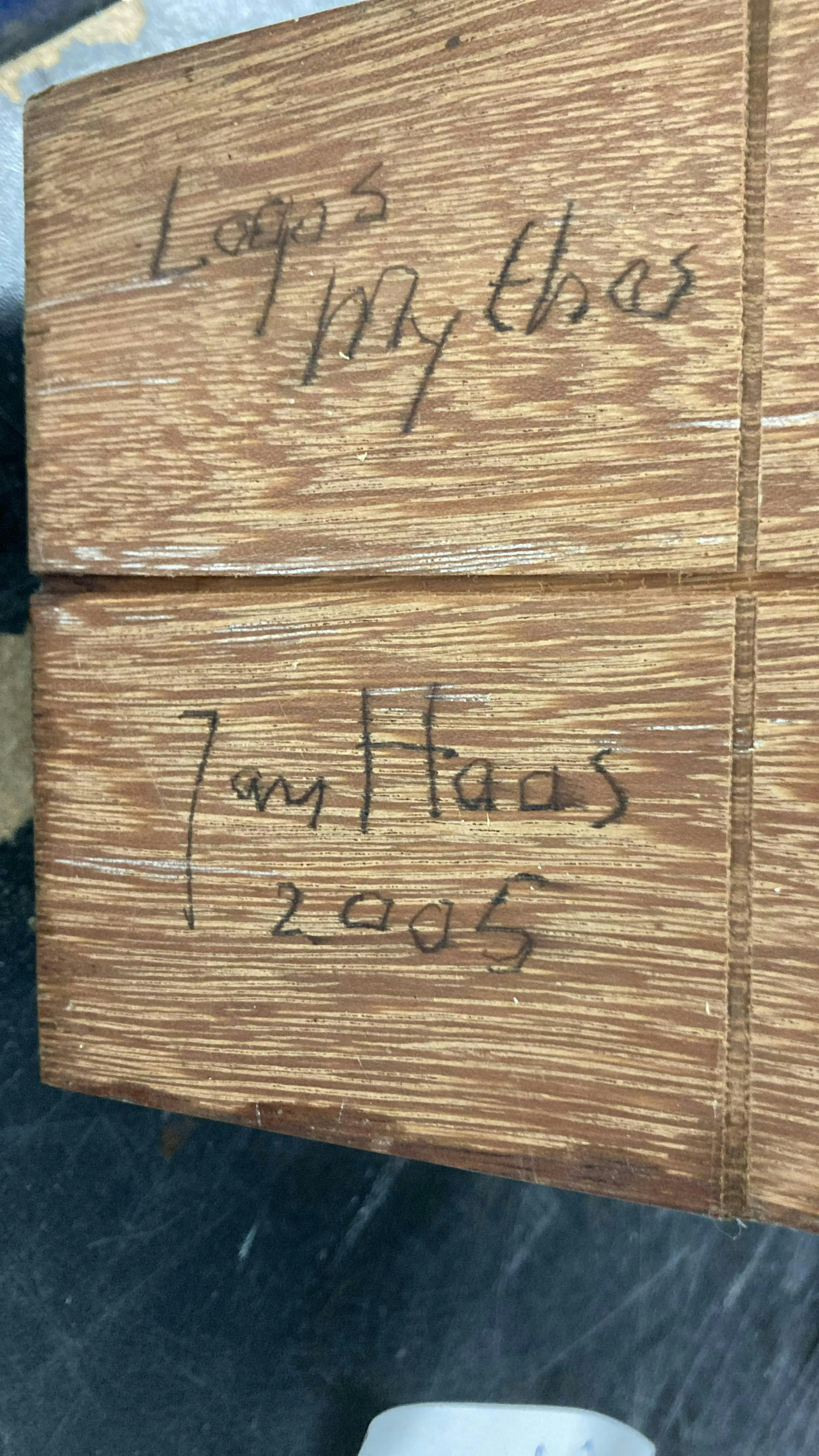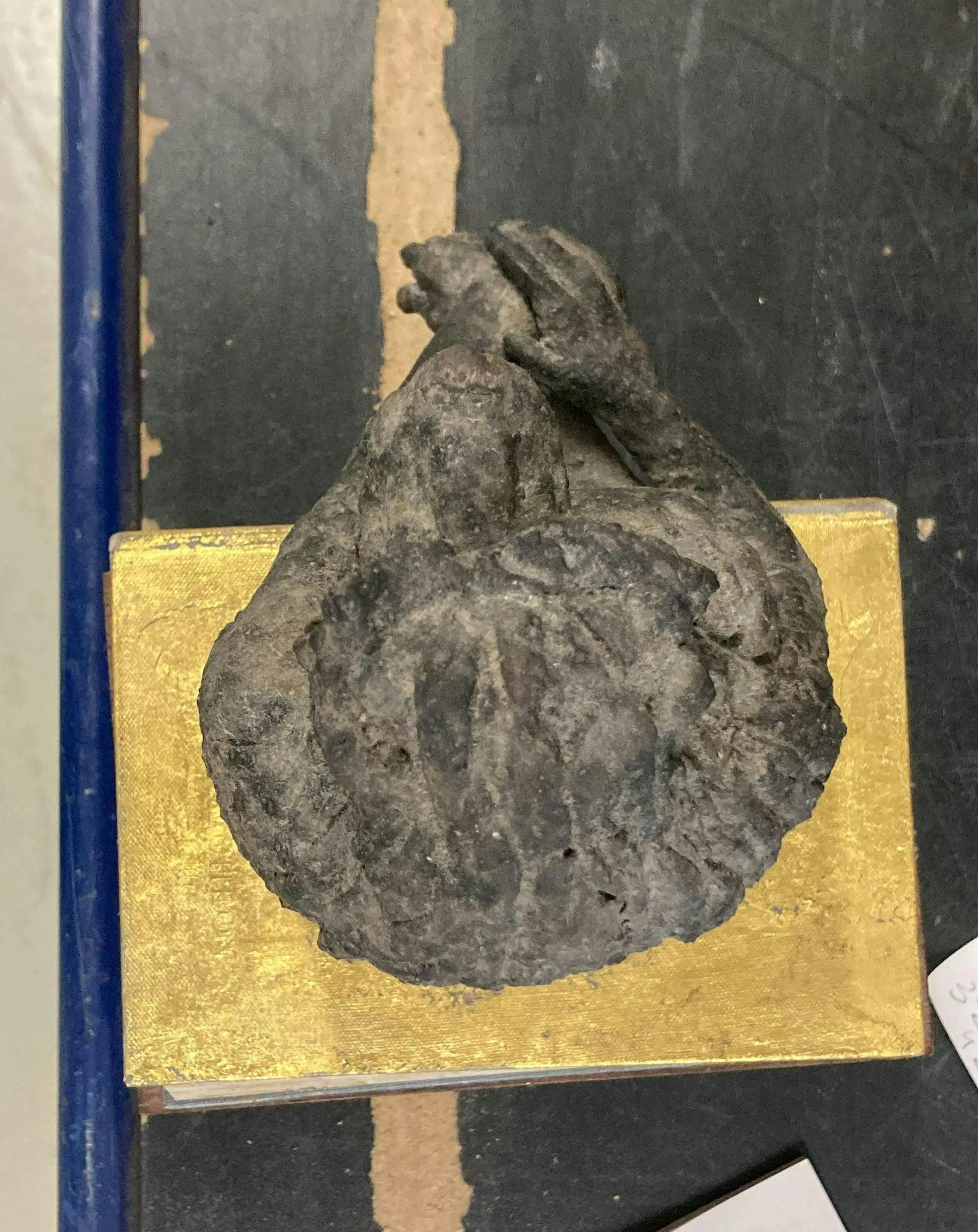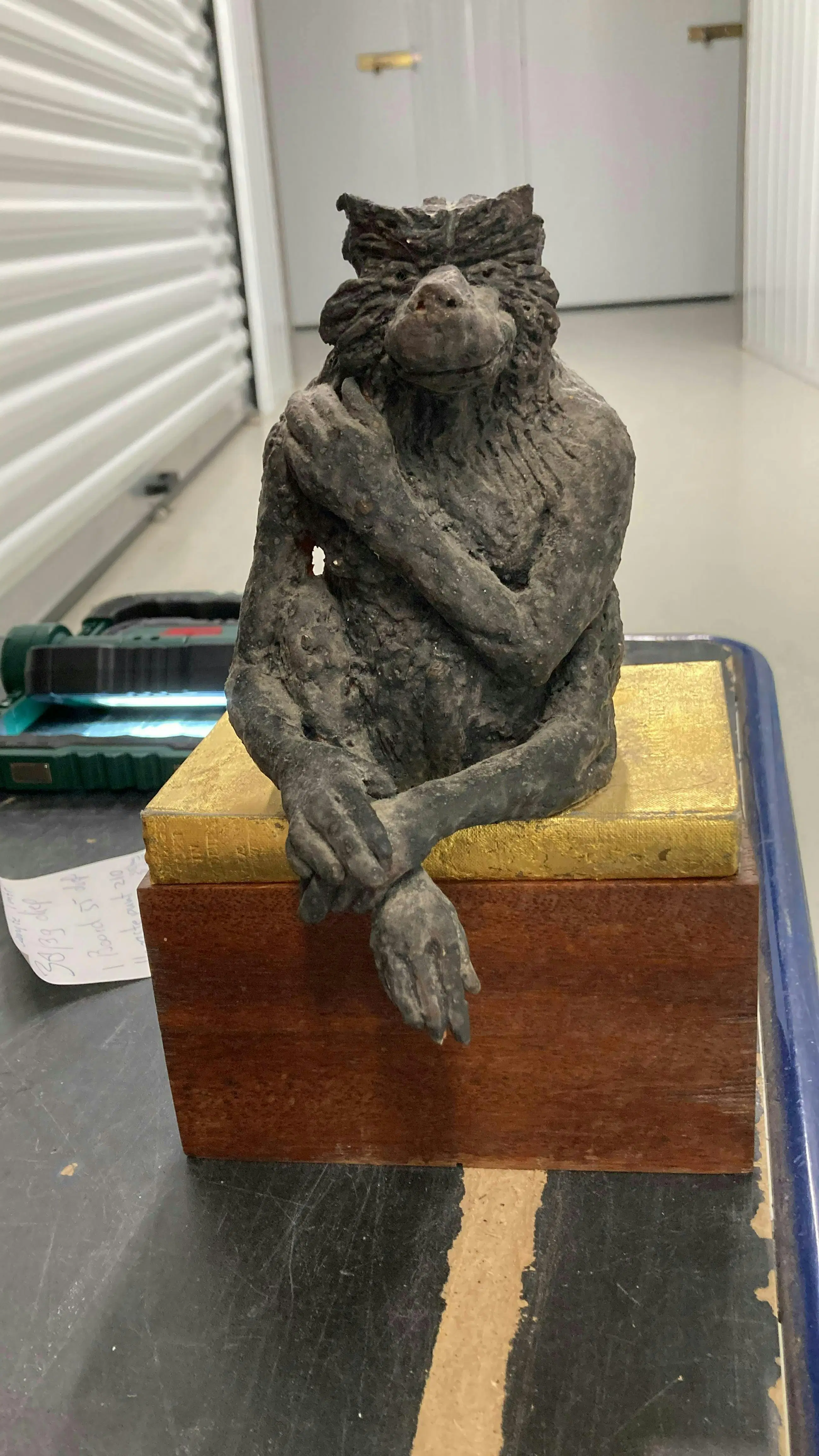 Aapje van terra cotta klei zwart gemaakt. Door mijn zus gekocht op een tentoonstelling van Jan Haas met allemaal terra cotta beelden voor haar man(zie kaartje bij de foto’s) Zit op boekje met goudverf op een blok hout.