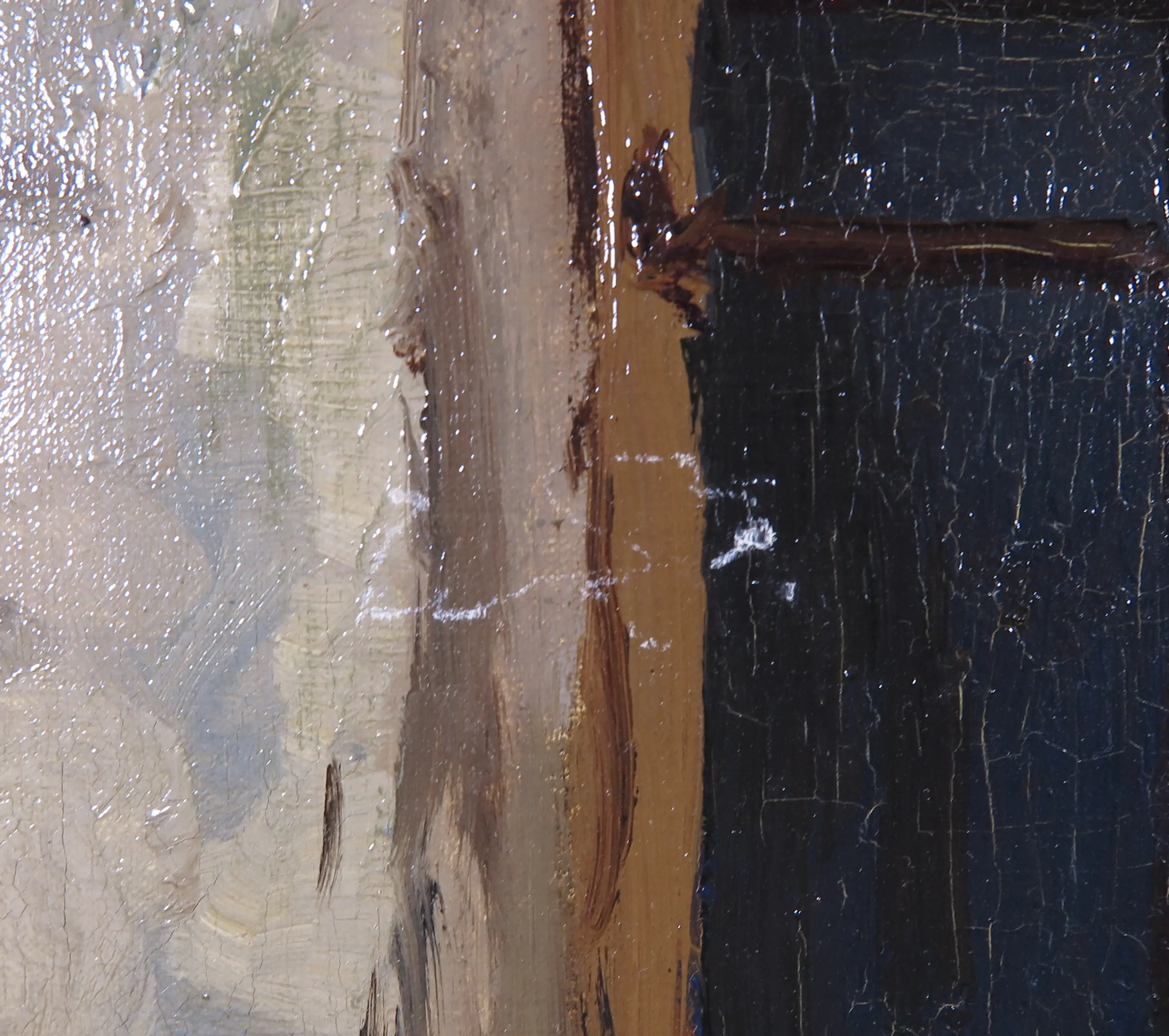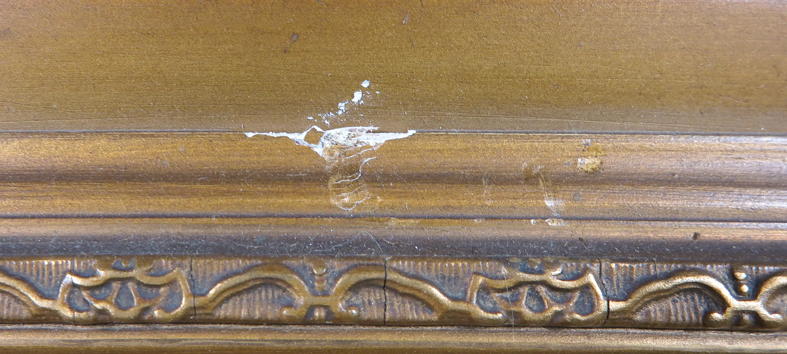 | Het doek is in goede staat, maar bevat op enkele plekjes witte verf dat hoogstwaarschijnlijk geen onderdeel van de oorspronkelijke voorstelling was. Craquelé is minimaal aanwezig. De lijst is op twee plekjes aangetast. | |