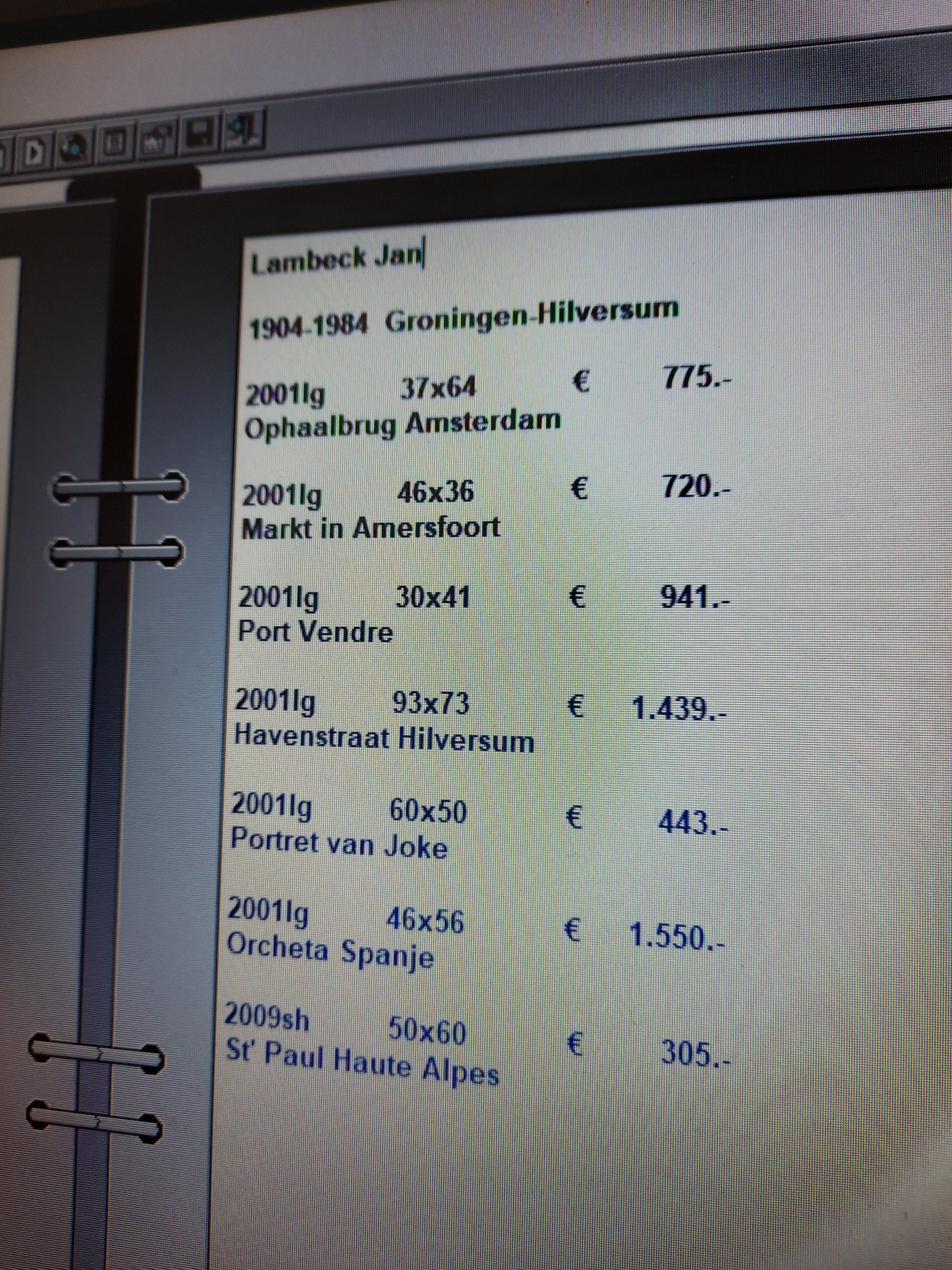 Zie ook de foto met veilingopbrengsten. De schilder Jan Harmannus Lambeck werd in 1904 te Groningen geboren. Al op jonge leeftijd schilderde hij in de omgeving van Amsterdam alwaar hij de schilders Harry Kuijten en Dirk Filarski ontmoette die de jonge Lambeck vervolgens onder hun hoede namen. Het was echter pas in 1939 dat hij, samen met zijn vrouw, definitief uit het noorden vertrok en zich vestigde in Hilversum. Niet verrassend gezien zijn leermeesters ontwikkelde hij een eigen interpretatie van de Bergense School: landschappen met een ferme toets en in een kleurig palet op het doek gezet. Van deze vroege werken is helaas maar een enkel schilderij de oorlog ongeschonden doorgekomen. De bescheiden en publiciteitsschuwe Lambeck werkte na de oorlog gestaag door aan zijn oeuvre. Vanaf de vroege jaren ?50 trok hij met regelmaat de grenzen over. Spanje, Zwitserland en Frankrijk hadden de voorkeur. Zijn heuvellandschappen worden nu en dan beïnvloed door Cezanne stilering, terwijl andere werken herinneringen oproepen aan het werk van de Groninger Ploeg. Ook nam de diversiteit van zijn onderwerpen toe zoals de portretten en schilderijen van werkende figuren, ontstaan in de jaren ?70, laten zien. Jan Lambeck overleed in 1984 en al die tijd bleef zijn werk min of meer onopgemerkt in de kring van familie en vrienden. Dit duurde tot het jaar 2000 toen Museum De Wieger te Deurne besloot een tentoonstelling van zijn werk te organiseren en het werk van Jan Lambeck daarmee aan de vergetelheid wist te onttrekken.