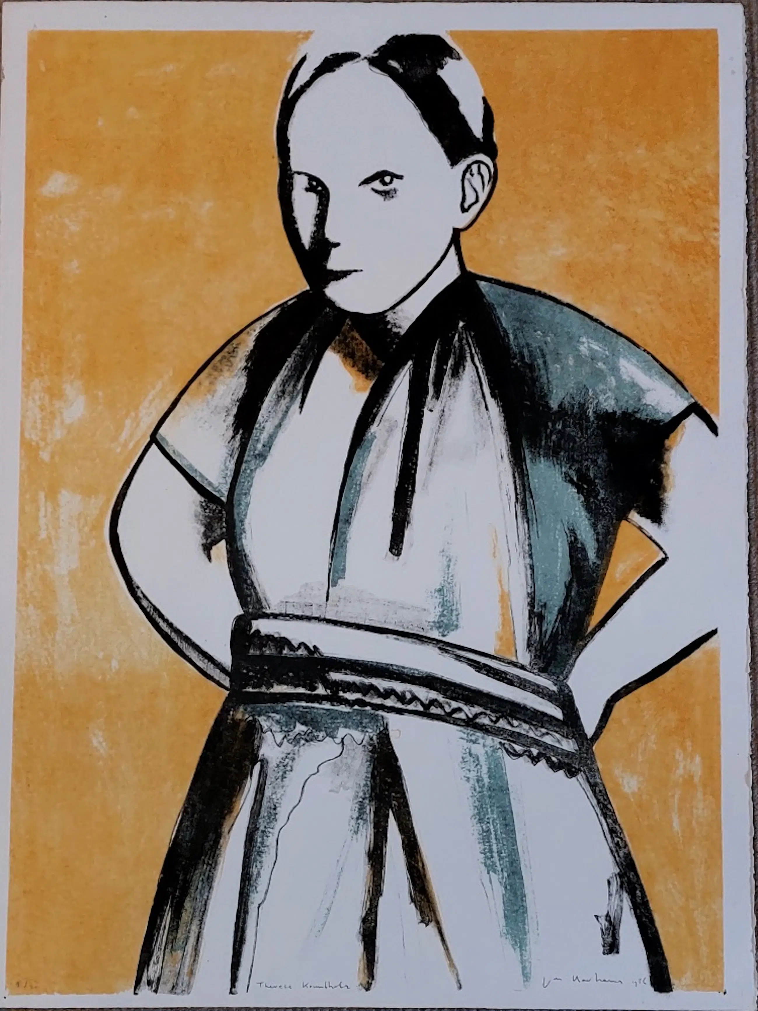 Fraaie gesigneerde kleurenlitho van deze bijzondere Utrechtse kunstenaar. Oplage slecht 9 exemplaren, in potlood gesigneerd, gedateerd en genummerd. Midden onder in potlood 'Therese Krumholz'