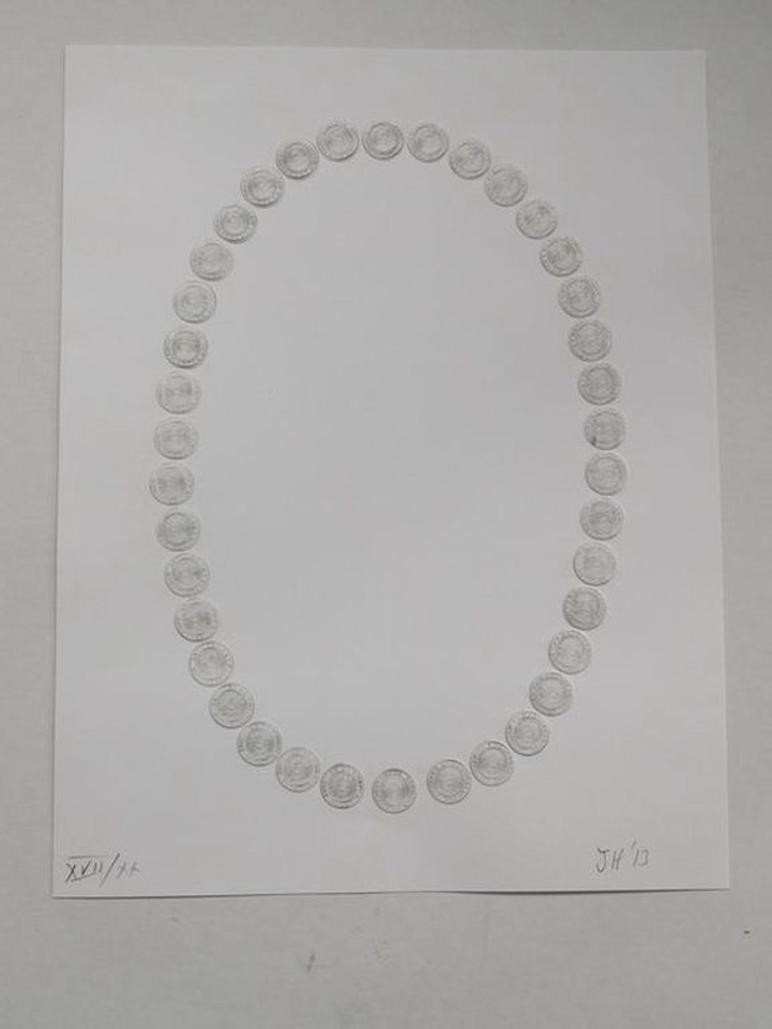 Blinddruk/ zeefdruk (Antilliaanse muntjes) "NUL" van Zero kunstenaar Jan Henderikse. Deze druk is uitgegeven in 2013 en heeft als nummering (EA) XVII/XX. Uitgave (totaal 120; 100 en 20 EA exemplaren) ) van Lecturis en "Schoots + Duyse". Achterzijde is ook gesigneerd en genummerd. Achterop het mapje is het colofon vermeld en tevens de nummering en signatuur. Afmeting 22 x 30.5 cm.