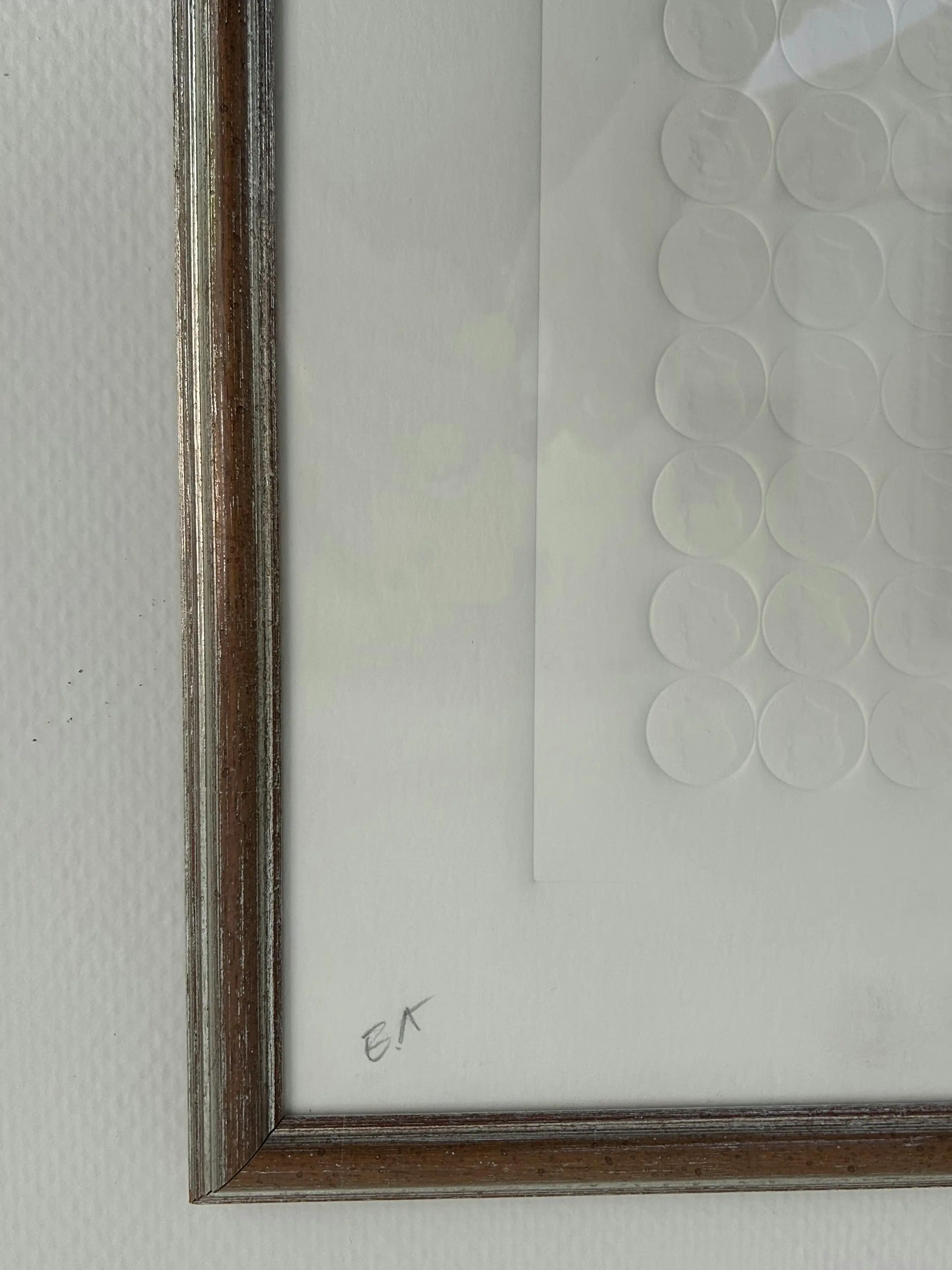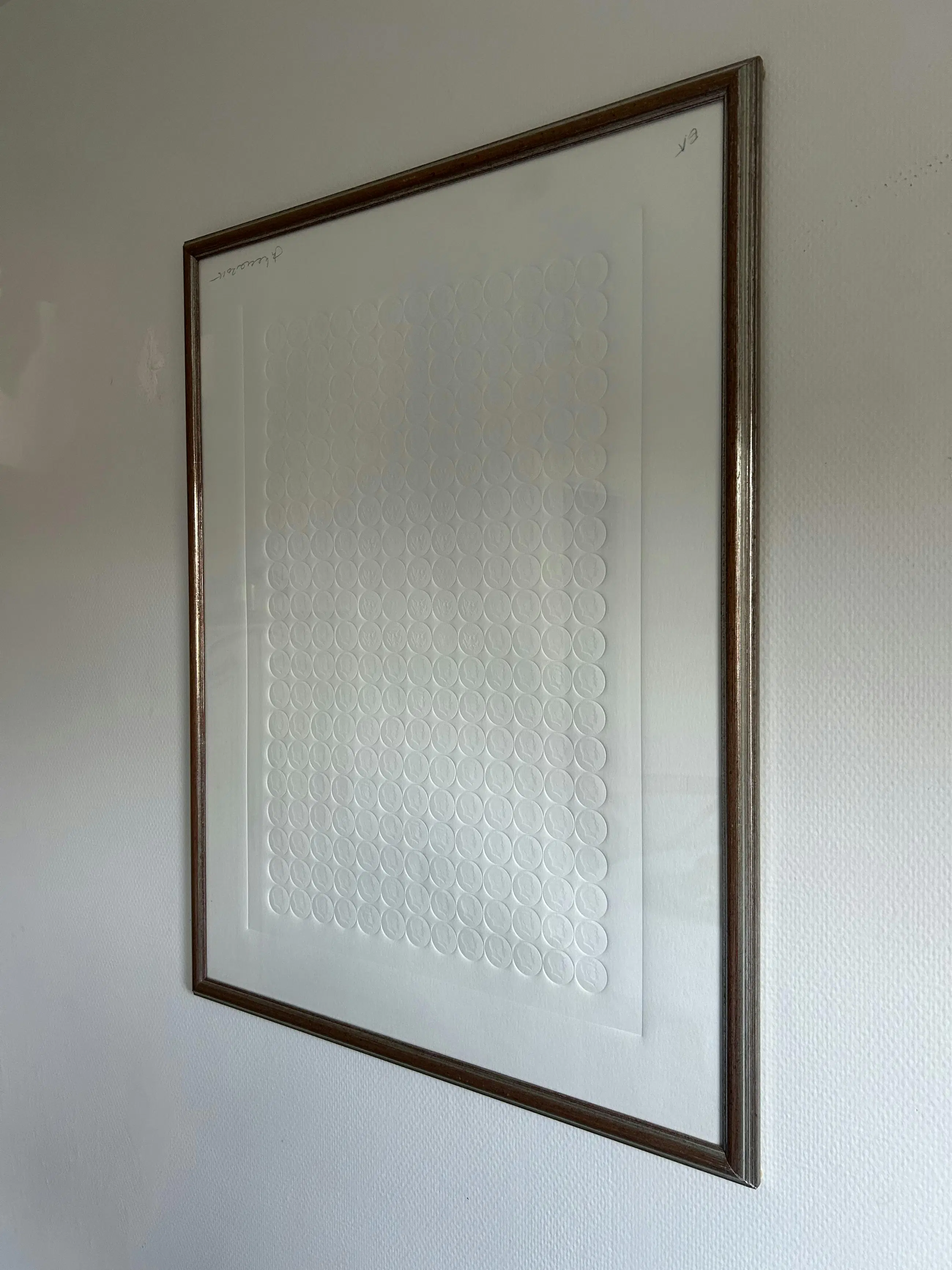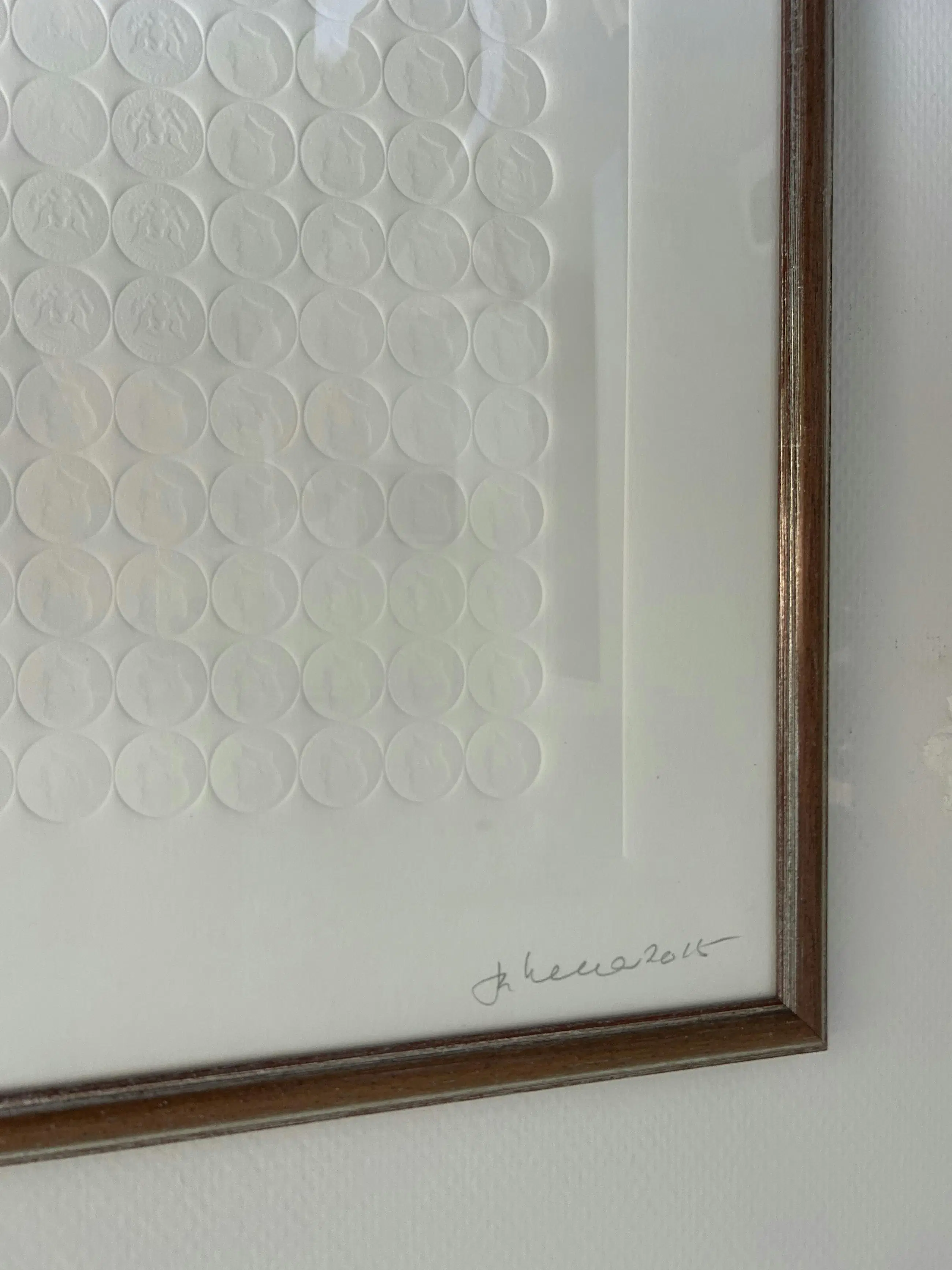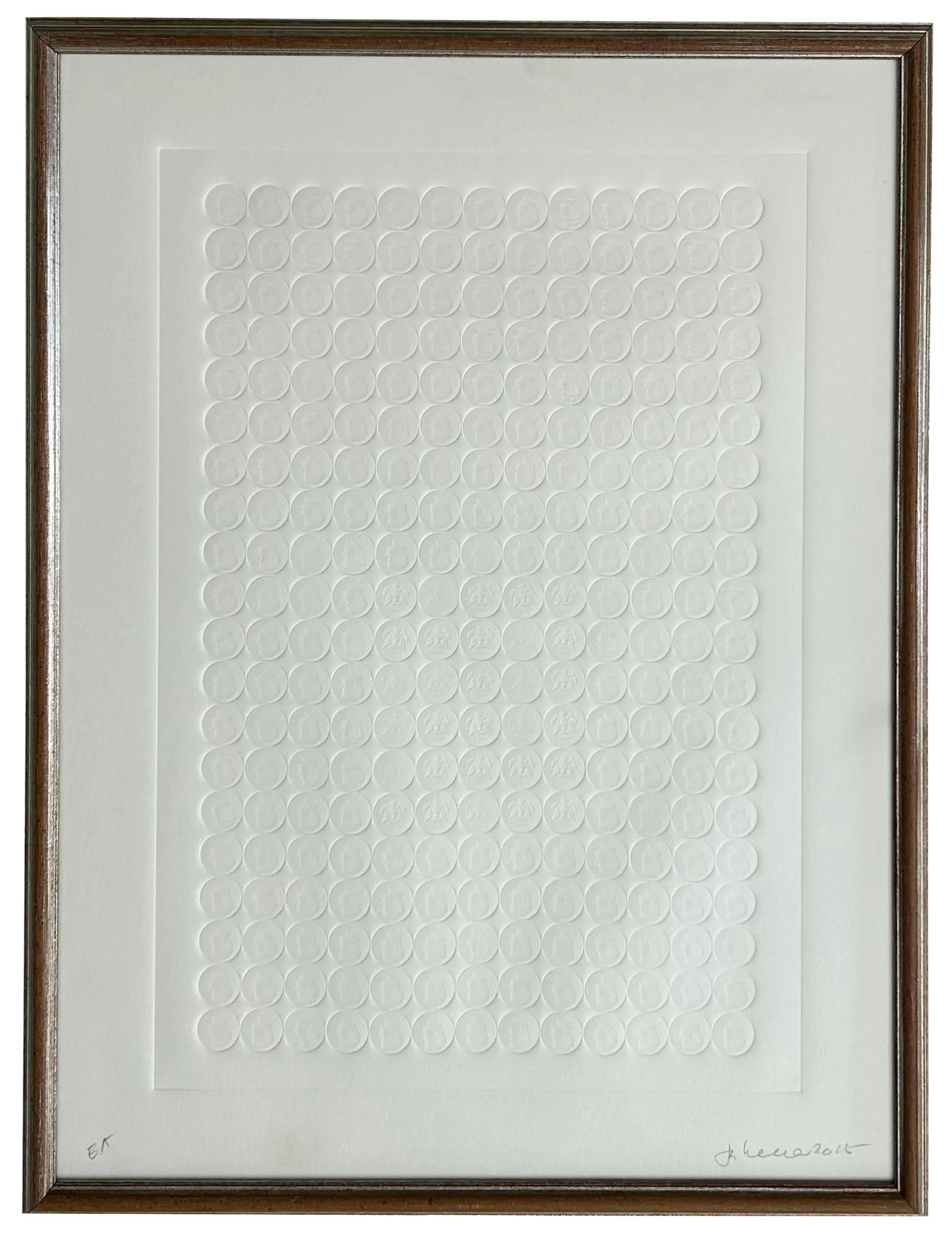 Deze preegdruk bevat de reliëfs van een groot aantal dollarmunten met een afbeelding van JFK - een terugkerend thema in zijn werk. Dit werk werd omgekeerd gesigneerd in potlood en werd dus correct ingekaderd.