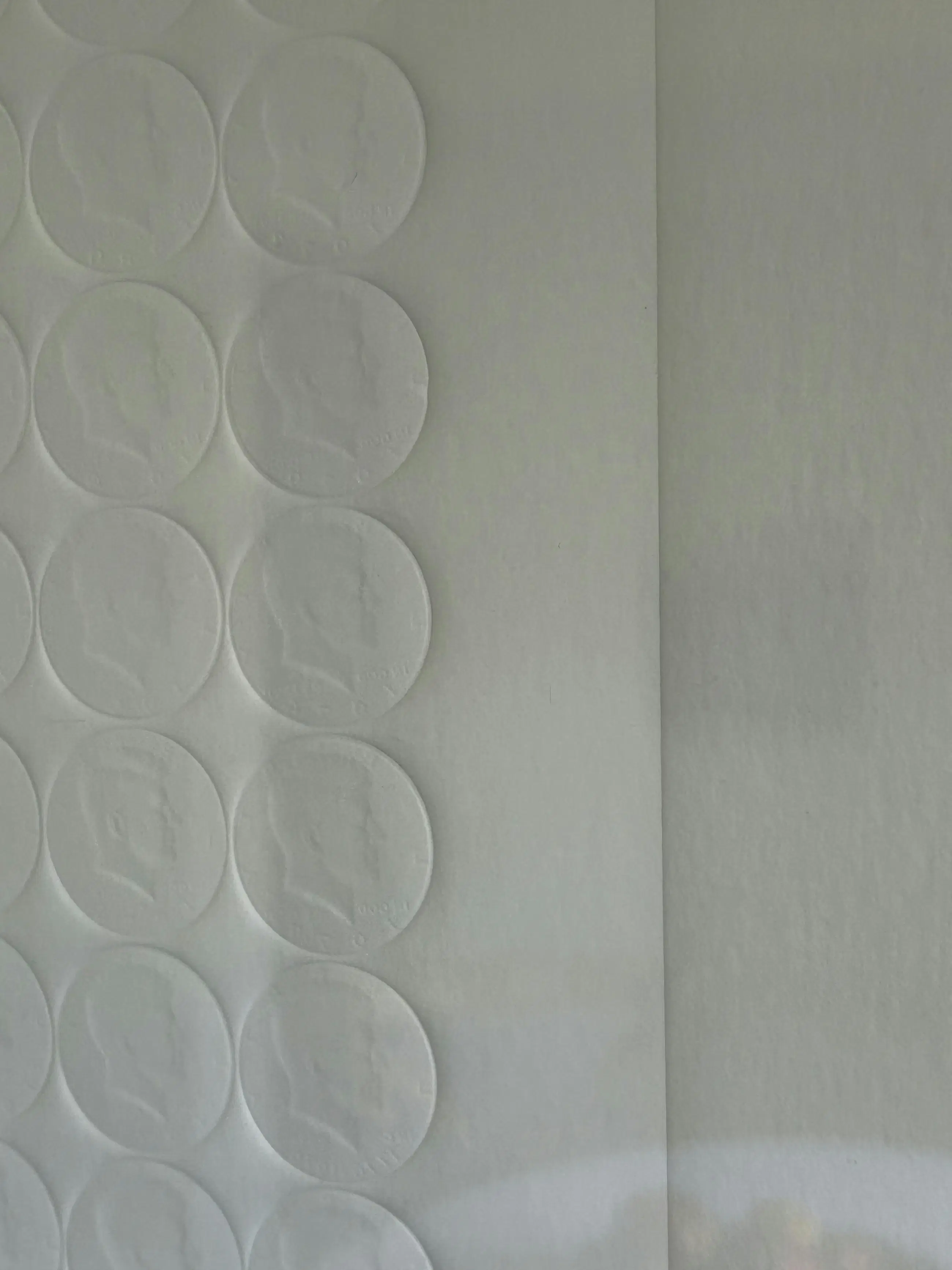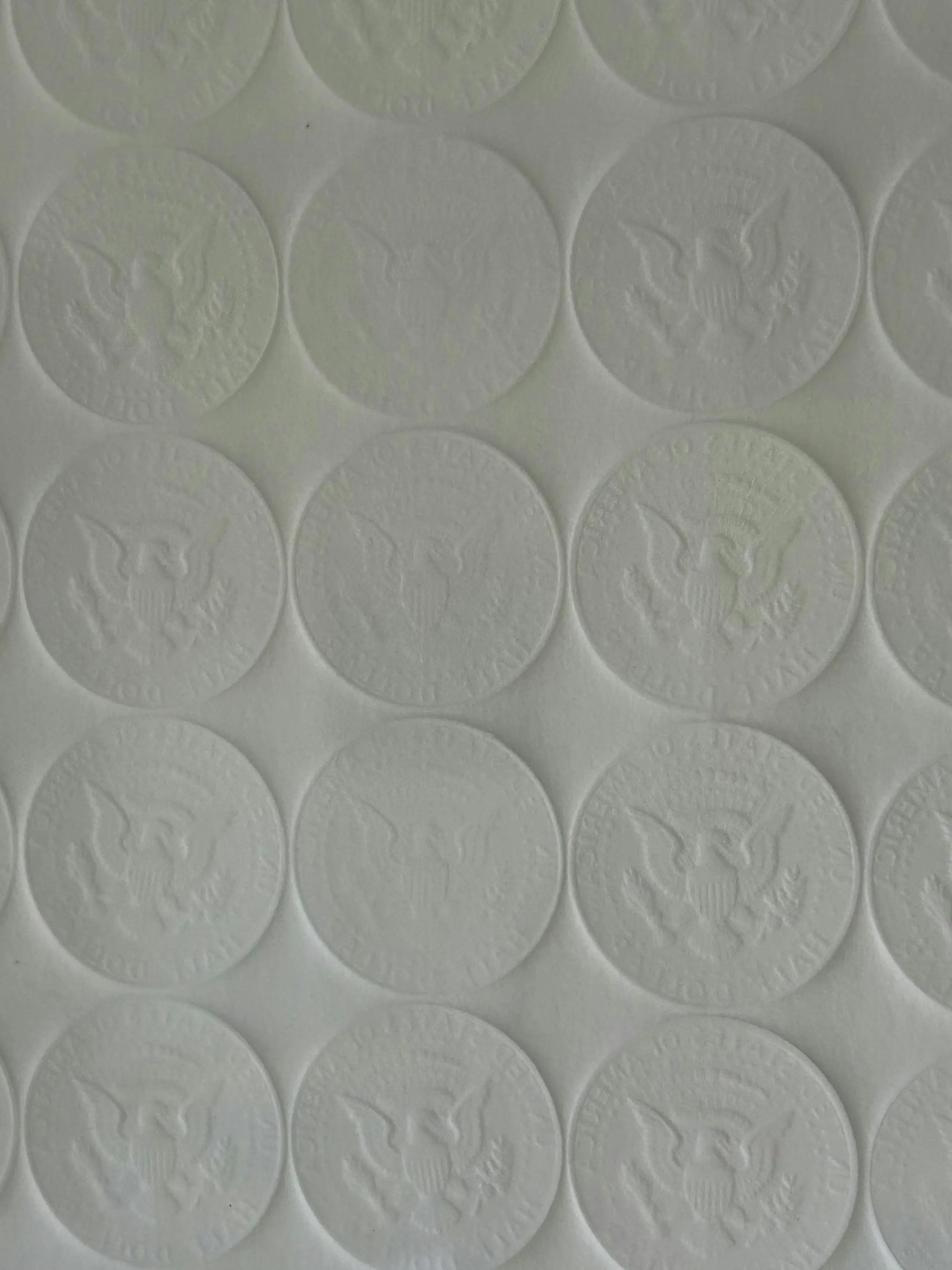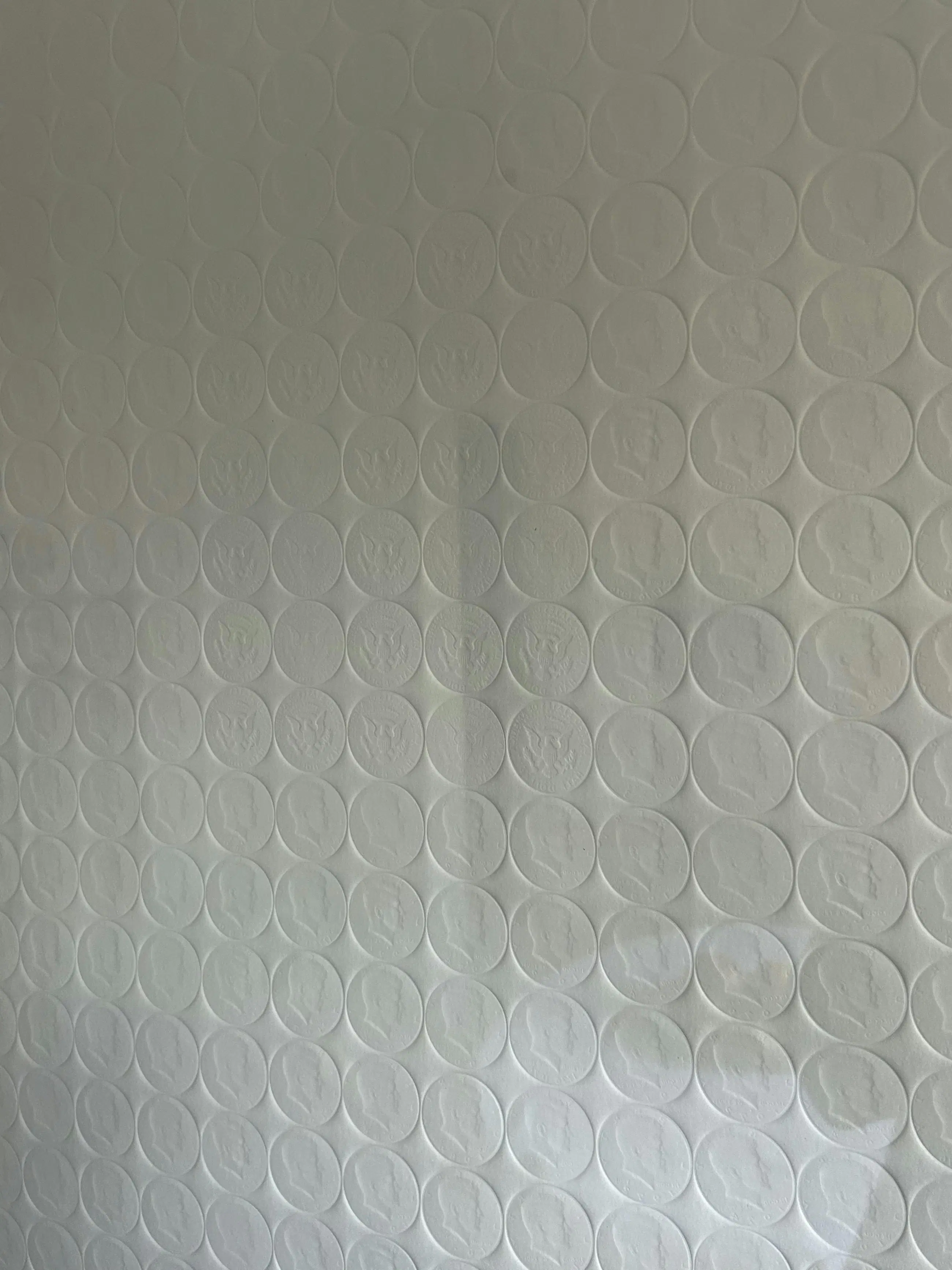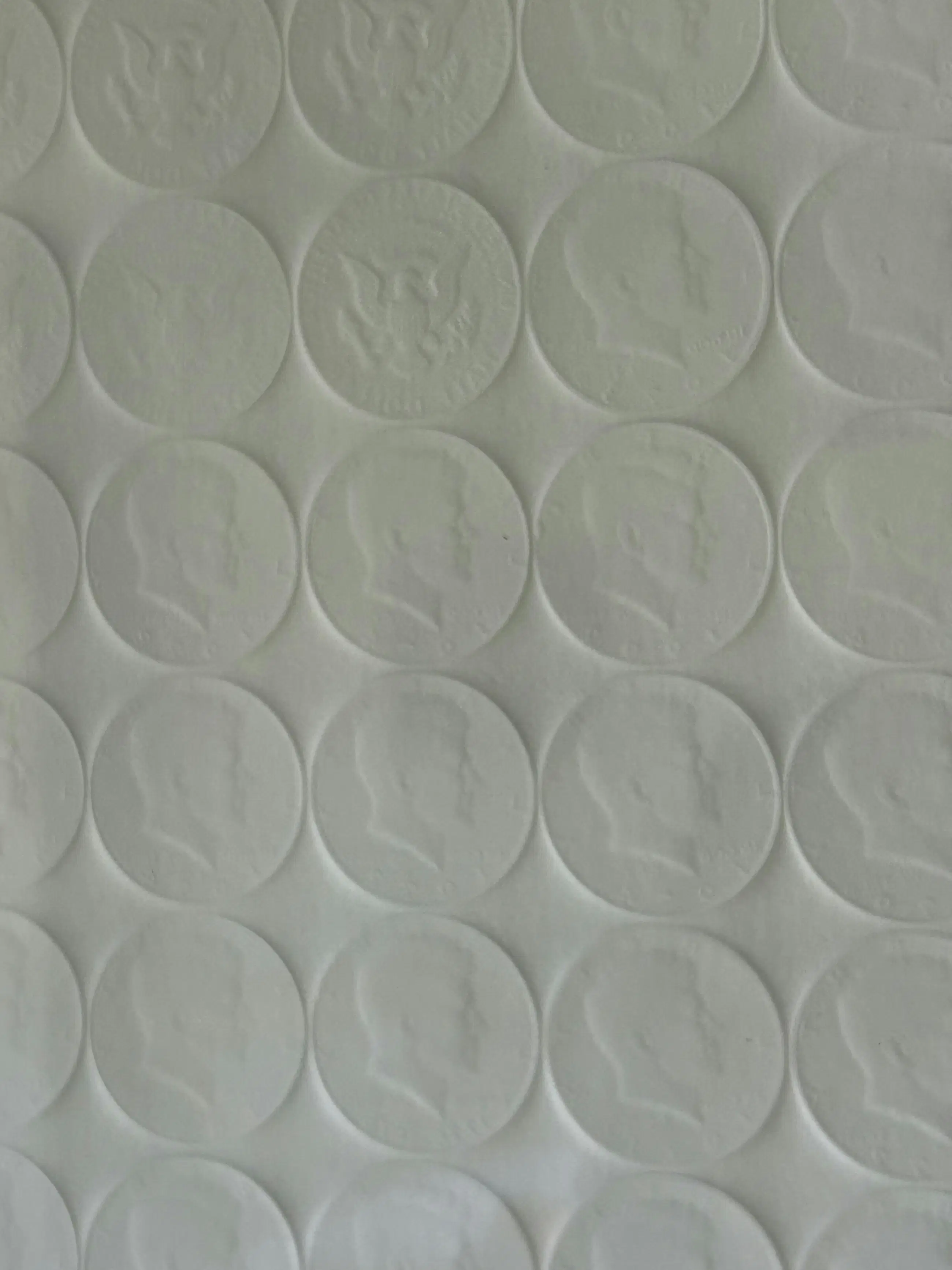 Deze preegdruk bevat de reliëfs van een groot aantal dollarmunten met een afbeelding van JFK - een terugkerend thema in zijn werk. Dit werk werd omgekeerd gesigneerd in potlood en werd dus correct ingekaderd.