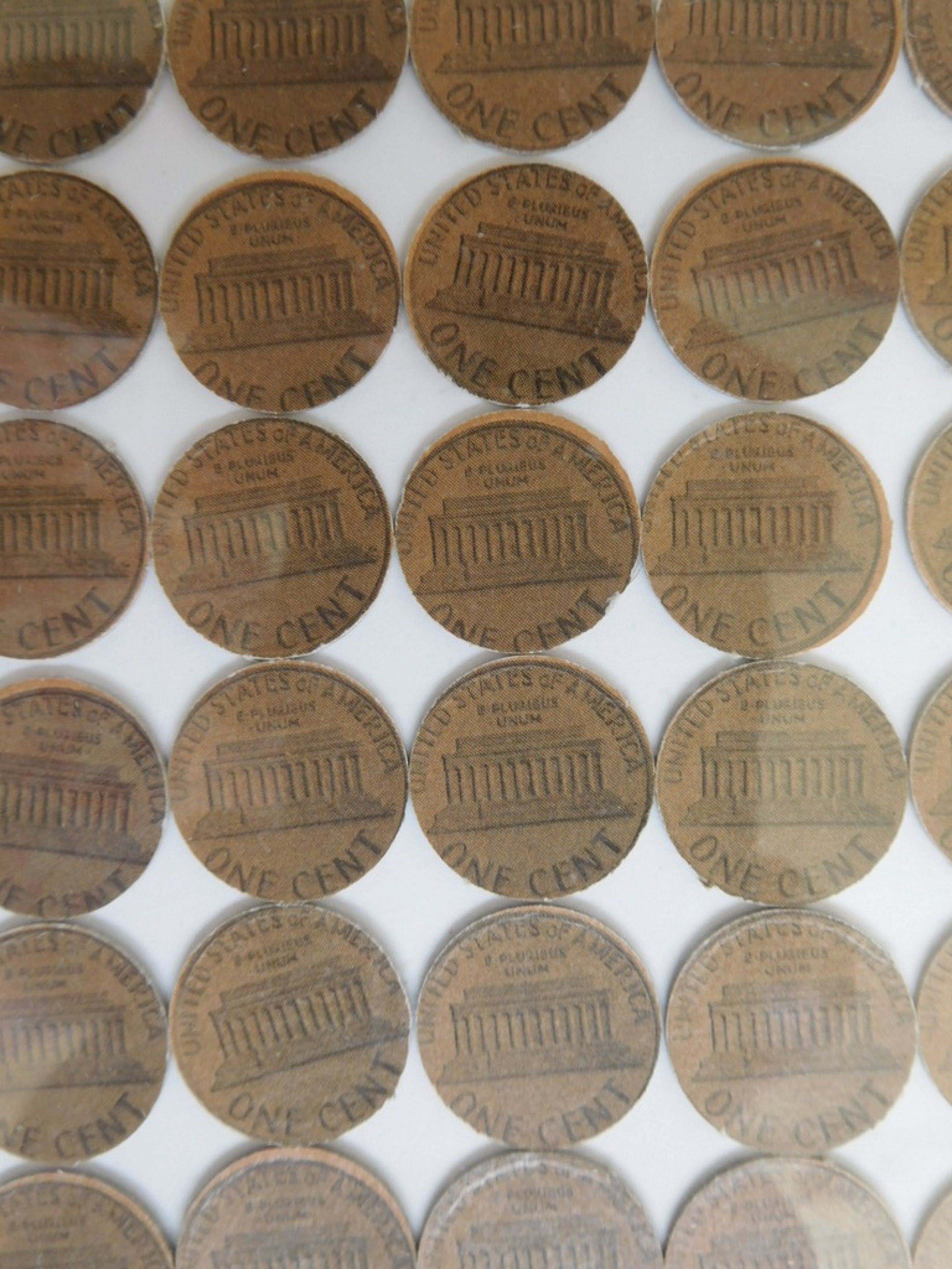 Uniek werk (One Cent) van Jan Henderikse uit 199. Het werk bestaat uit kartonnen muntjes uit de VS ingekaderd door Jan met potlood. het werk heeft een nummering 1/2. Het meet 23,5 x 18 cm en is gevat in wit houten baklijstje van 34 x 28 cm.