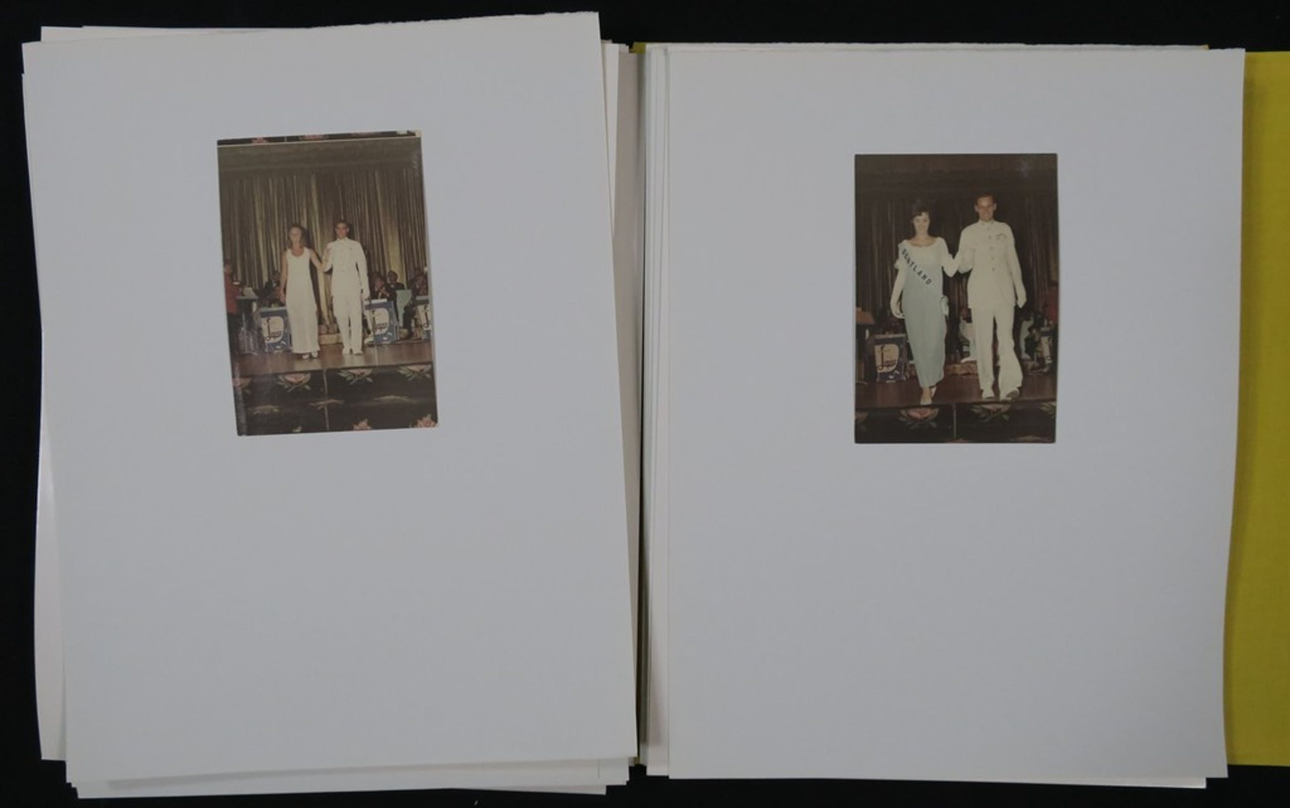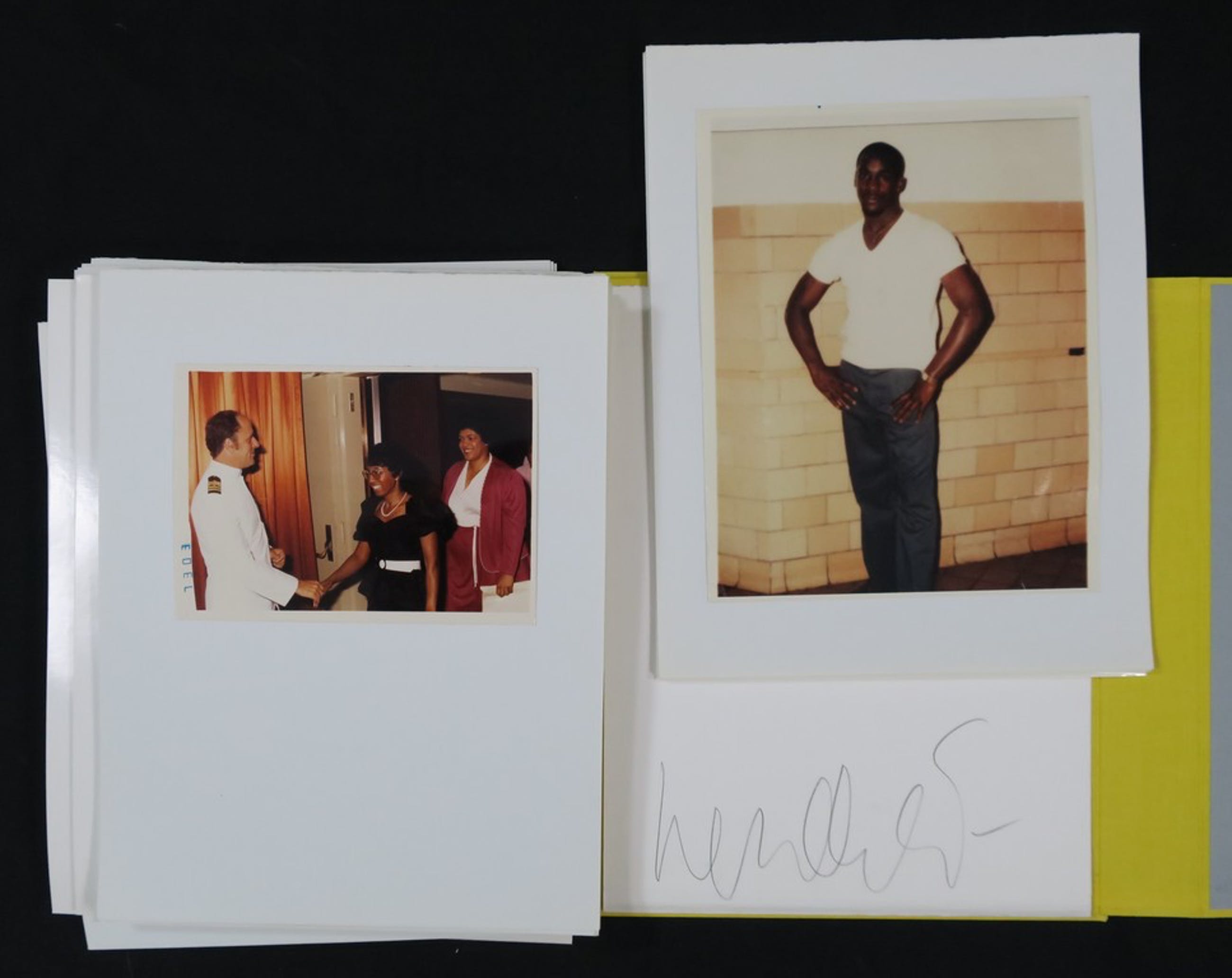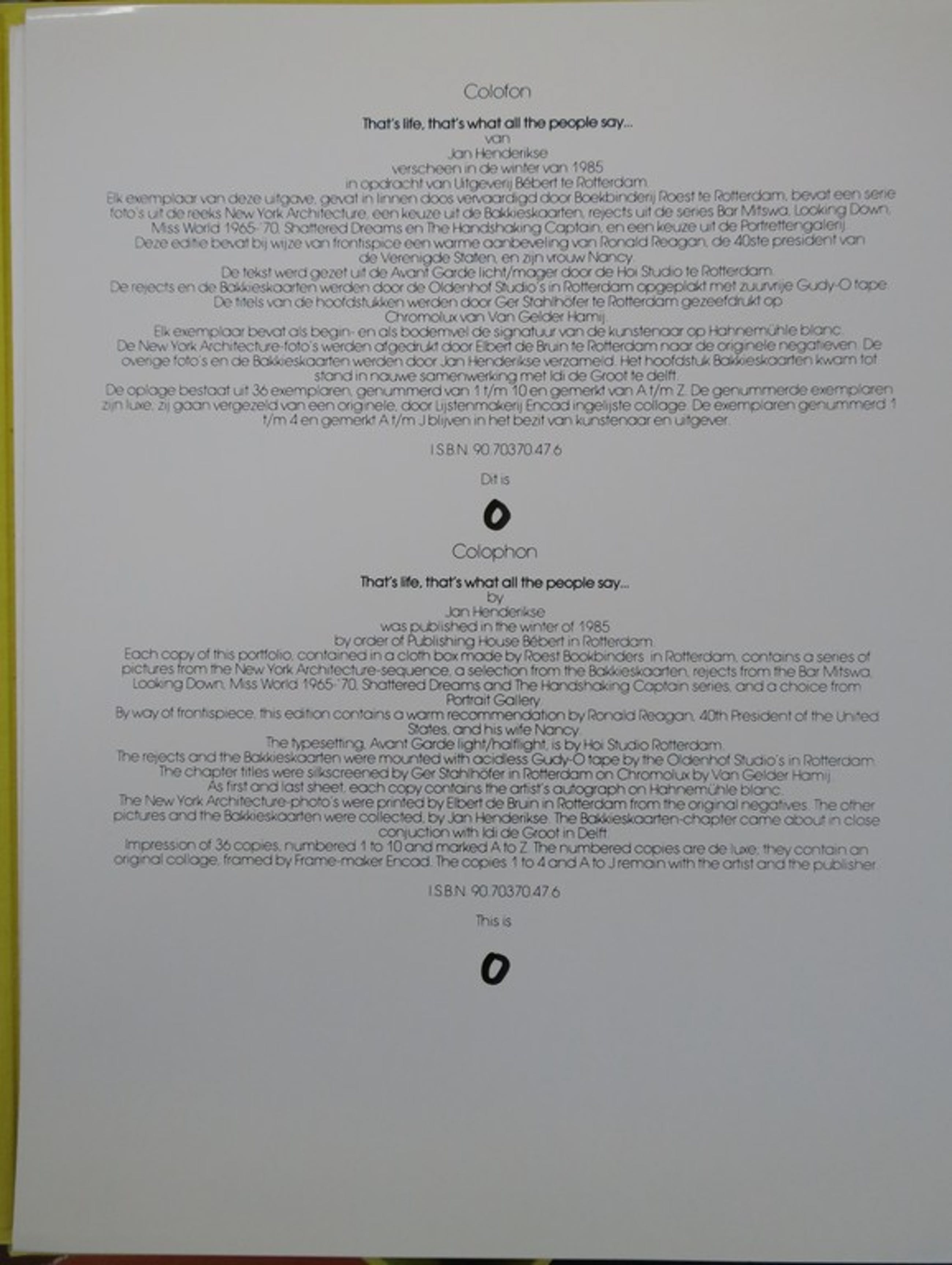 Dit is nummer O uit een oplage van A t/m Z. Het geheel is onderverdeeld in 8 series met foto’s: New York Architecture (8, alle handgeschreven gesigneerd en genummerd ‘25/36’ met potlood), Bar Mitswa (2), Looking Down (2), Miss World 1965-70 (4), Shattered Dreams (8), The Handshaking Captain (18) en Portrait Gallery (12) + 1 serie van 20 Bakkieskaarten (20). Op het eerste blad foto van Ronald en Nancy Reagan, gesigneerd met potlood door de kunstenaar. Het laatste blad is gesigneerd door de kunstenaar met potlood. Los bij dit geheel zit nog een uitnodiging voor de presentatie van het boek. Het geheel zit in bijbehorende linnen doos.