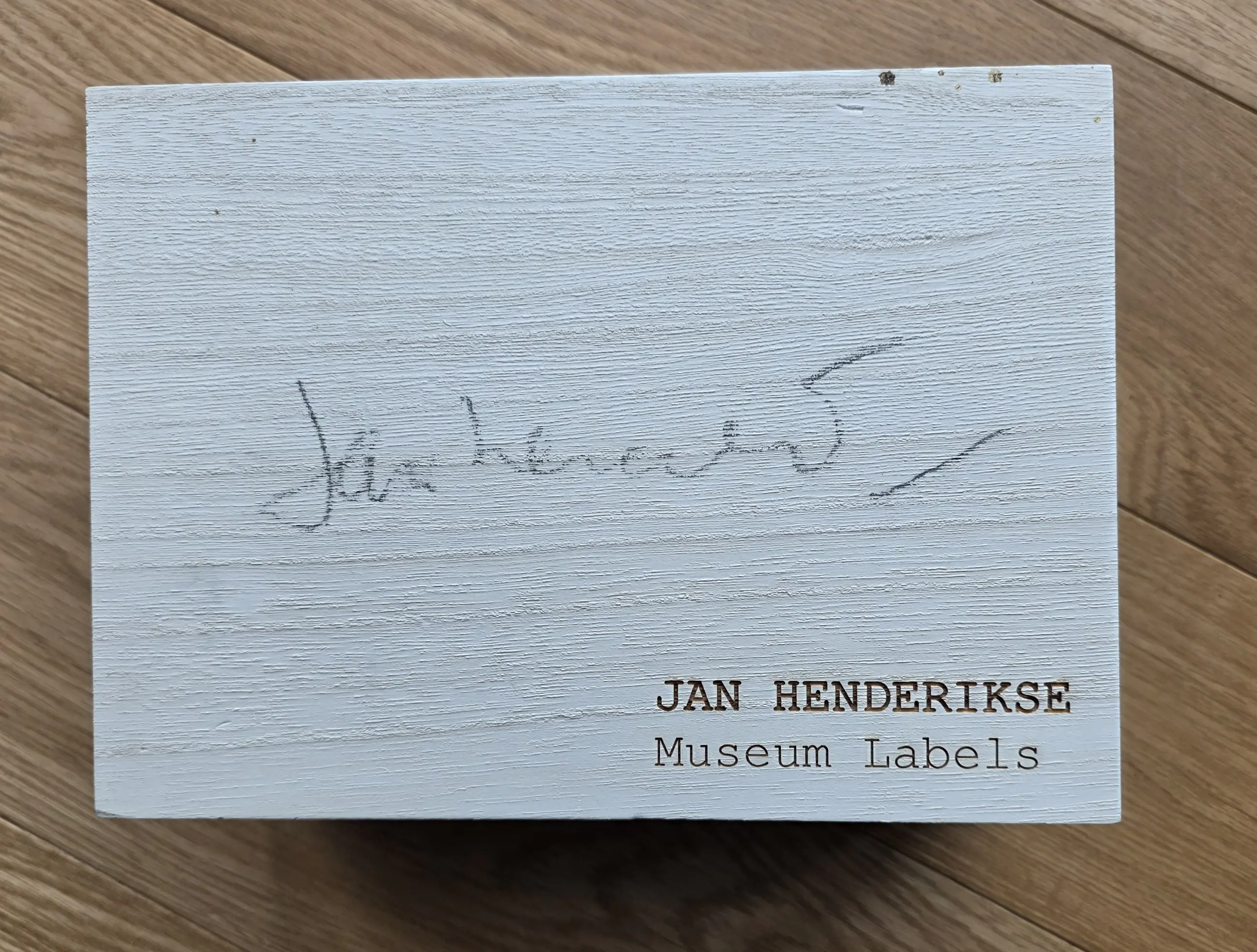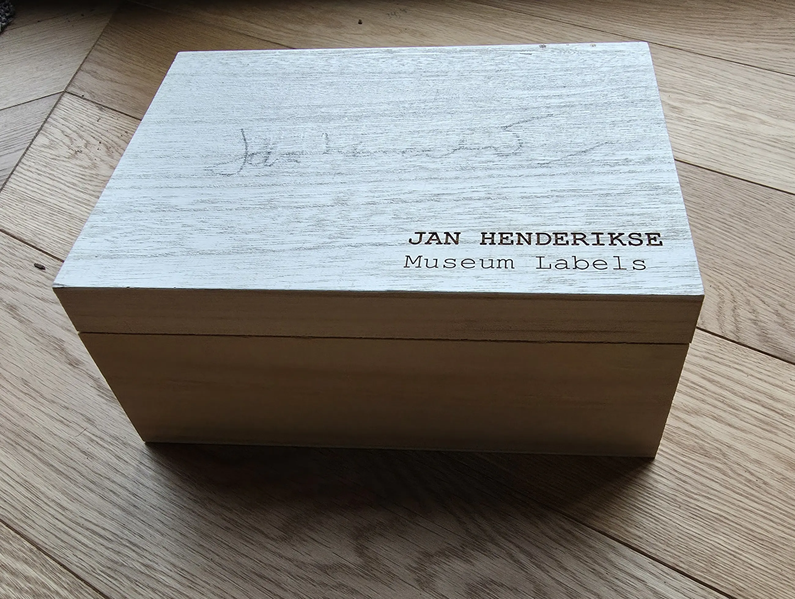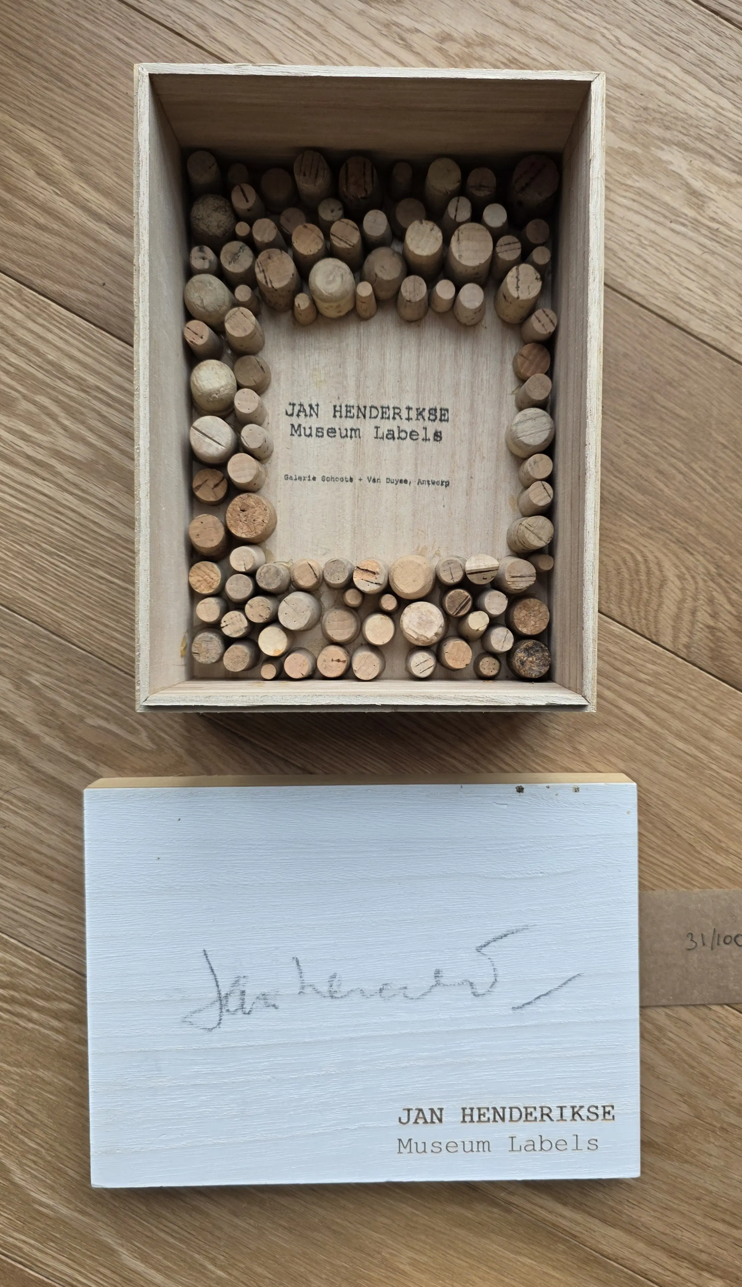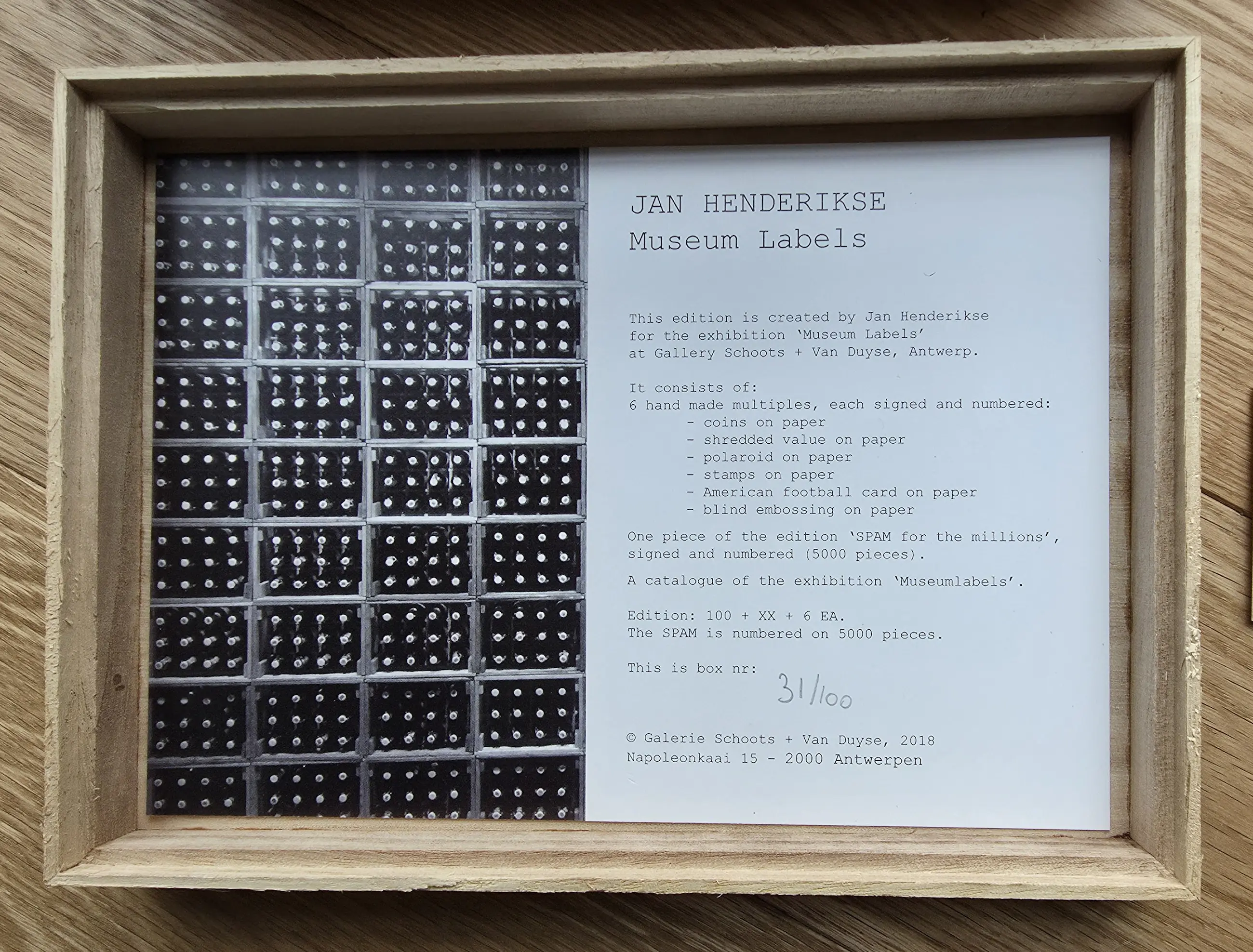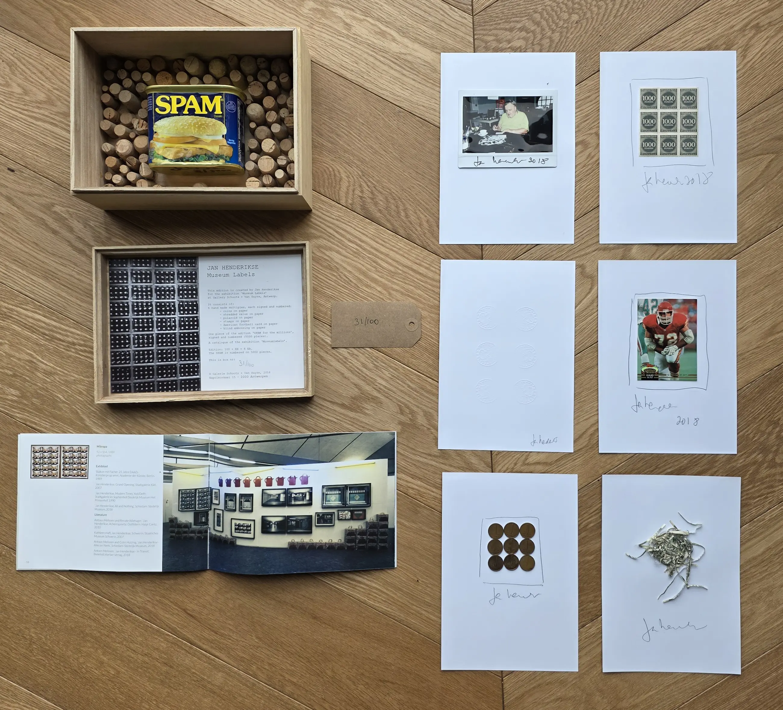 Een houten kistje met 8 unieke werken van Jan Henderikse uit 2018. Het uitgegeven kistje door galerie Schoots en van Duyse bevat 6 unieke werken op papier met formaat 21 x 15 cm. Er zijn 100 kistjes unieke kistjes uitgegeven. dit is nummer 31/100. Tevens in het kistje zelf een uniek kurkenwerk. Aan de buitenzijde is het kistje gesigneerd. In het kistje ook nog een blikje "Spam(for the Millions)". Dit heeft als nummering 8/5000. De unieke werken zijn typerende voorbeelden van werk dat Hendrikse de afgelopen decennia heeft gemaakt: "1. Centen, 2. Blinddruk van Amerikaanse munten, 3. Oost Duitse postzegels, 4. Geshredderde Dollars, 5. Honkbalplaatje en 6. een Polaroid foto van Jan in zijn atelier waar hij deze polaroids signeert. Er is een tevens een boekje in het kistje met een overzicht van het werk van Jan. Alles is netjes in het kistje opgeborgen. U heeft meteen een hele verzameling van werk van Jan Henderikse. Wordt aangetekend verstuurd of kan opgehaald worden