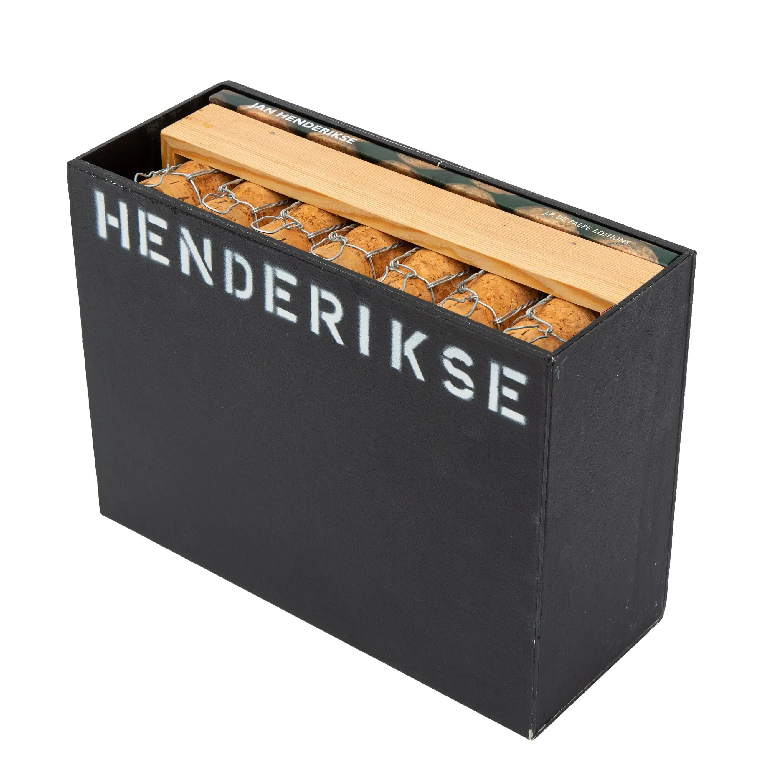 het veelvoud met Cava-kurken in een houten kist, 24x18x6 cm, gesigneerd, gedateerd en genummerd in potlood 'jan henderikse 2008 75/100' (verso), met de bijbehorende uitgave van A. Melissen en R. Wiehager 'Jan Henderikse . assemblages, installaties, ready-mades', eveneens gesigneerd en gedateerd door de kunstenaar, samen gepresenteerd in een zwarte houten cassette