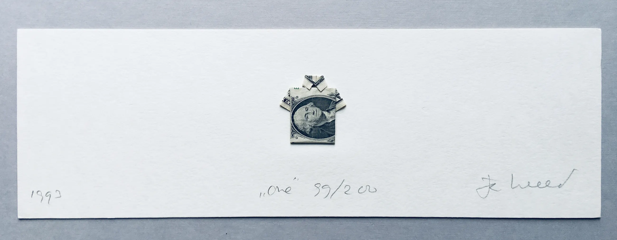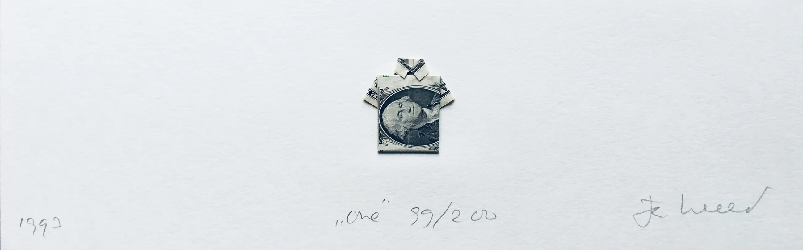 Een fraaie ‘One Dollar’ van Jan Hendrikse. Het werk is gesigneerd en betiteld, oplage 200 ex. Ieder Dollar biljet is uniek.