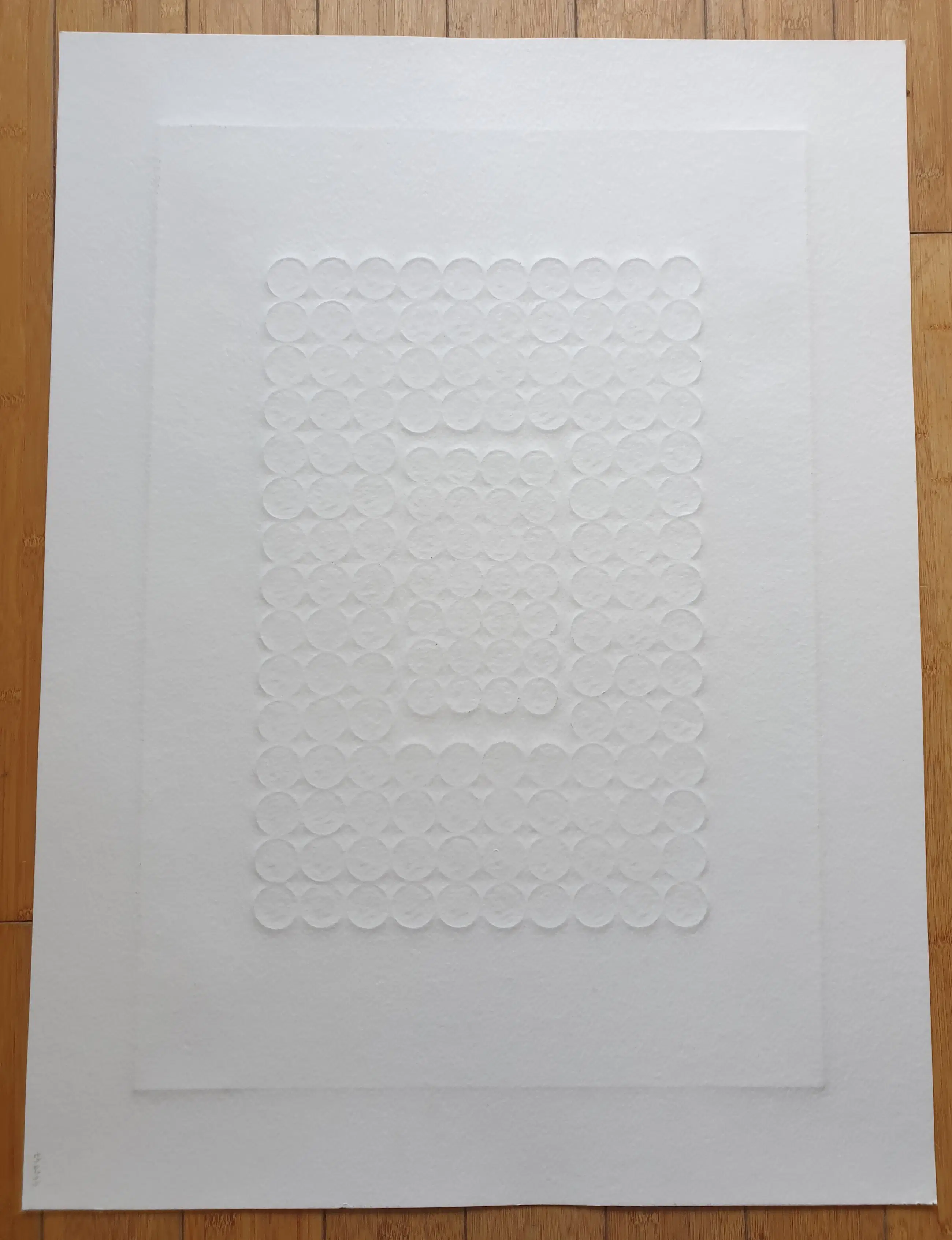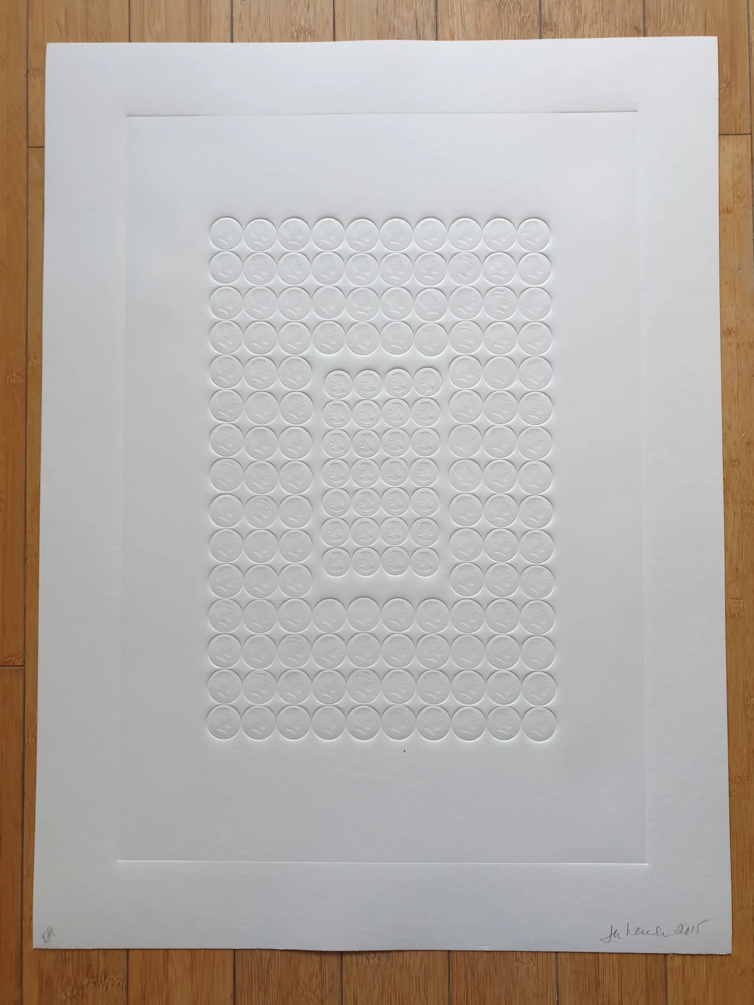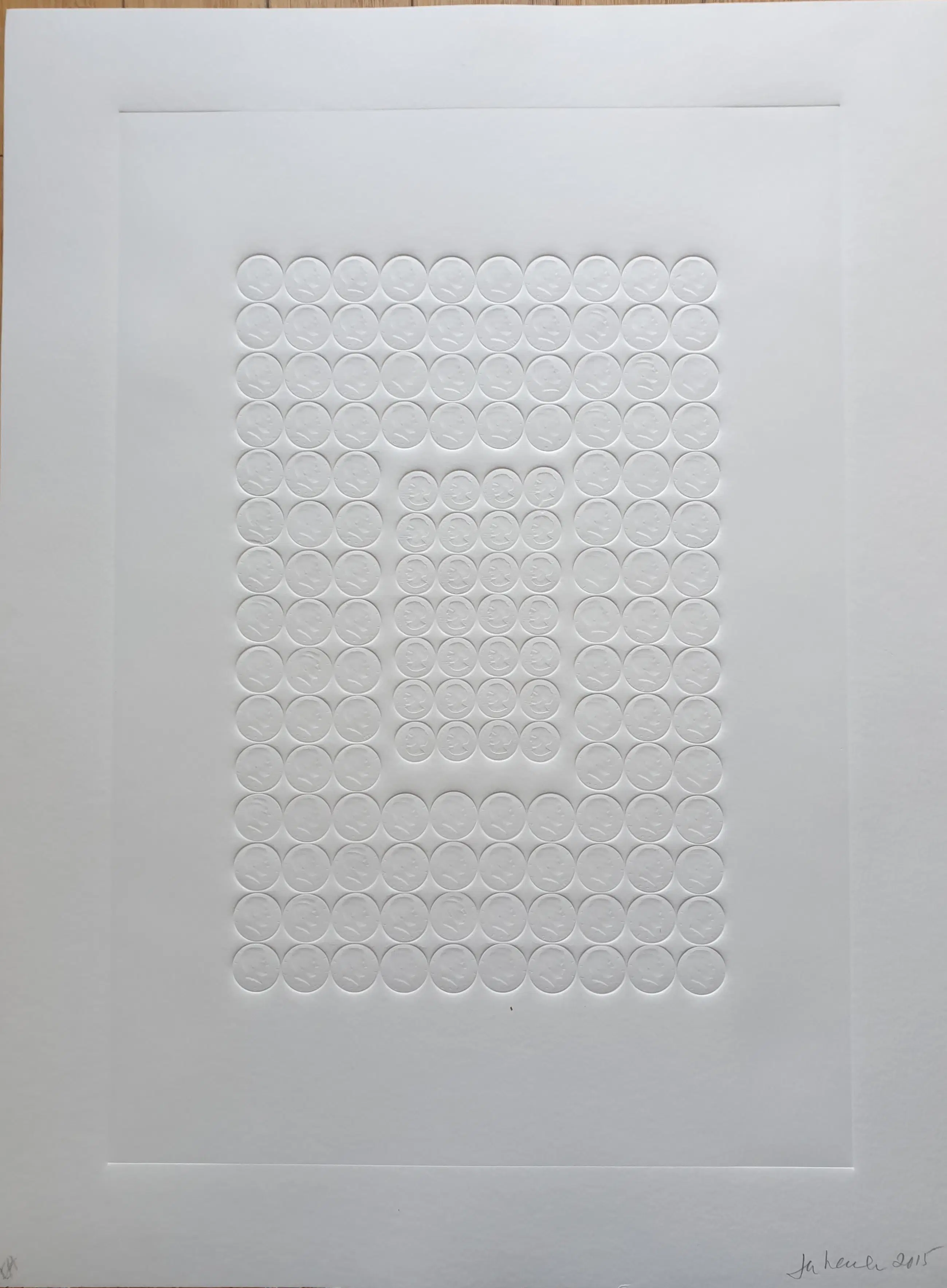 Grote Blind/ Preegdruk op (Bütten) papier van Jan Henderikse (1937) uit 2015. Het werk met formaat 80 x 60 cm heeft als titel "Susie & John". Het werk is afgebeeld in de catalogus "Zero to Infinity" op pagina 47. U krijgt de catalogus (in Duitse taal) er bij cadeau. Afhalen is gewenst. Of brengen. Het formaat is wat onhandig om te versturen. Oprollen kan niet en plat is wat groot. In overleg.