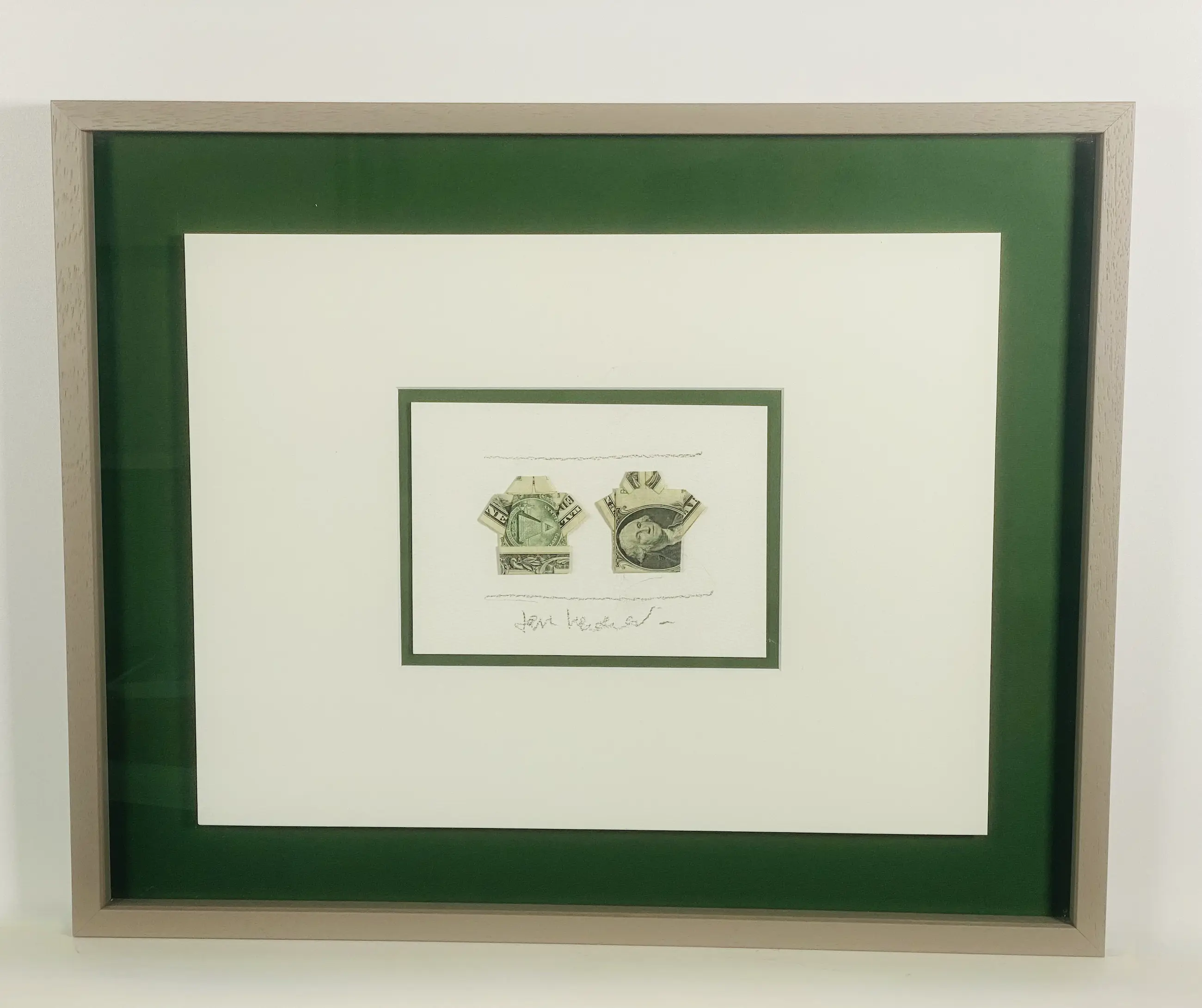 UNIEK WERK : Tekening in potlood met twee gevouwen one-$-biljetten,