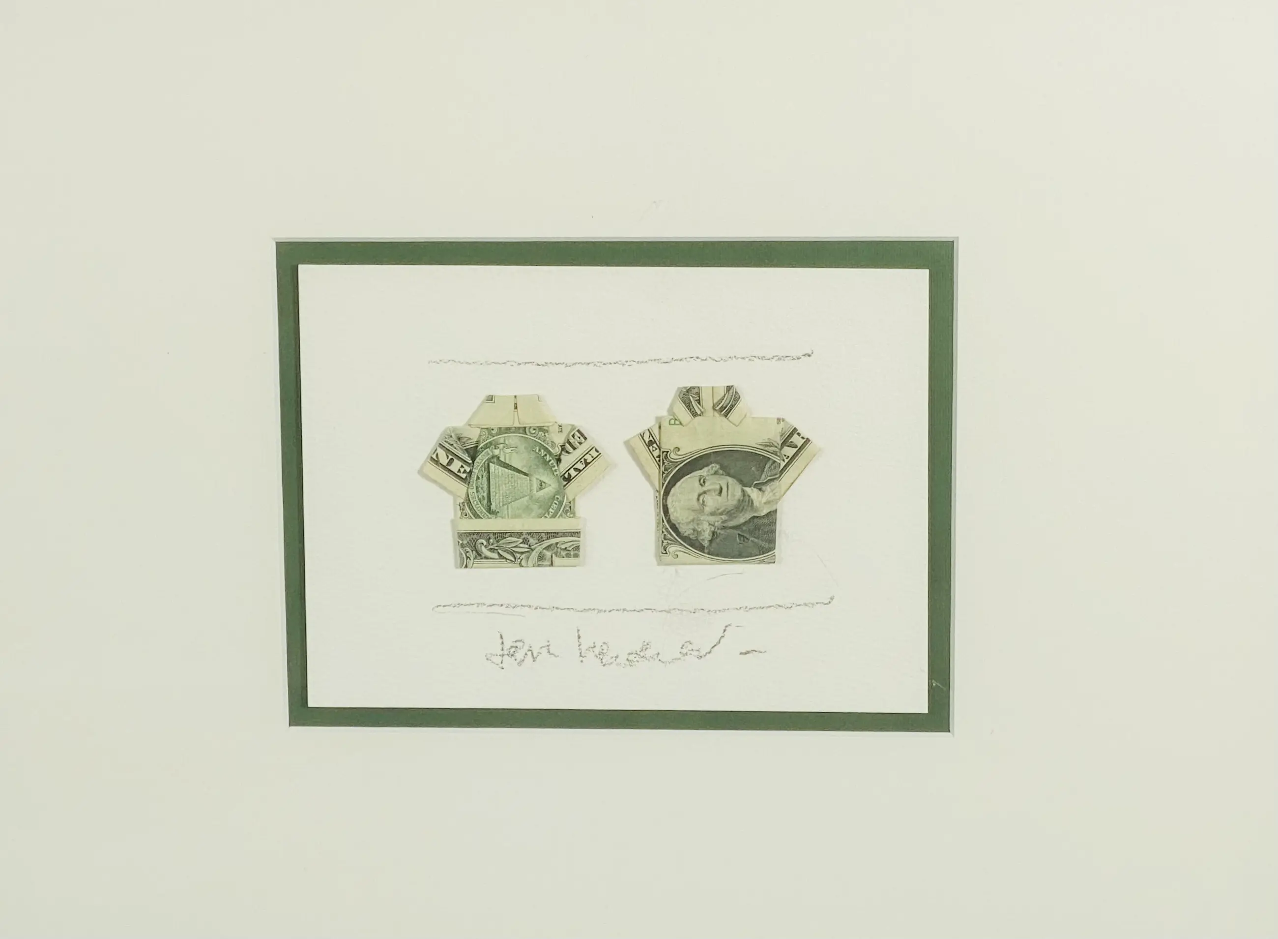 Tekening in potlood, met twee gevouwen one-$-biljetten, op stevig papier