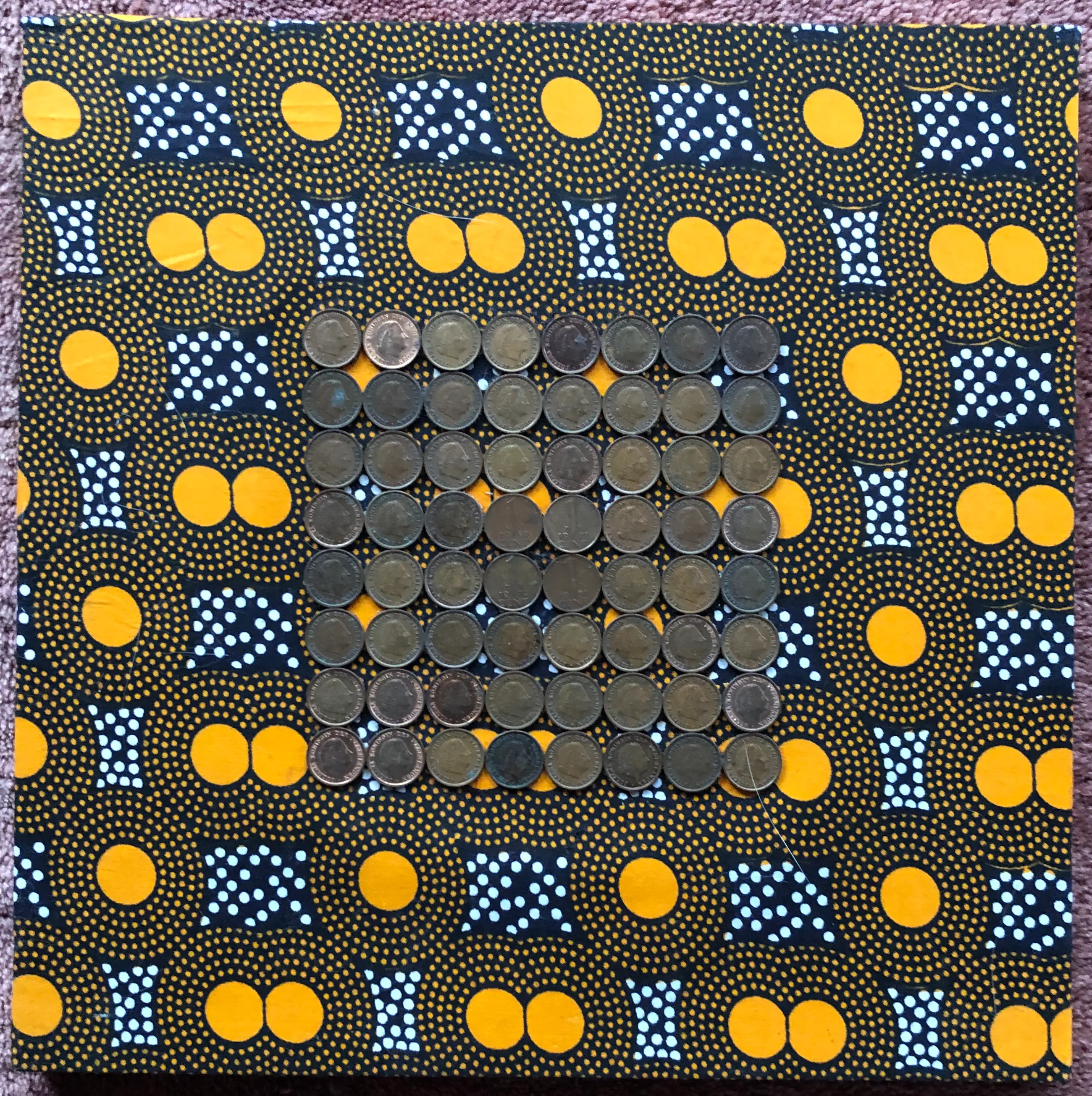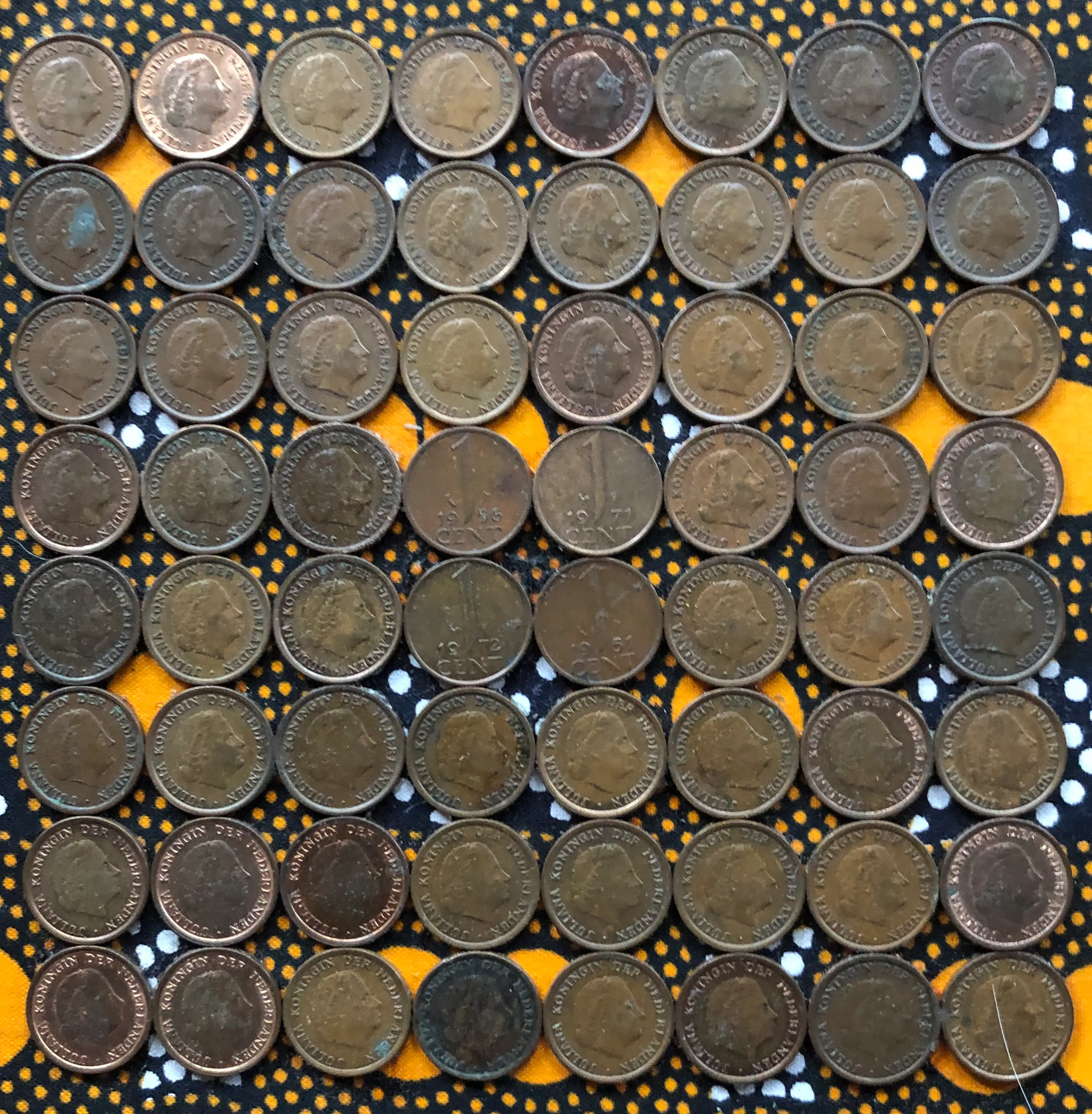 Een typerend werk van conceptueel kunstenaar Jan Hendrikse uit 2012. Het werk bestaat uit een houten plank waarop textiel is aangebracht. Daarop zijn vierenzestig muntjes van één cent geplaatst.