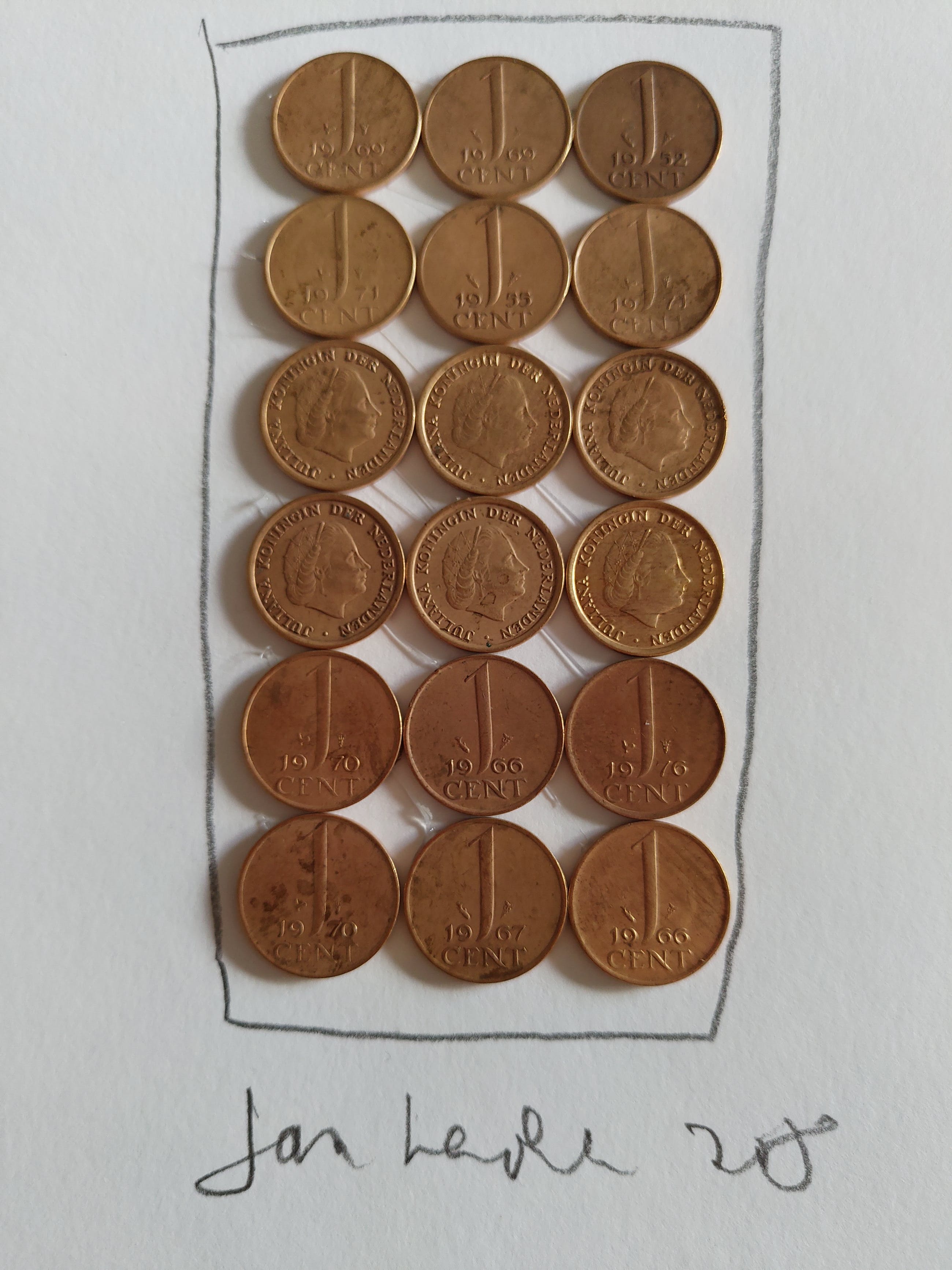 18 centen op een op passe-partout karton gelijmd. Met potlood omkaderd en vervolgens gesigneerd en gedateerd door de kunstenaar. Geheel volgens de ideologie van de Nul-groep. In oplage van 200 gemaakt, maar elke keer anders, dus uniek.