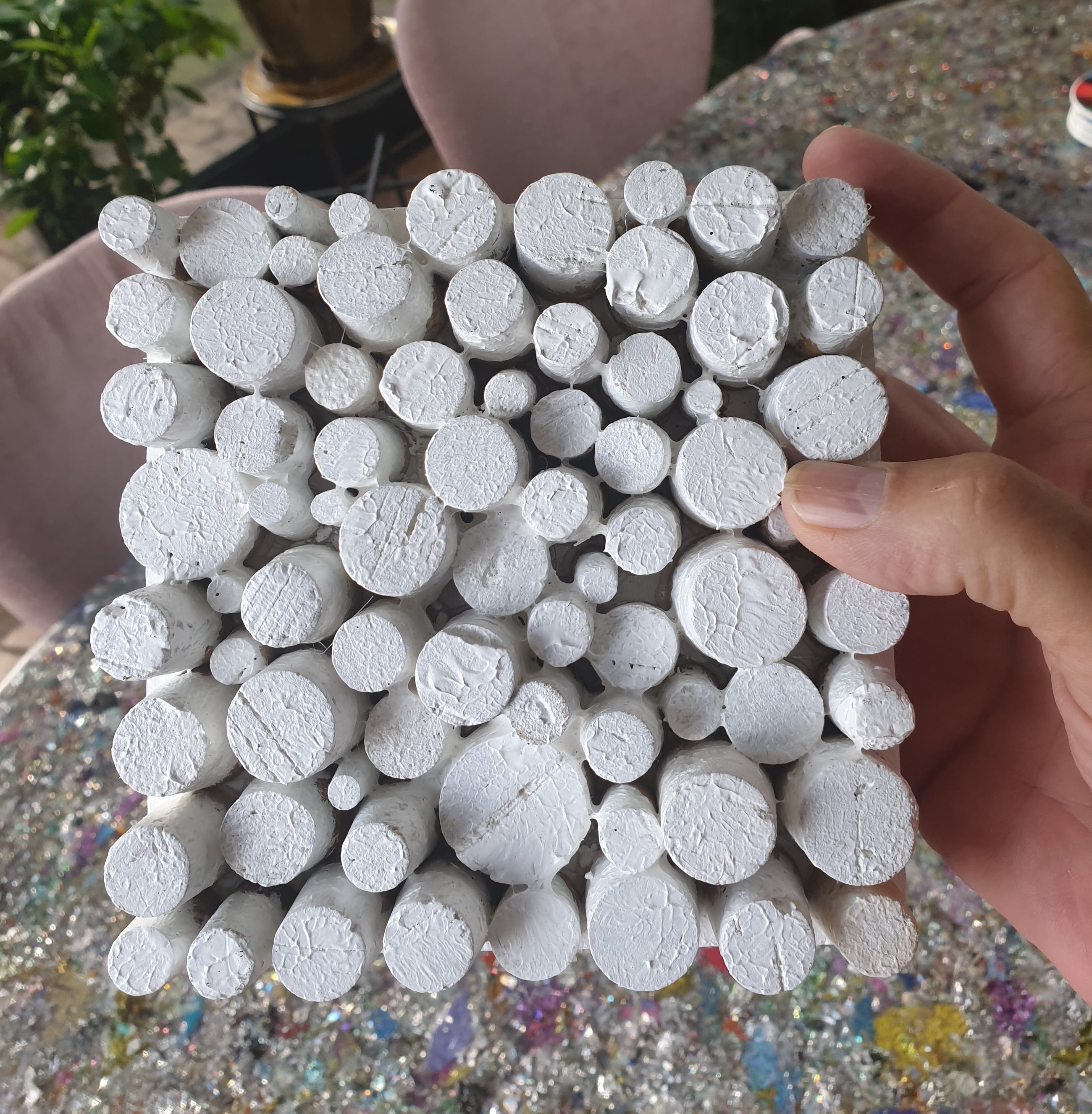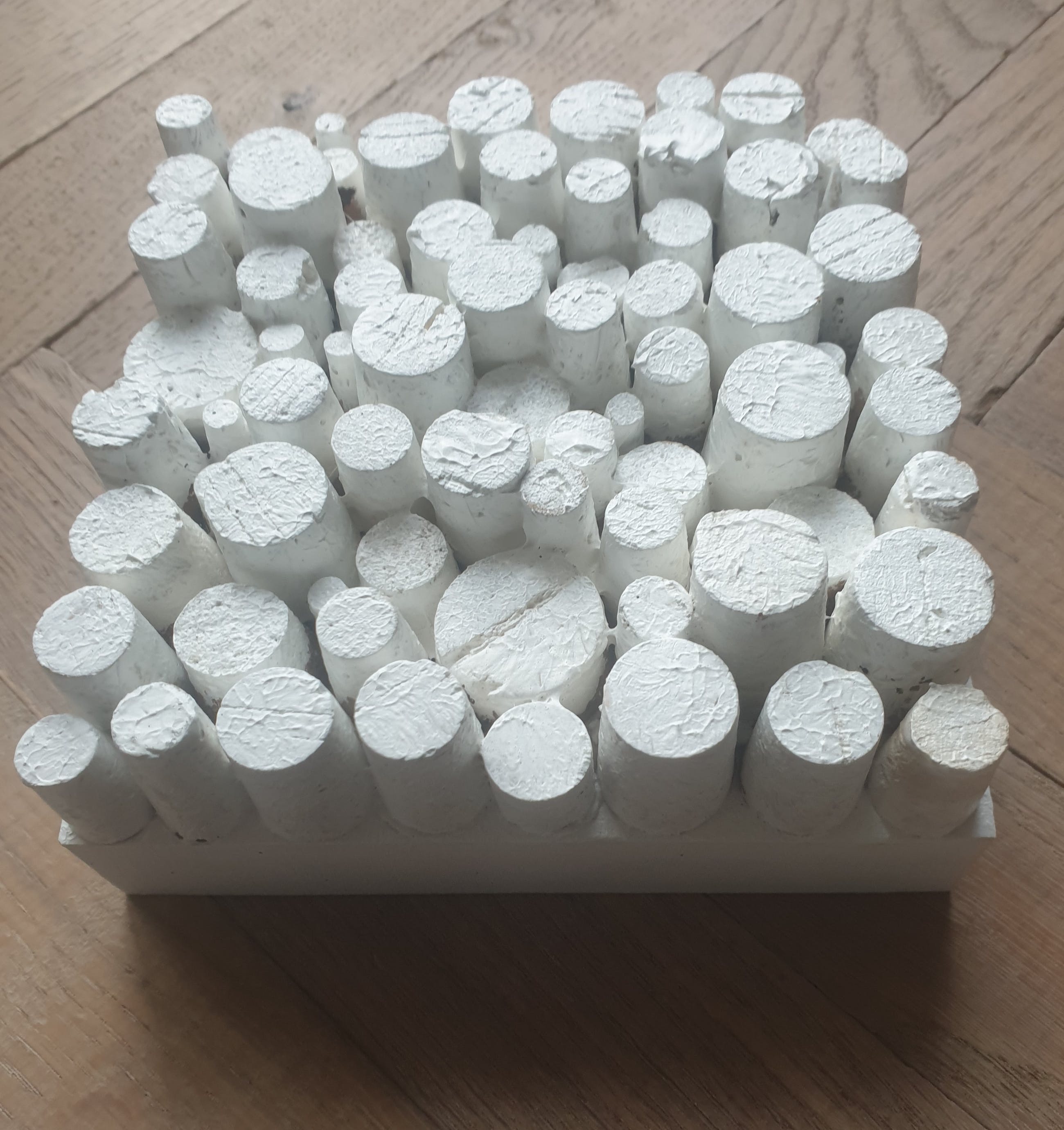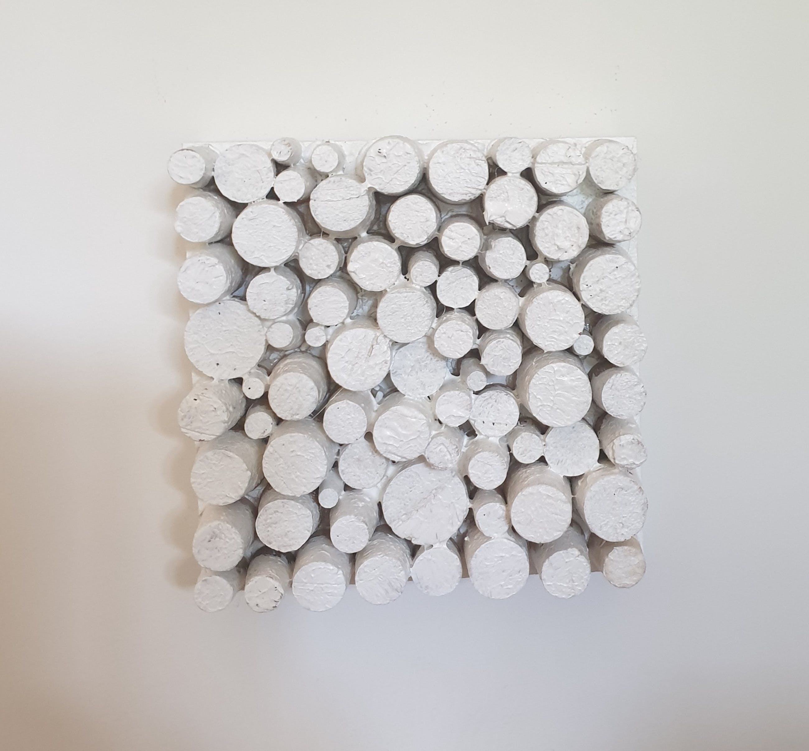 Van ZERO kunstenaar Jan Henderikse een wit geschilderd houten relief met laboratorium kurken. Het werk meet 15 x 15 x 6 cm. Aan de achterzijde is het werk gesigneerd, getiteld "White IV" en gedateerd 2017. Tevens heeft hij de maatvoering daar omschreven.