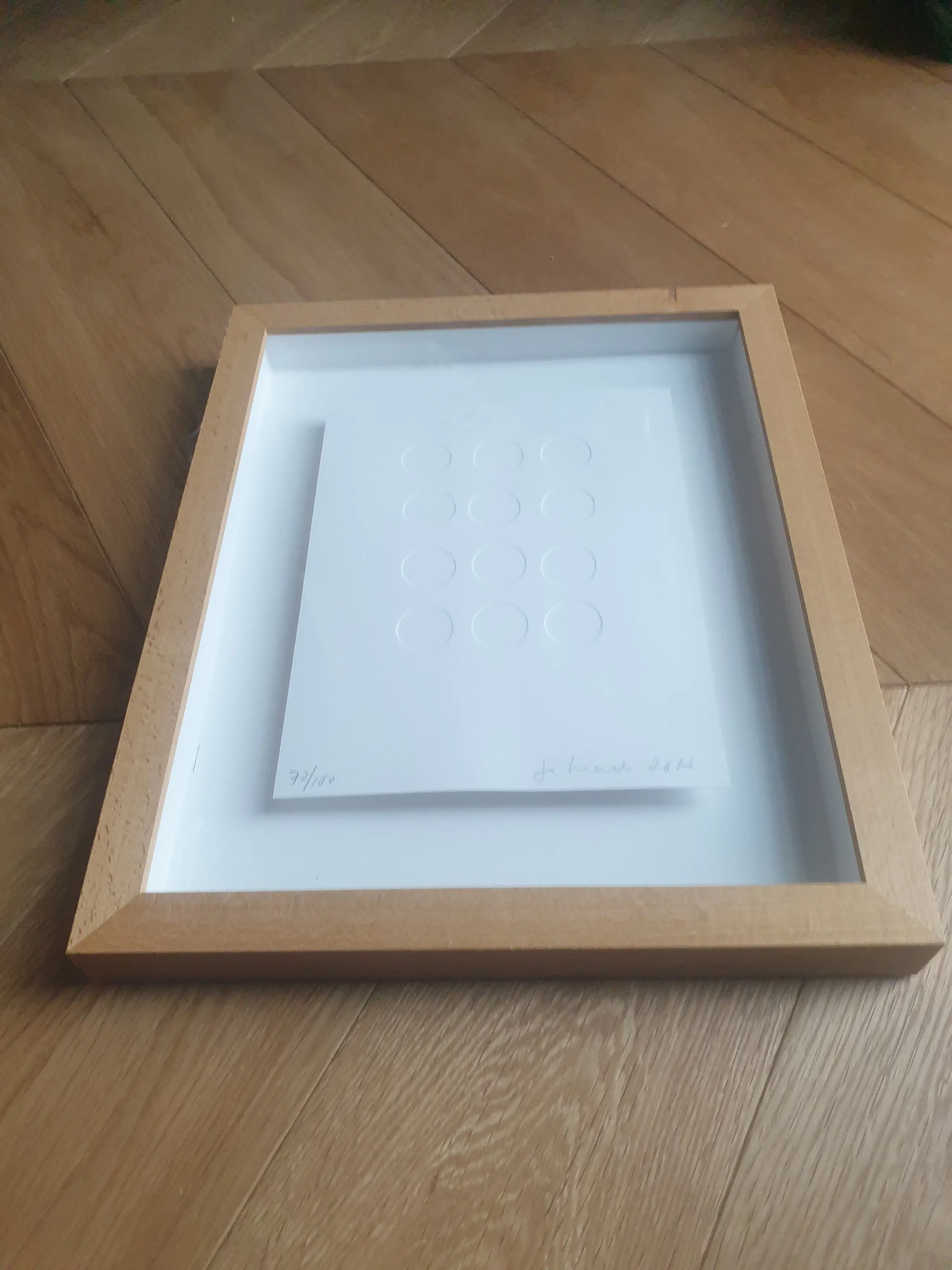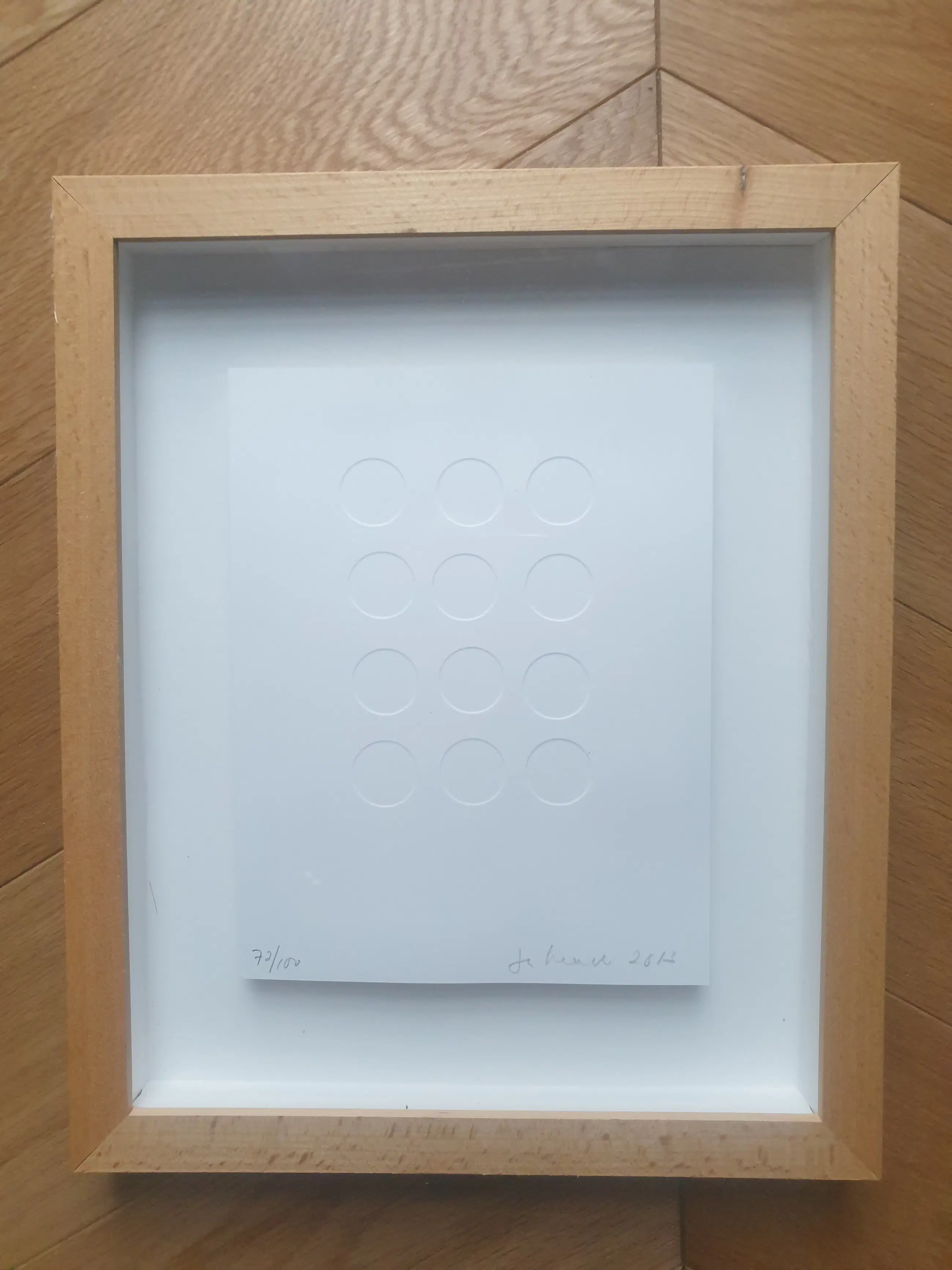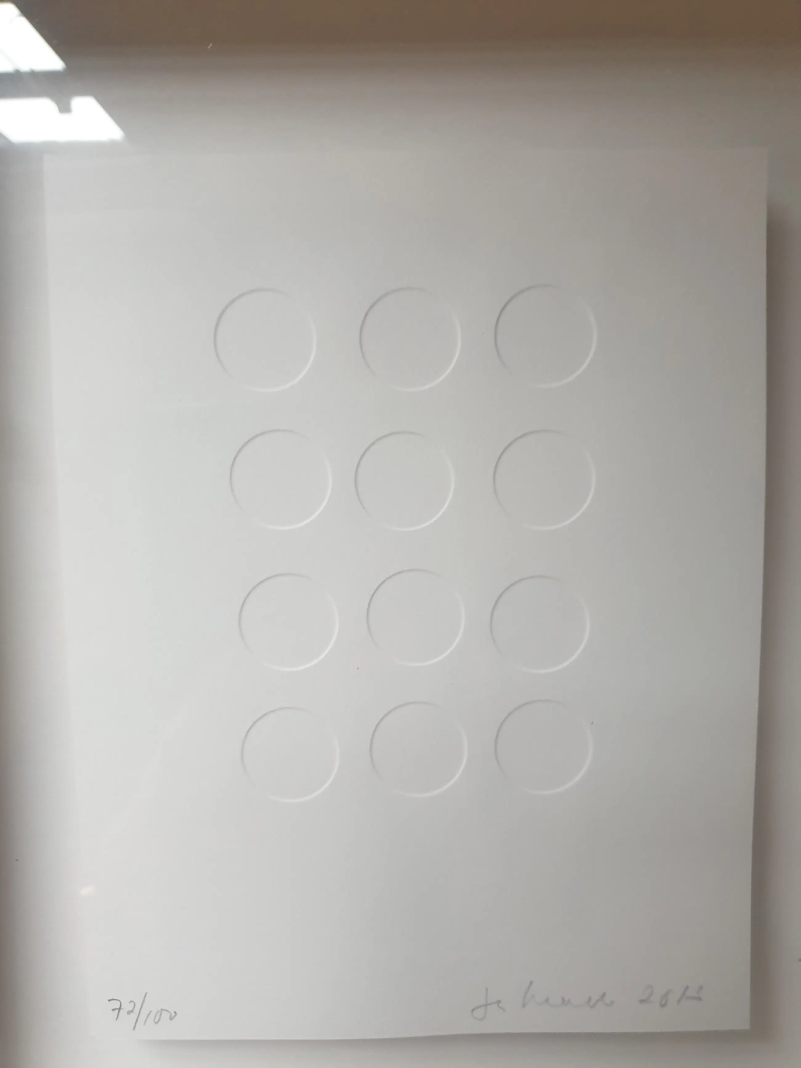 Van Zero kunstenaar Jan Henderikse (1937)Blinddruk / Preegdruk van centen op papier. Numer 72/100. Formaat inclusief baklijstje 34 x 27 cm. Zero werk. Het werk is gesigneerd, genummerd 72/100 en gedateerd 2013.