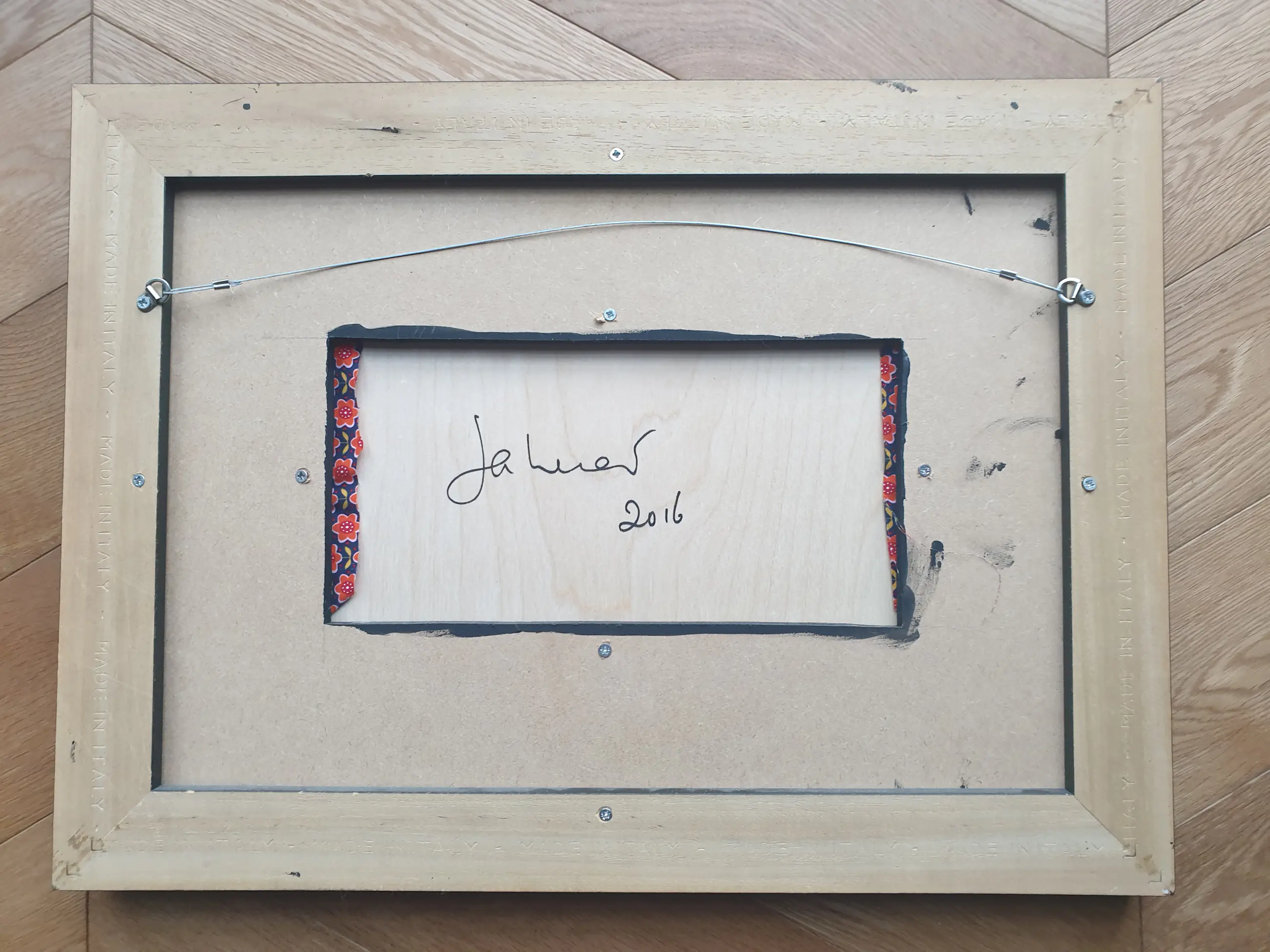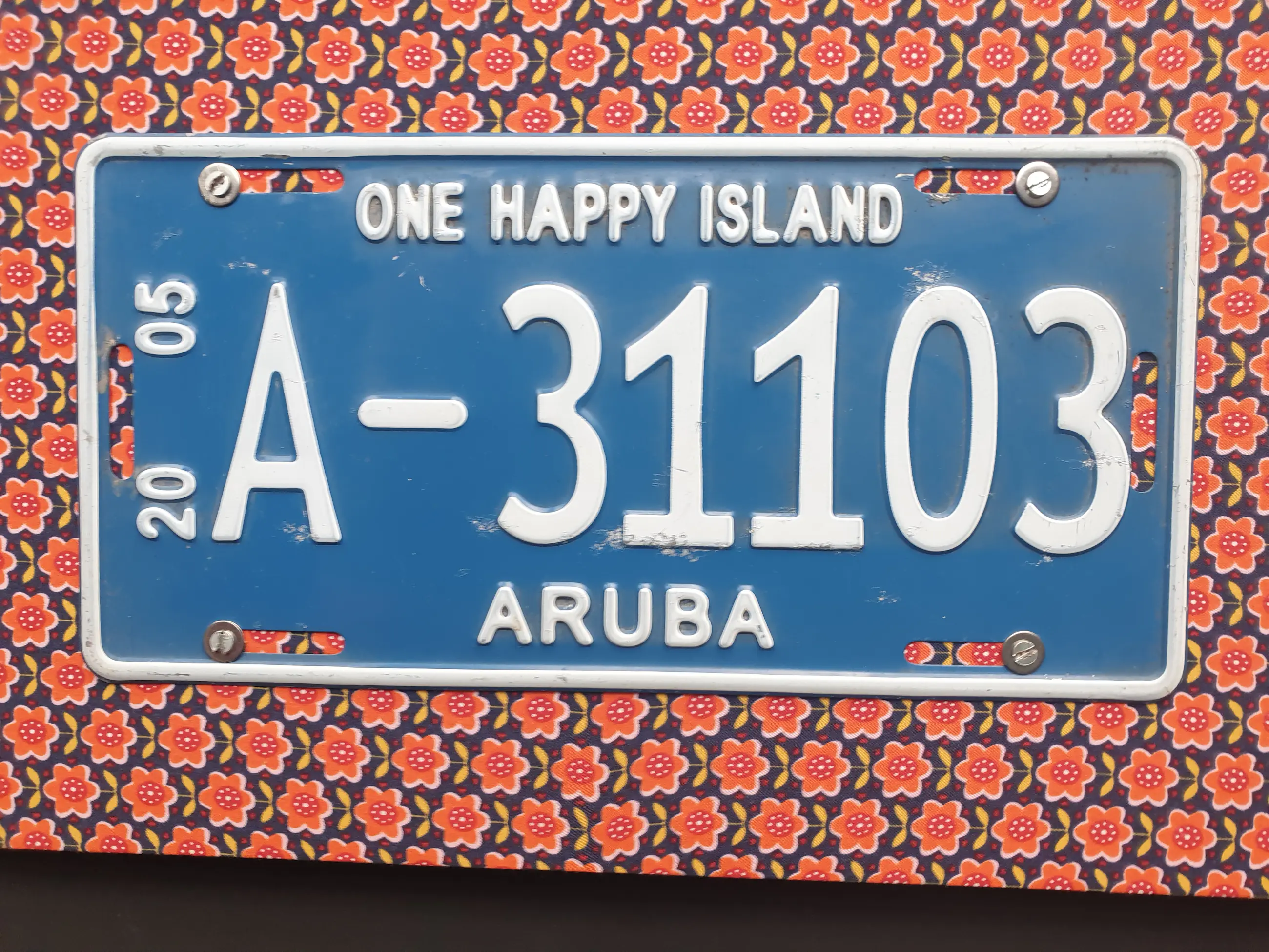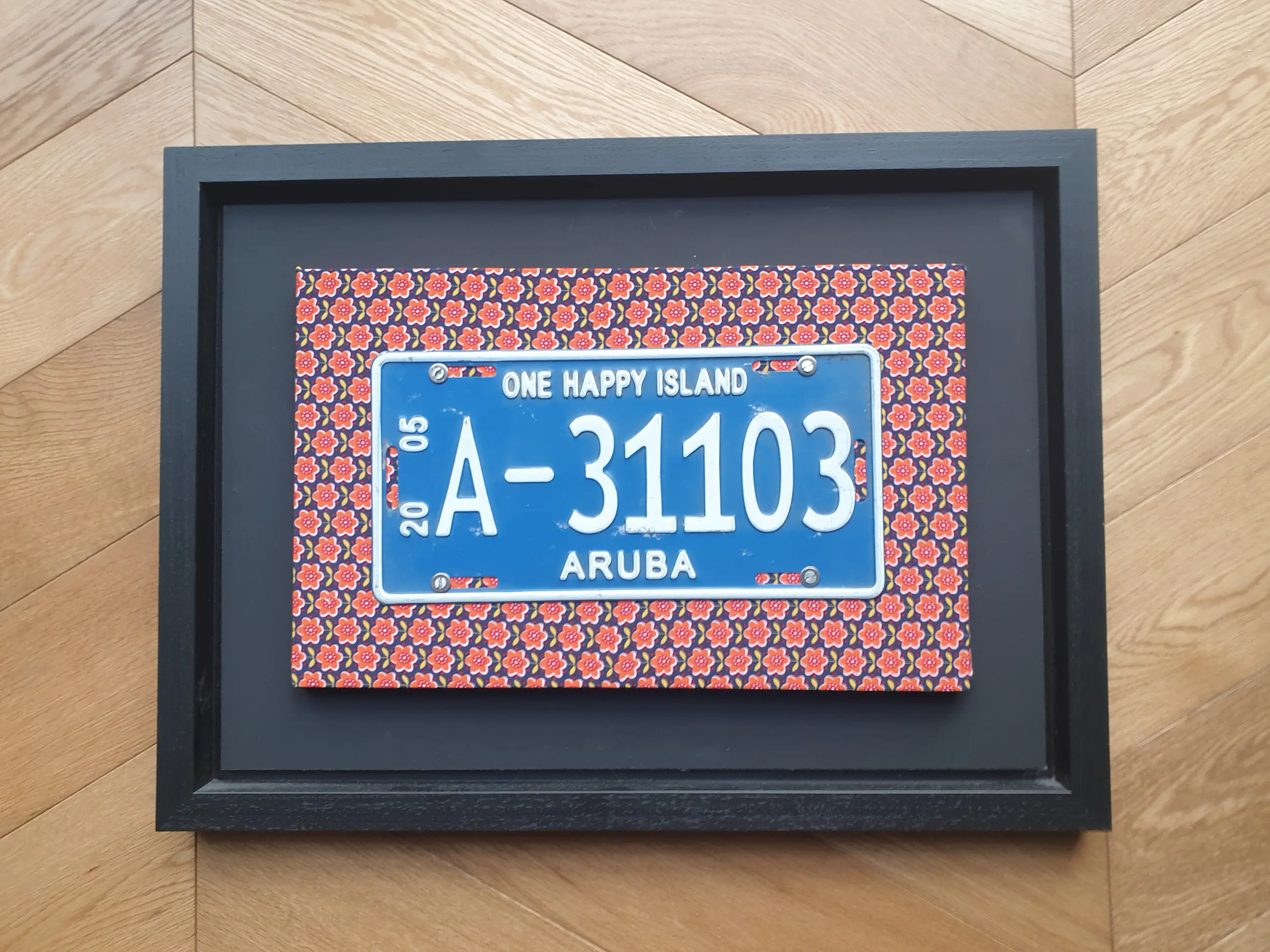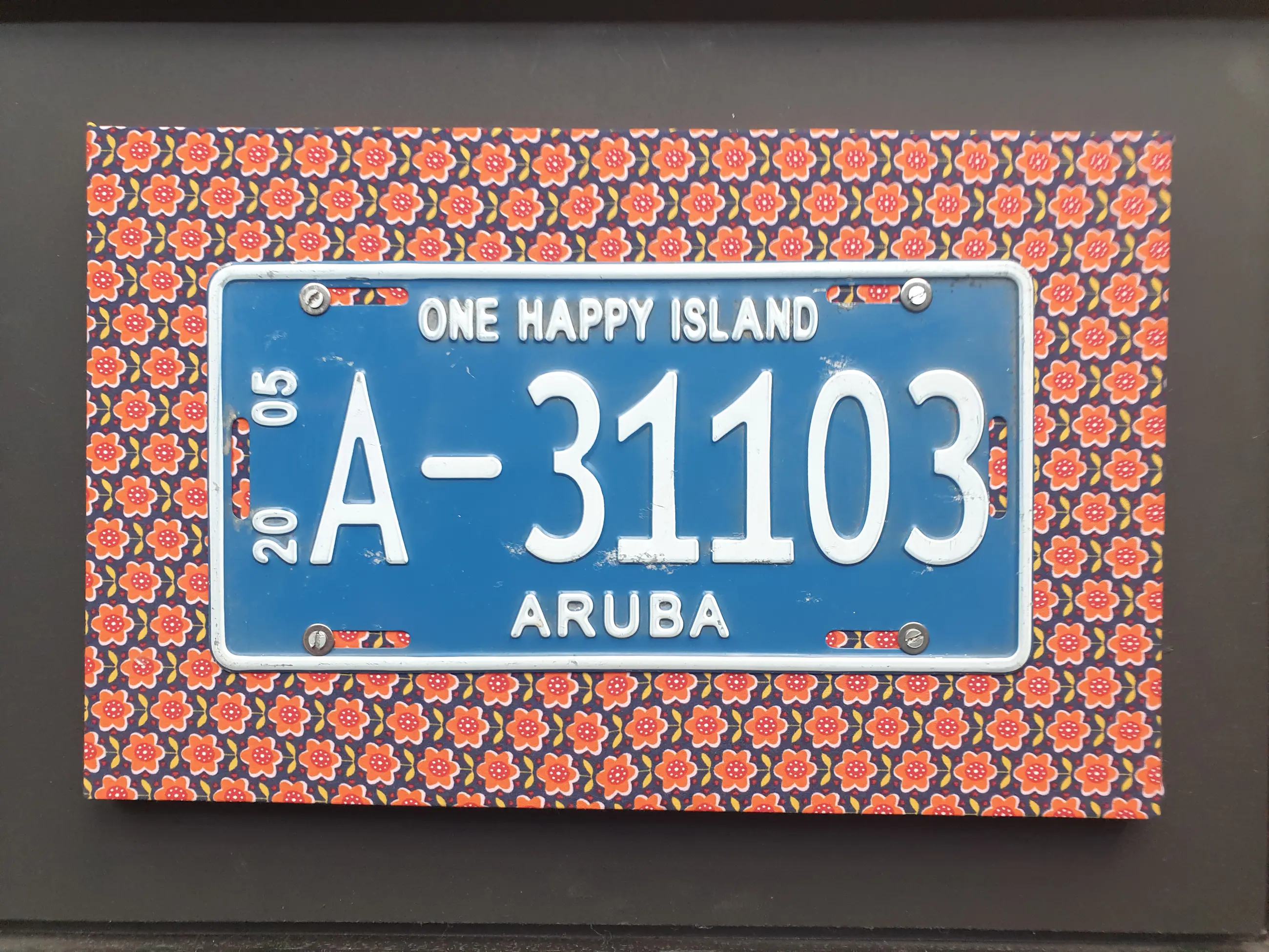 Van Zero kunstenaar Jan Henderikse (1937) Een relief van een blauw nummerbord van Bonaire op bloemetjesstof op paneel. Het werk is in een zwarte baklijst ingelijst en op de achterzijde gesigneerd en gedateerd 2016. Rechtstreeks uit het Antwerpse atelier van Jan Henderikse verkregen.