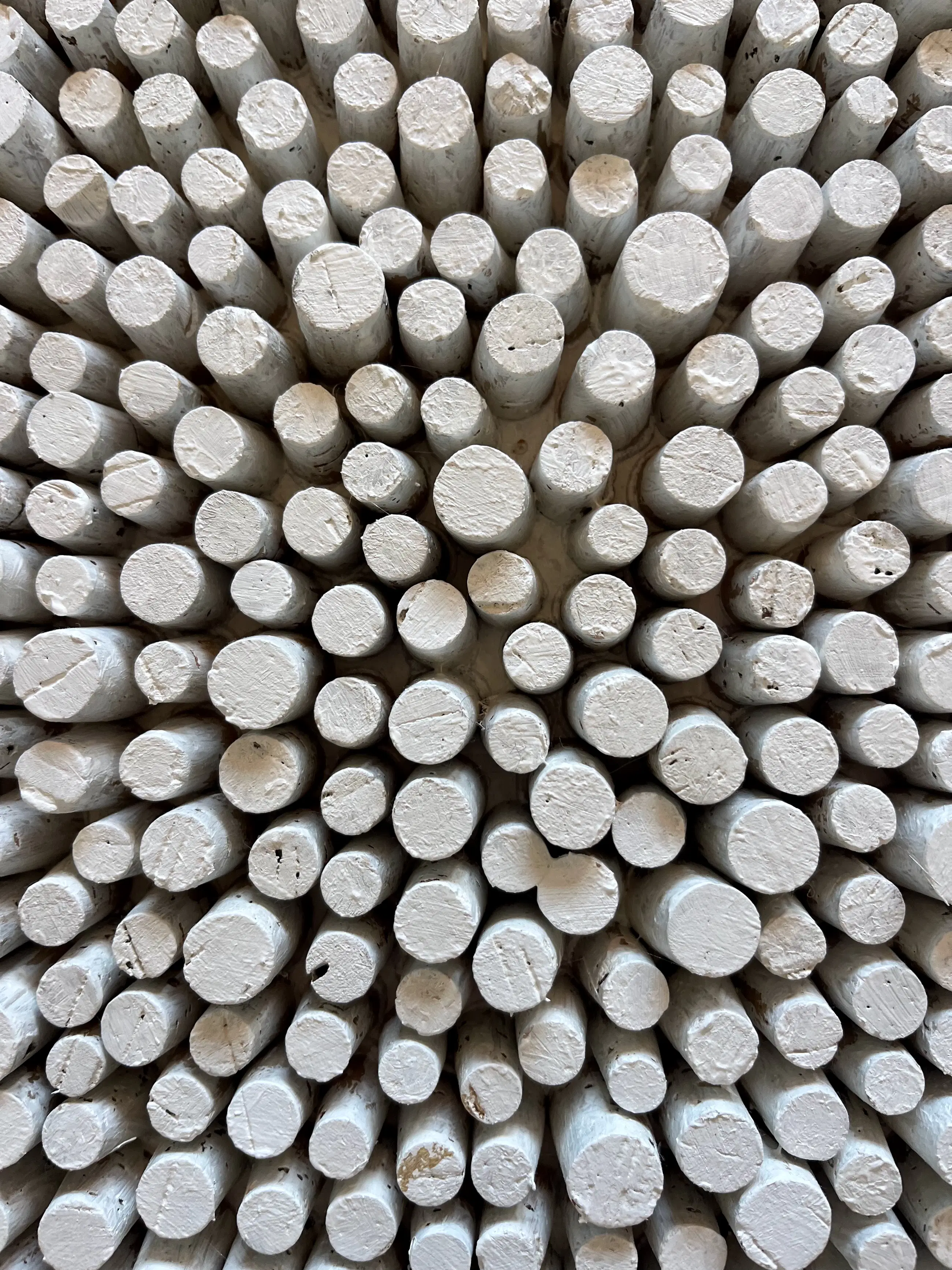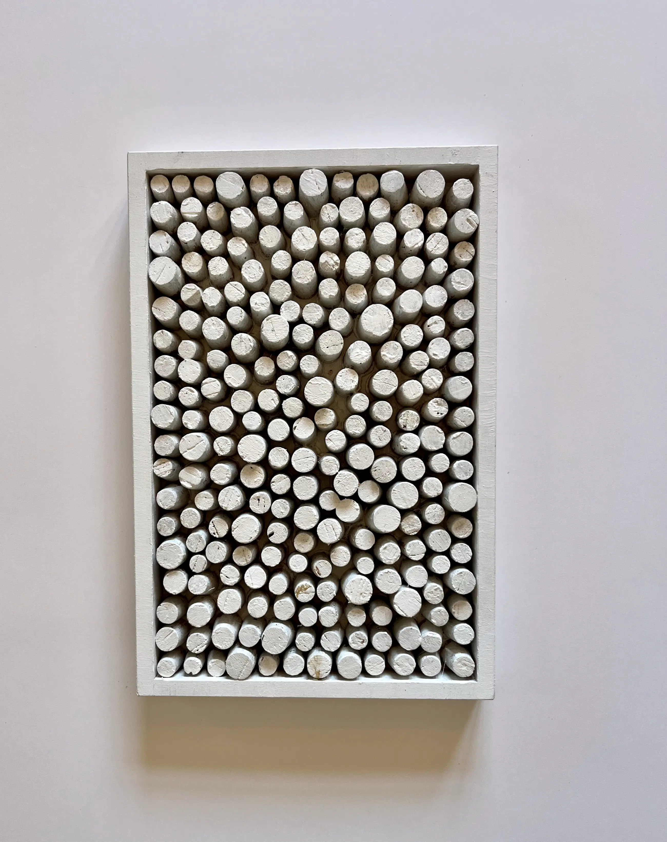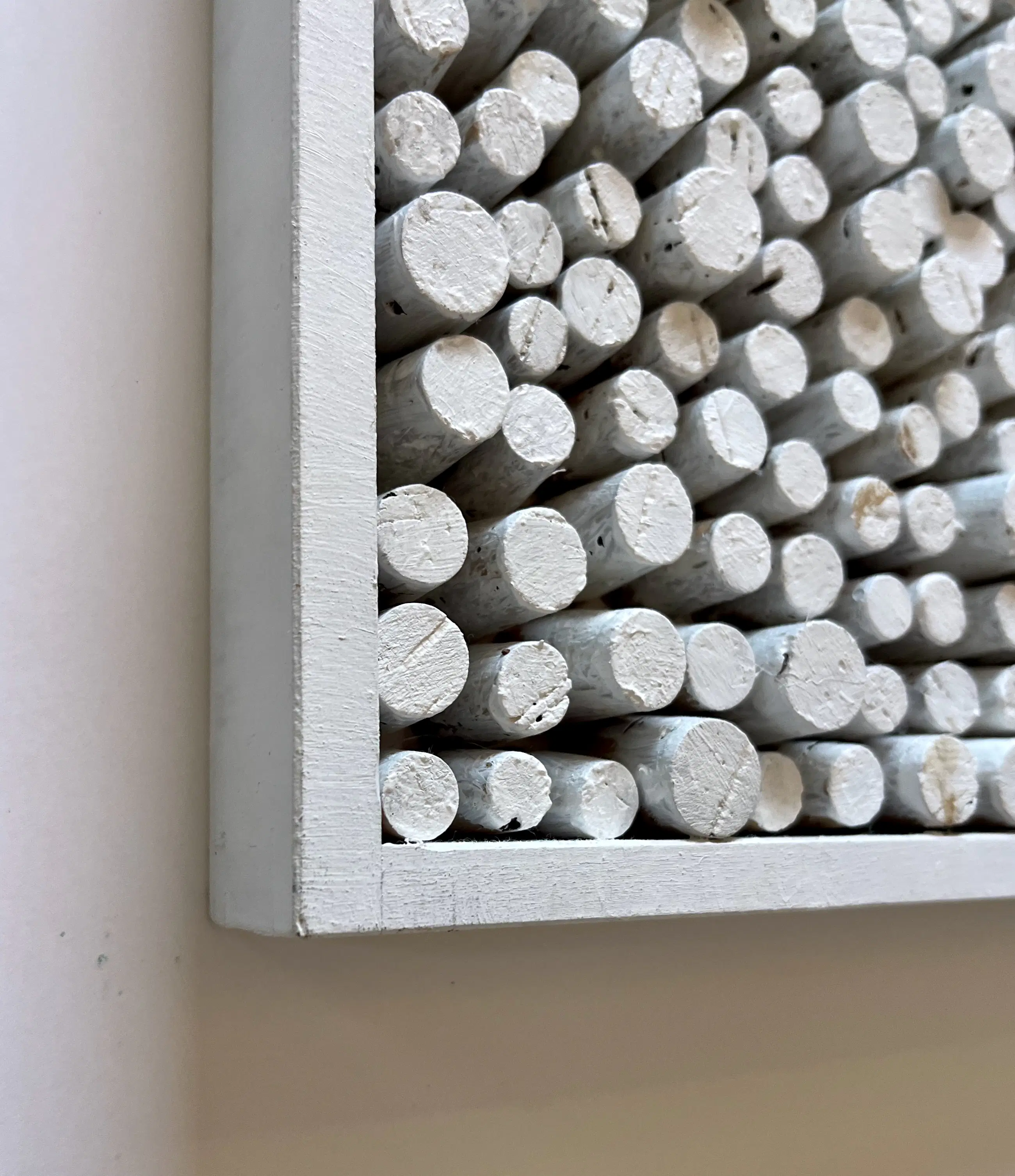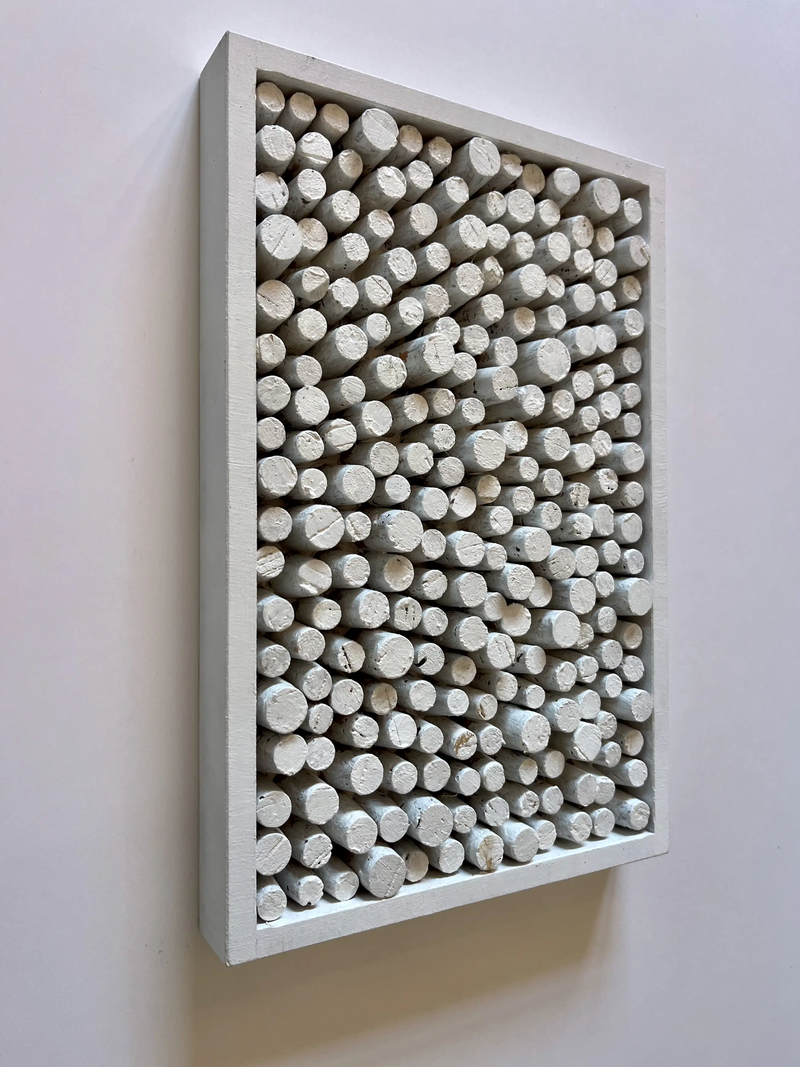 Techniek: assemblage van kurk in rechthoekige houten kist met witte acrylverf afgewerkt.