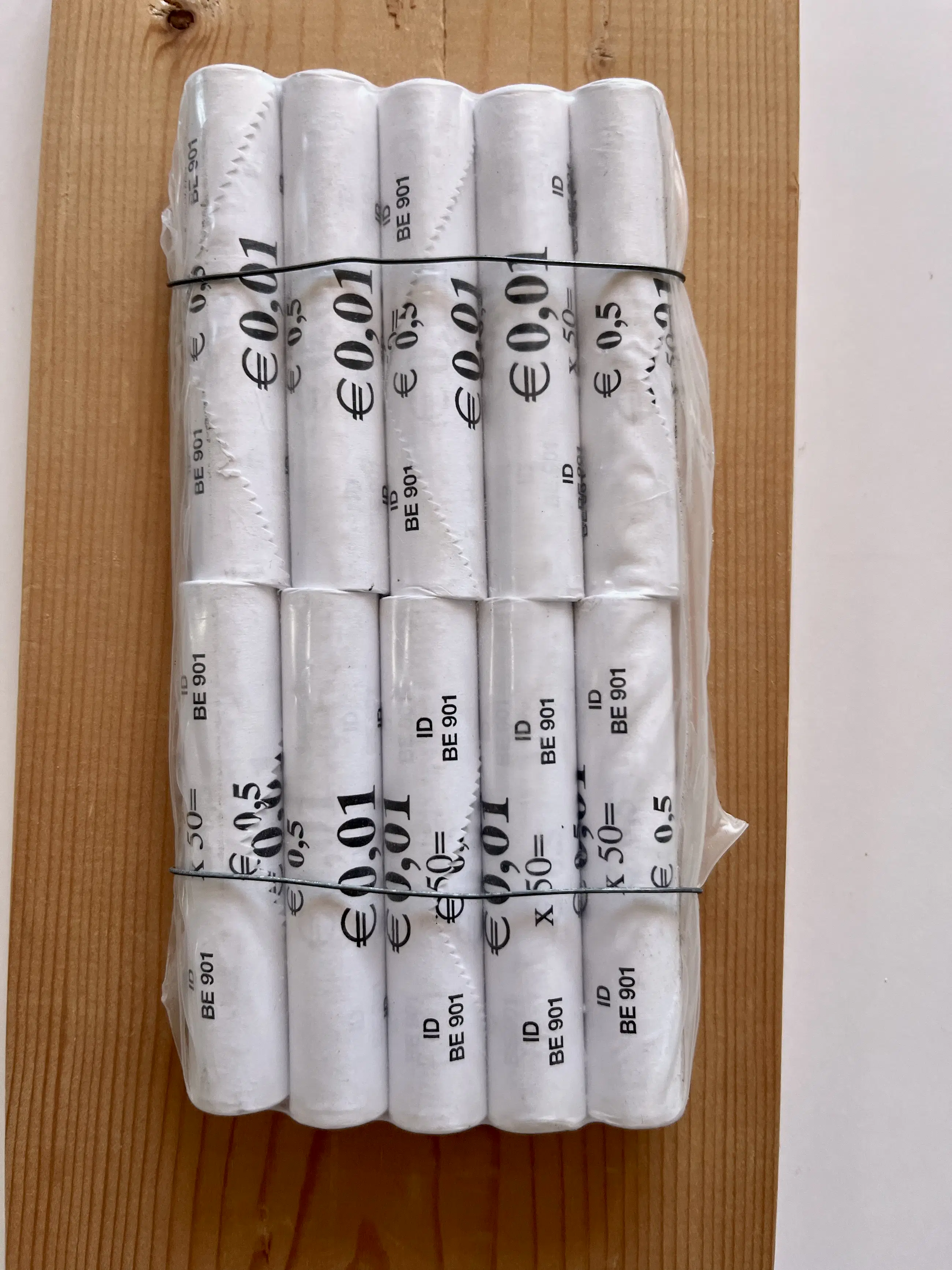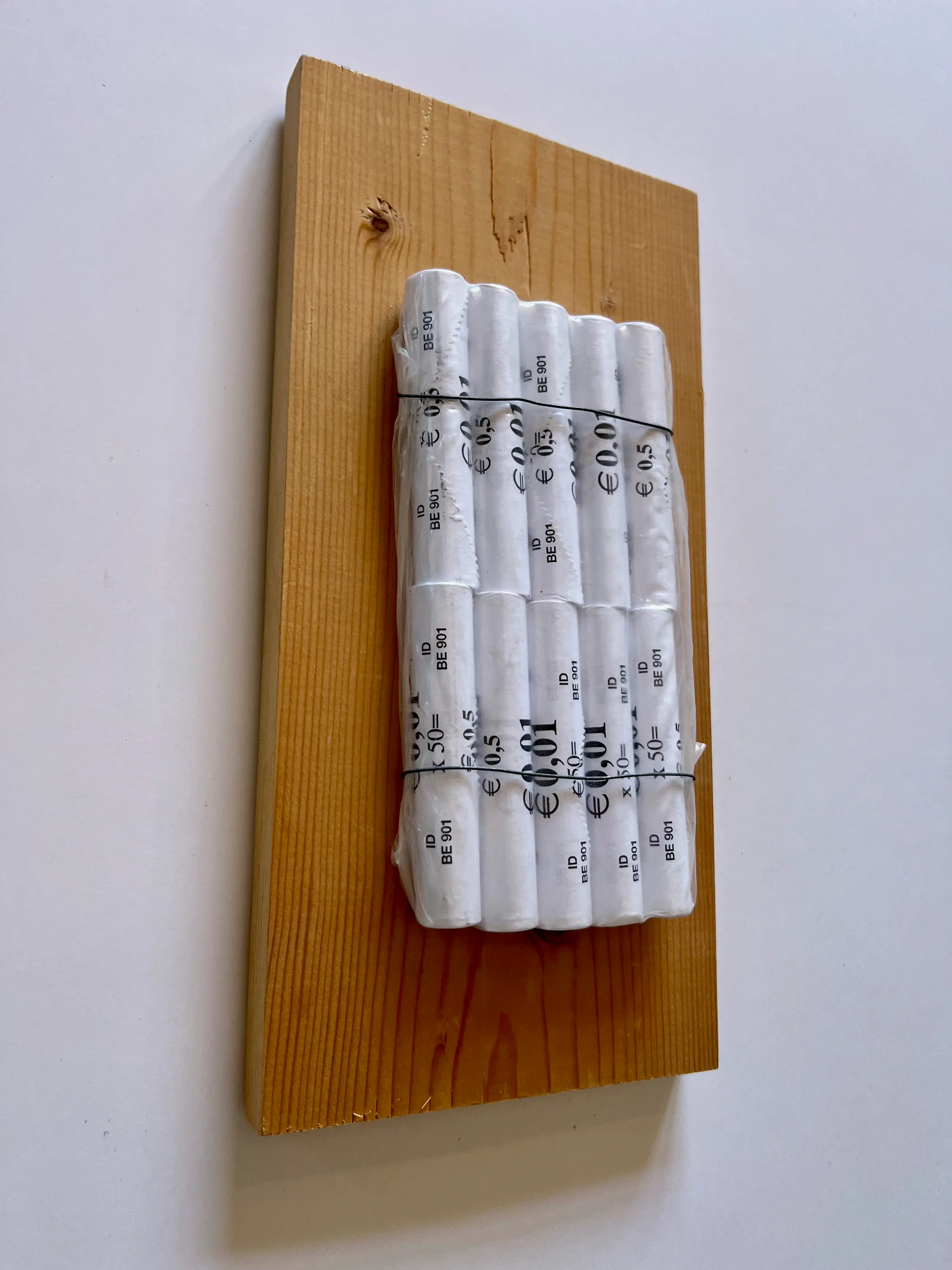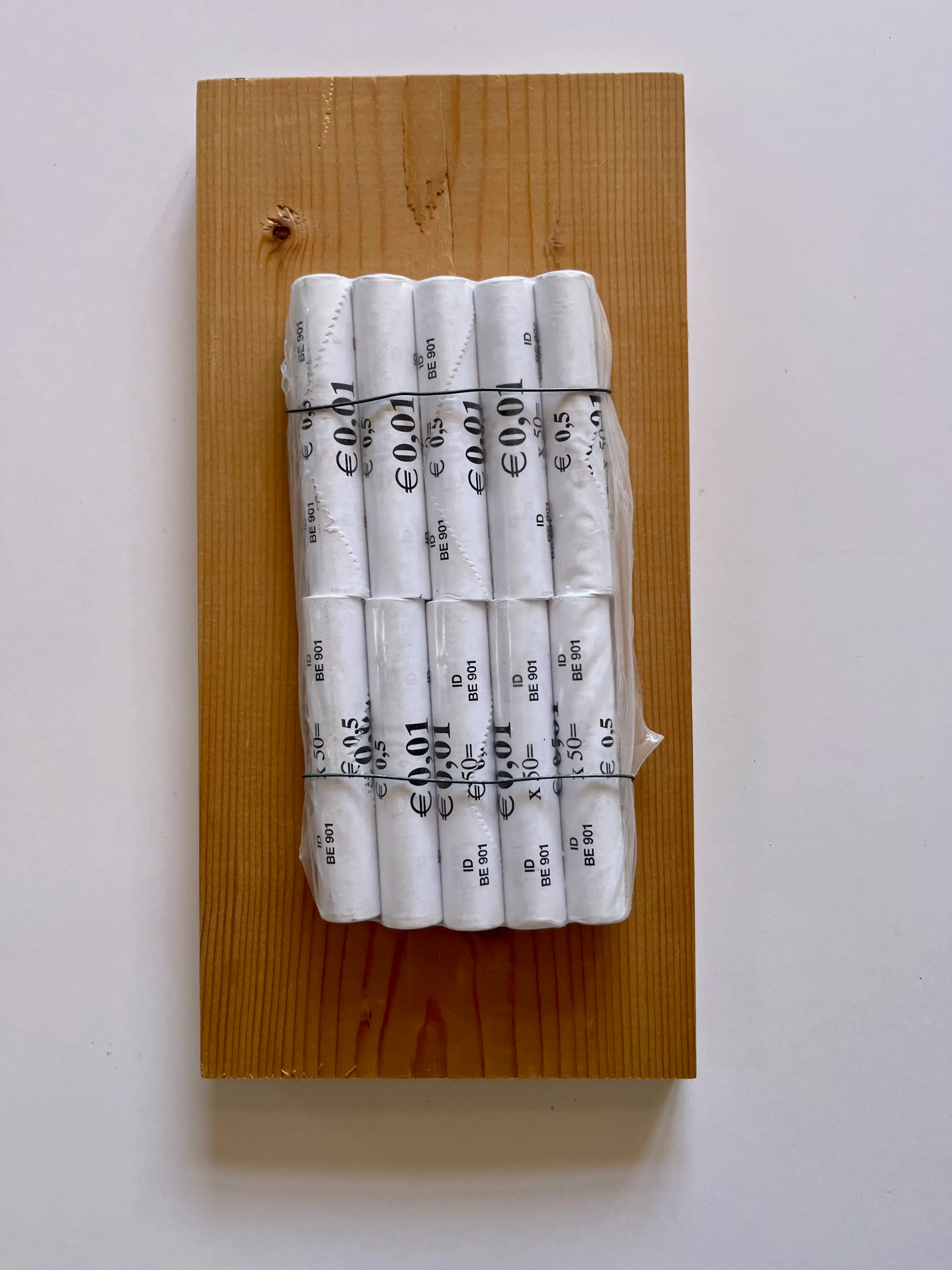 Materiaal: Hout, munten (0,01 € x 50 x 10), papier, metaaldraad