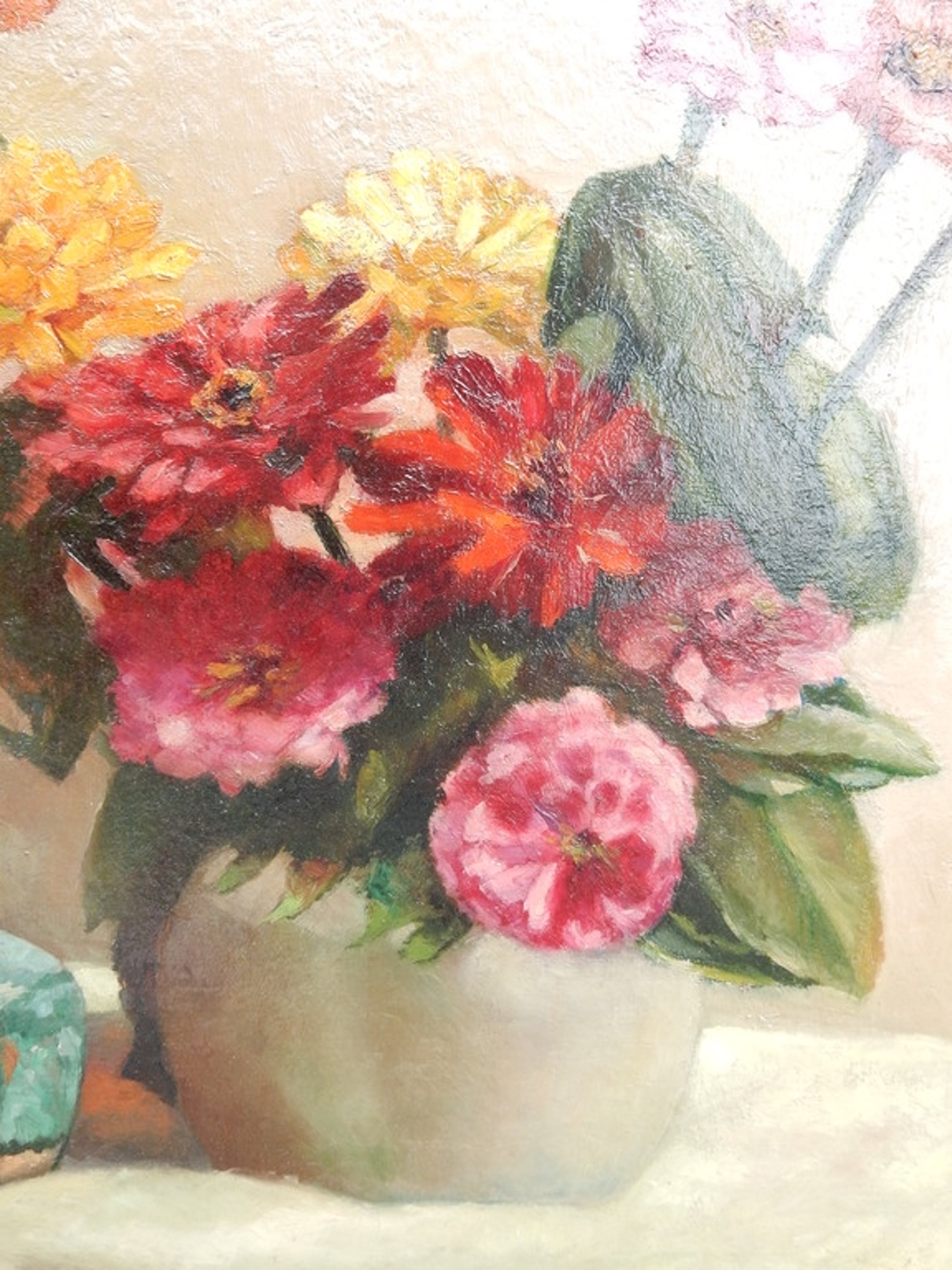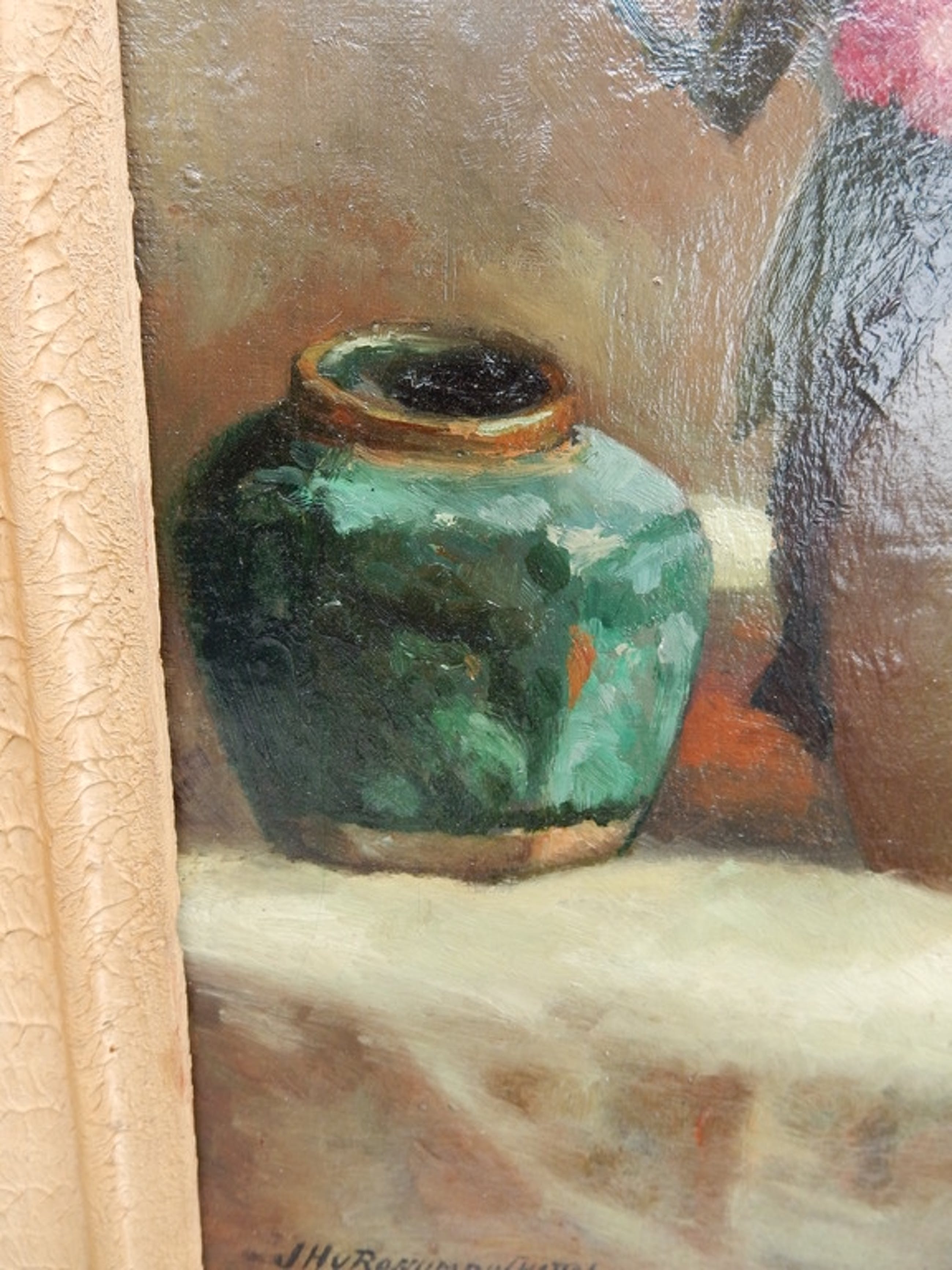 ( is hoog) Het werk: Stilleven, bloemen in vaas, met ernaast gemberpoot.