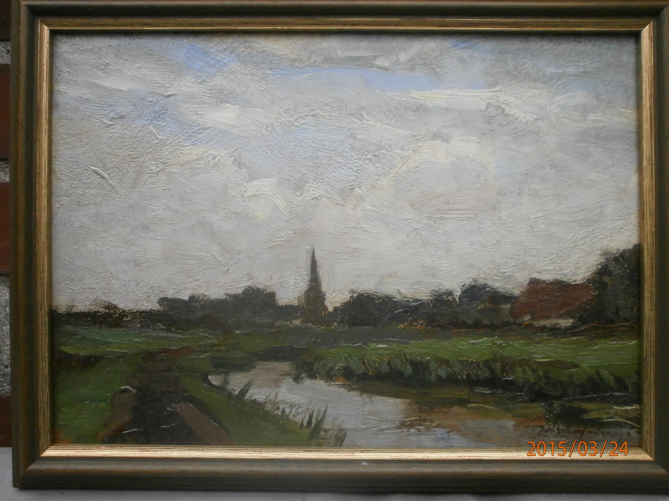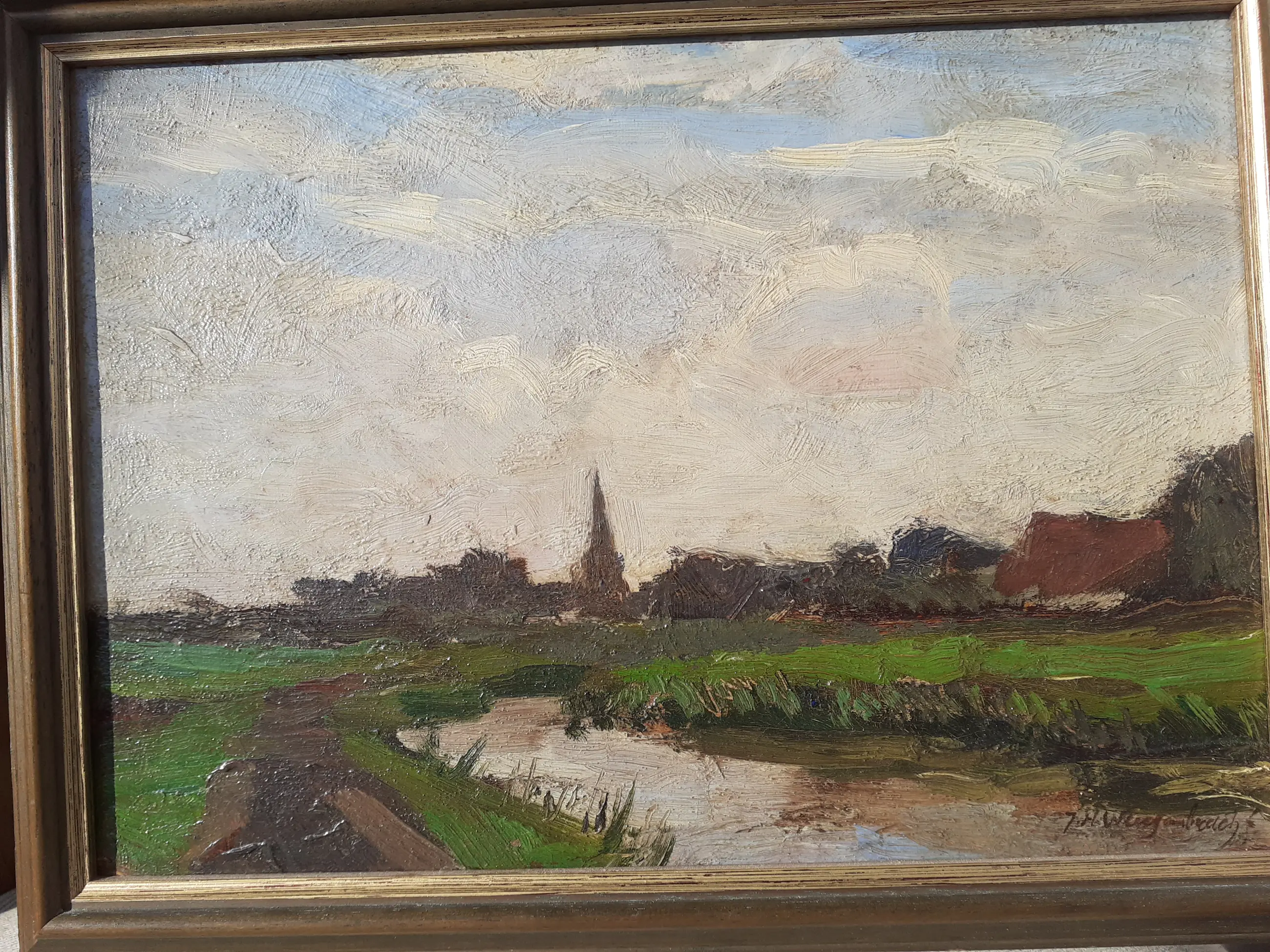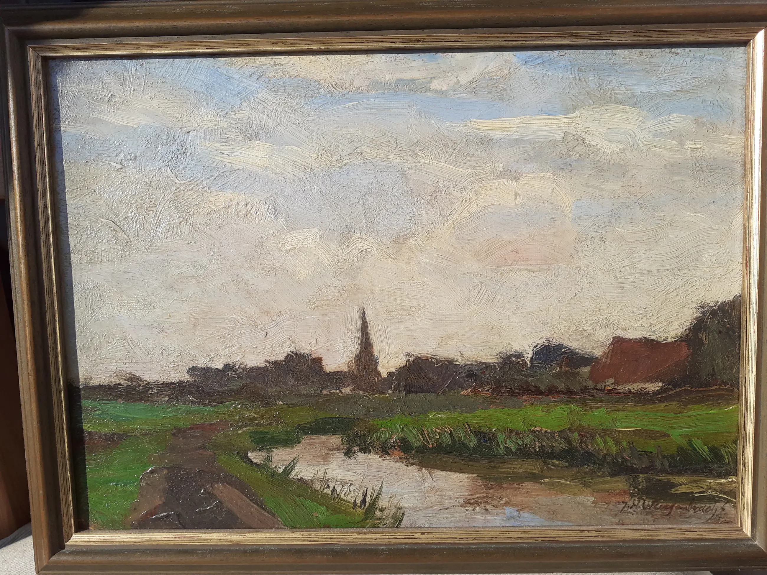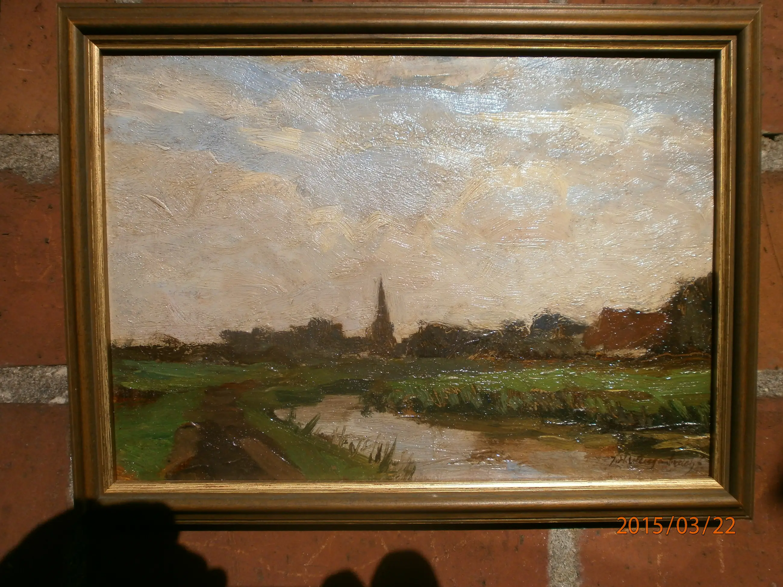 Polderlandschap met dorpsgezicht van J.H. Weissenbruch (1824-1903), mede-grondlegger van de Haagse School van het Hollands impressionisme . Het werk voldoet in alle opzichten aan de criteria van de Haagse School. Atmosferisch, landelijke omgeving, herkenbaar kleurgebruik en compositie. Er is een taxatie rapport met taxatienummer 2095-1427290025.