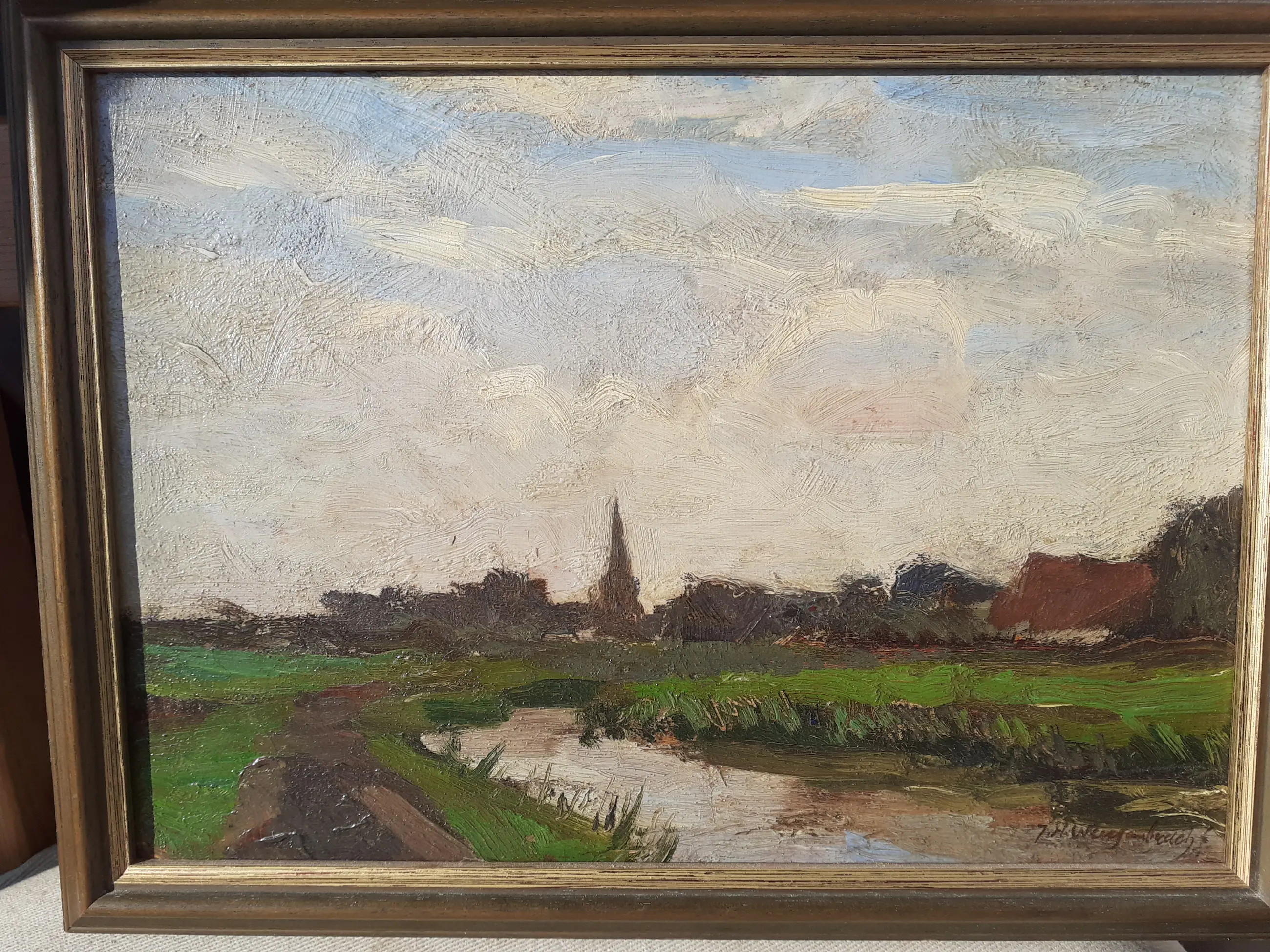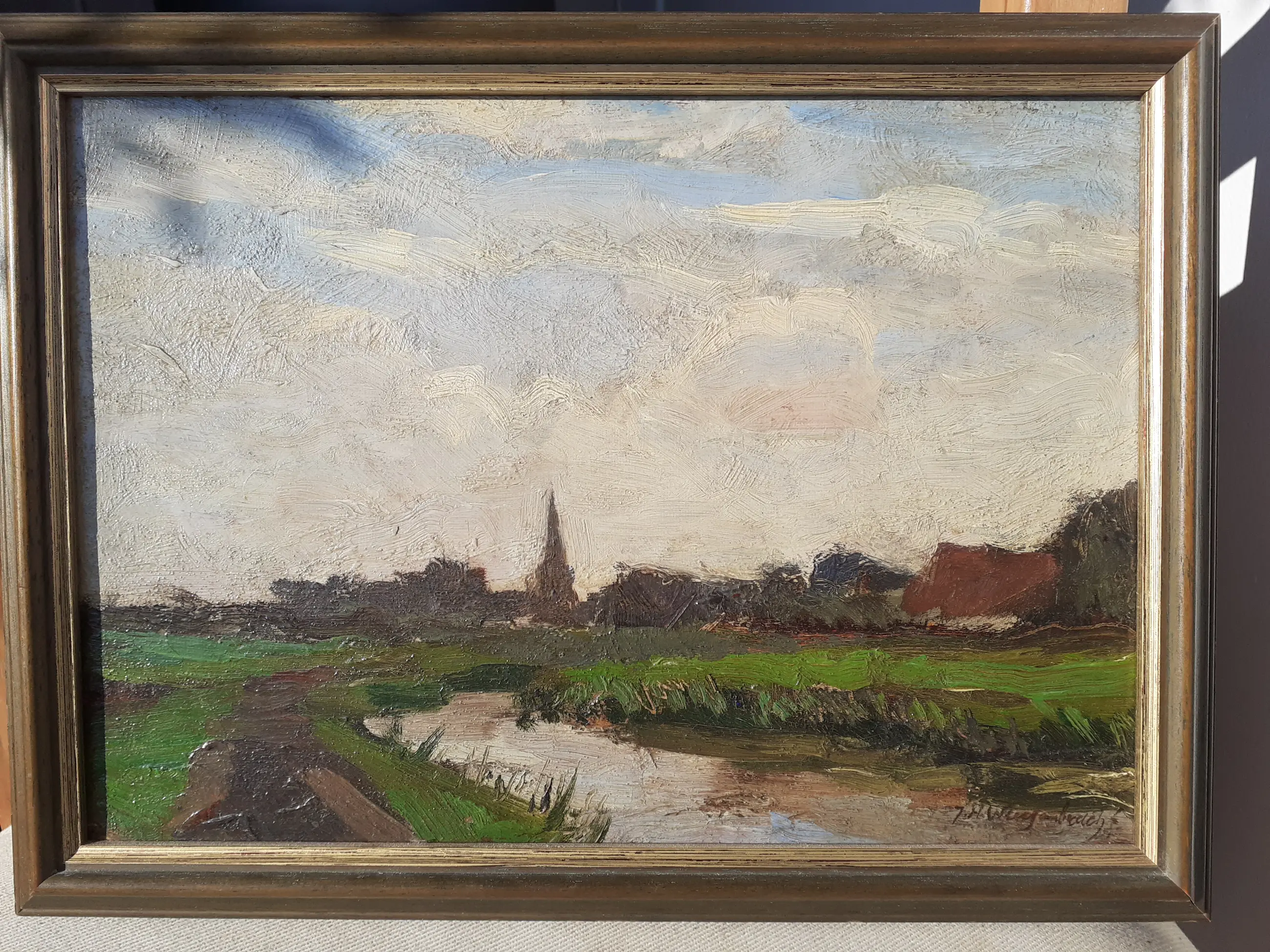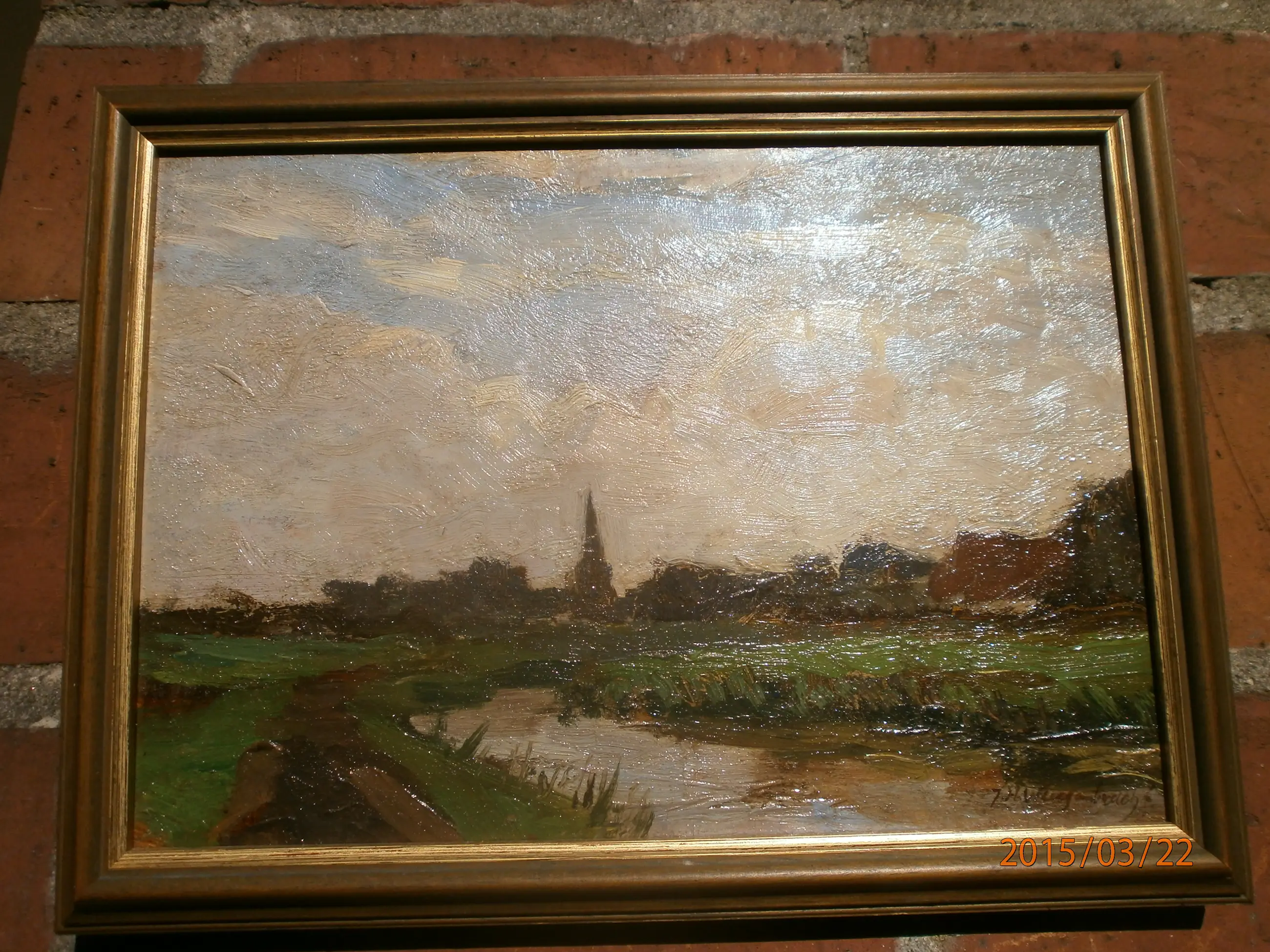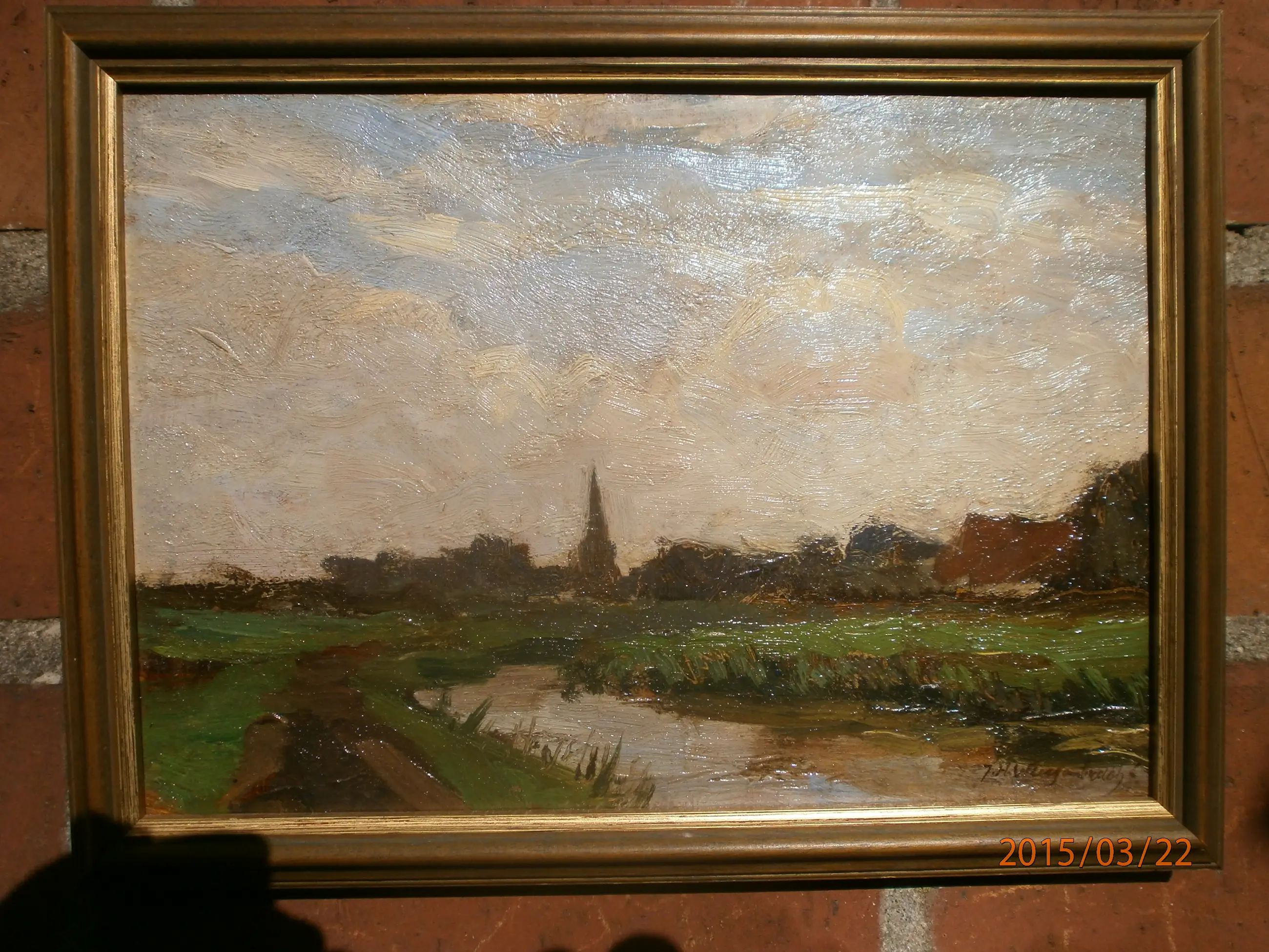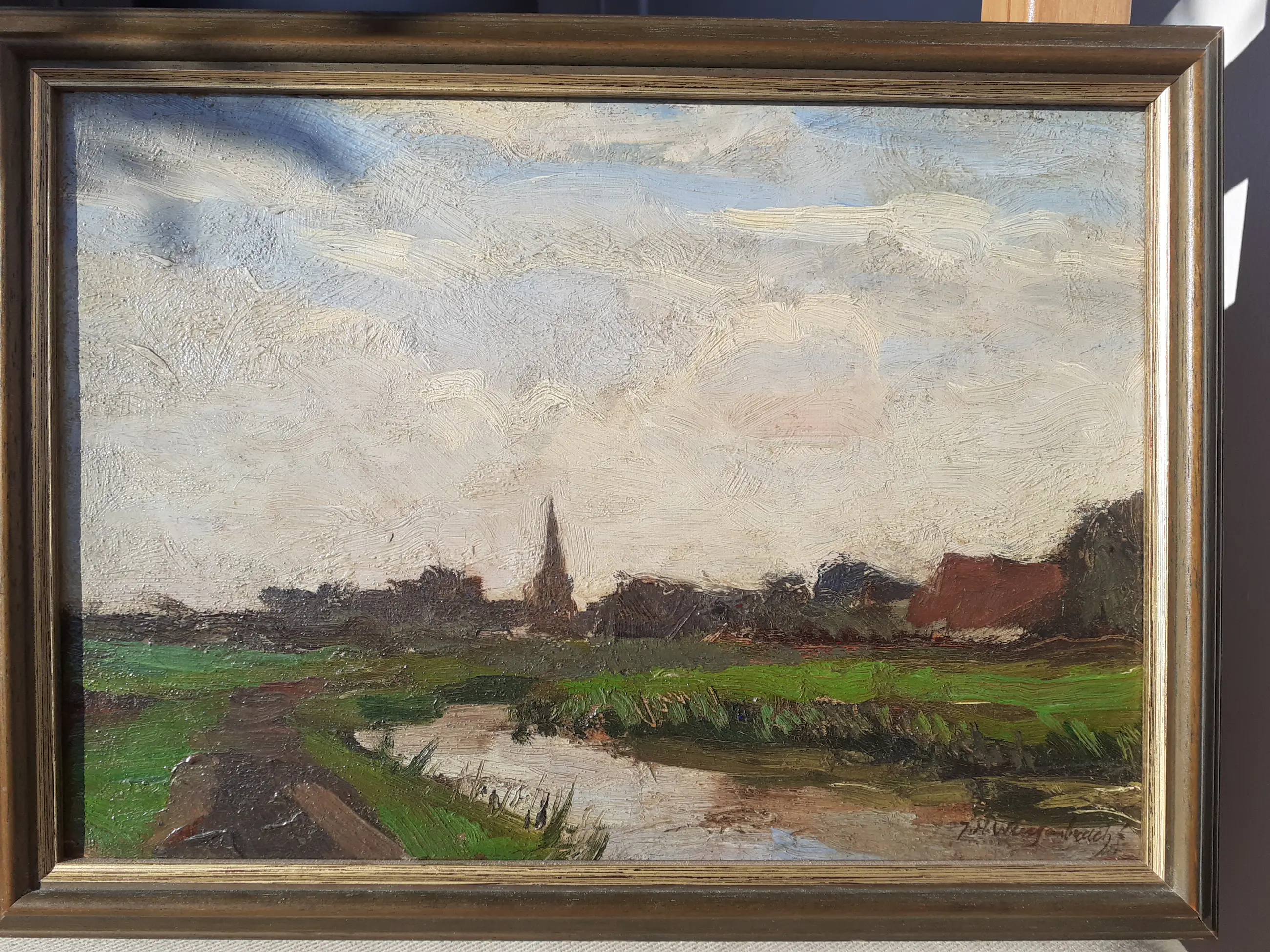 Polderlandschap met dorpsgezicht van J.H. Weissenbruch (1824-1903), mede-grondlegger van de Haagse School van het Hollands impressionisme . Het werk voldoet in alle opzichten aan de criteria van de Haagse School. Atmosferisch, landelijke omgeving, herkenbaar kleurgebruik en compositie. Er is een taxatie rapport met taxatienummer 2095-1427290025.
