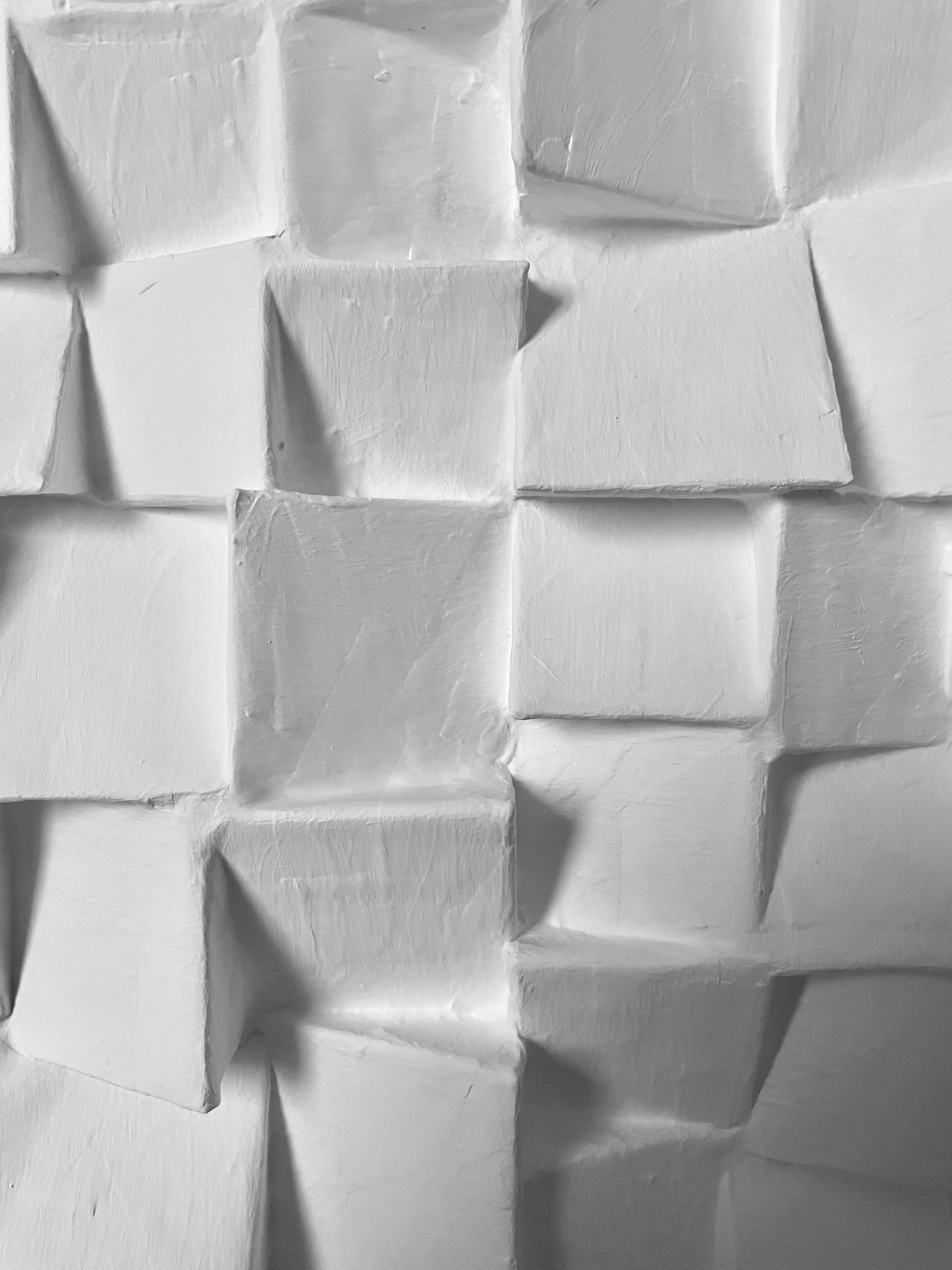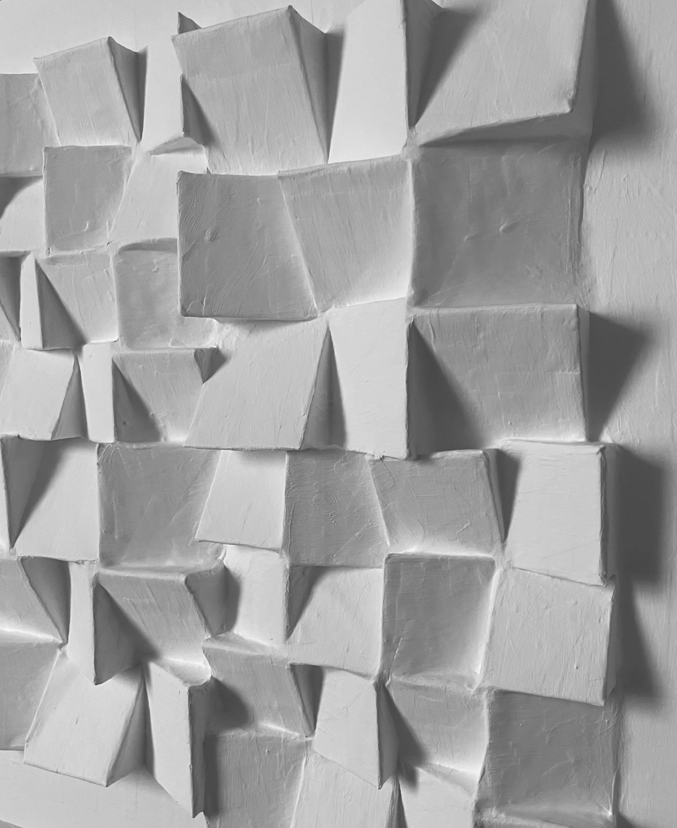 geometrisch-abstract reliëf, herinnert aan De Stijl en Zero, spiritueel en meditatief, zorgvuldig gecomponeerd en geconstrueerd uit karton en papieren elementen, vangt het licht vanuit verschillende standpunten en gedurende verschillende momenten van de dag.