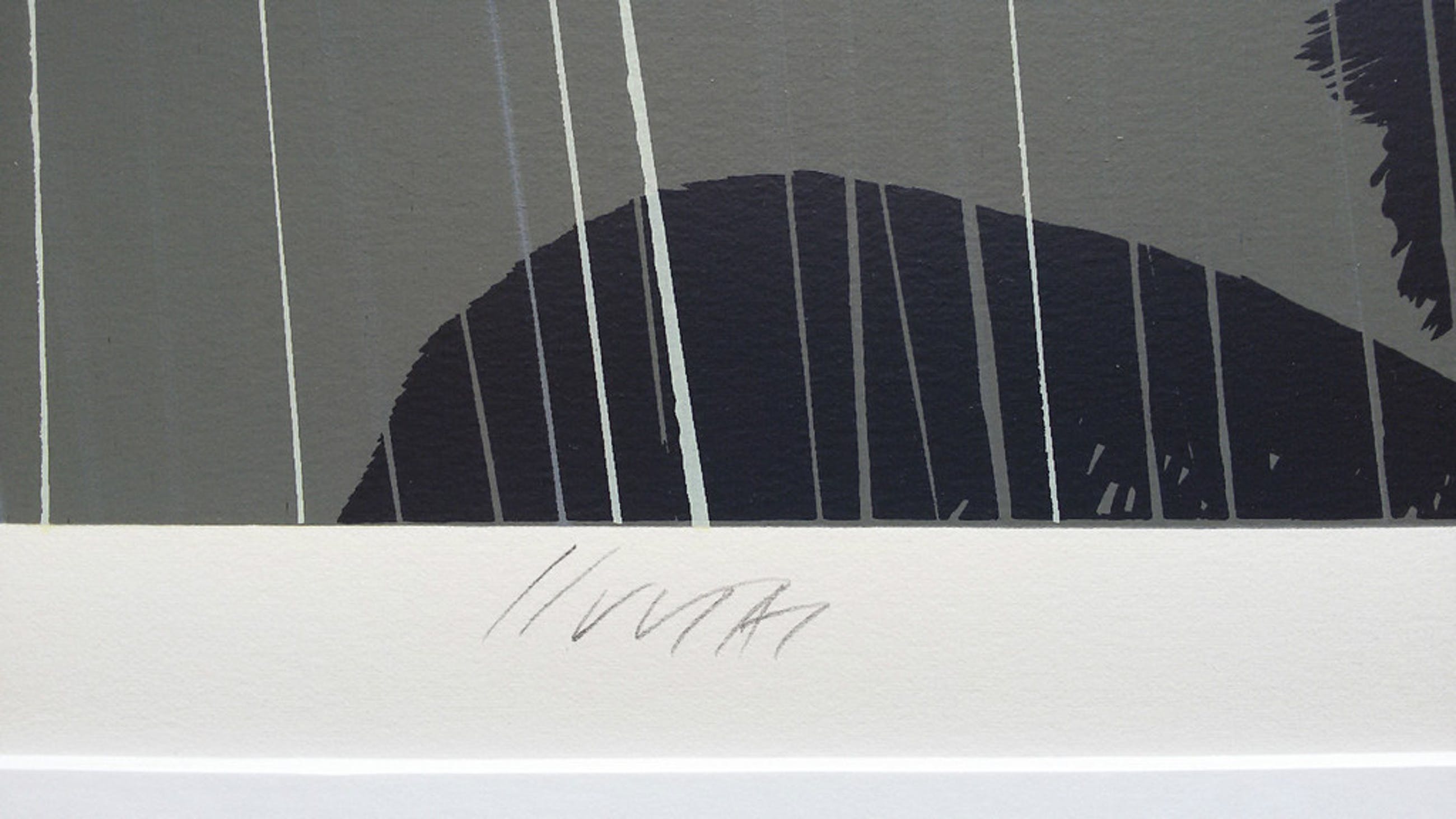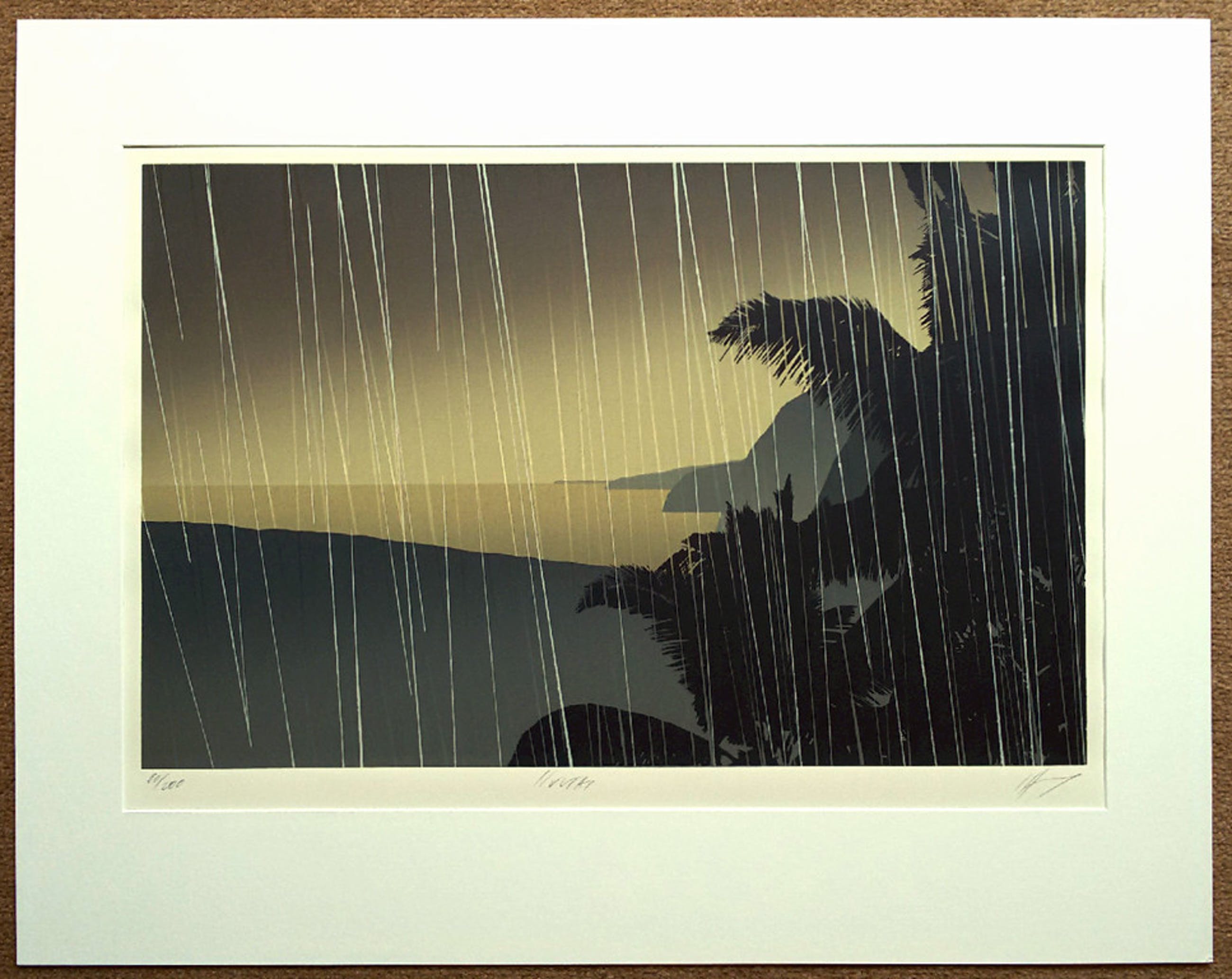 Prachtige zeefdruk van Jan Hendrix, gemonteerd in smetteloos passe-partout. Met potlood gesigneerd, getiteld (Hawaii?) en genummerd (80/200). Afkomstig uit de kunstcollectie van ABNAMRO, in uitstekende conditie.