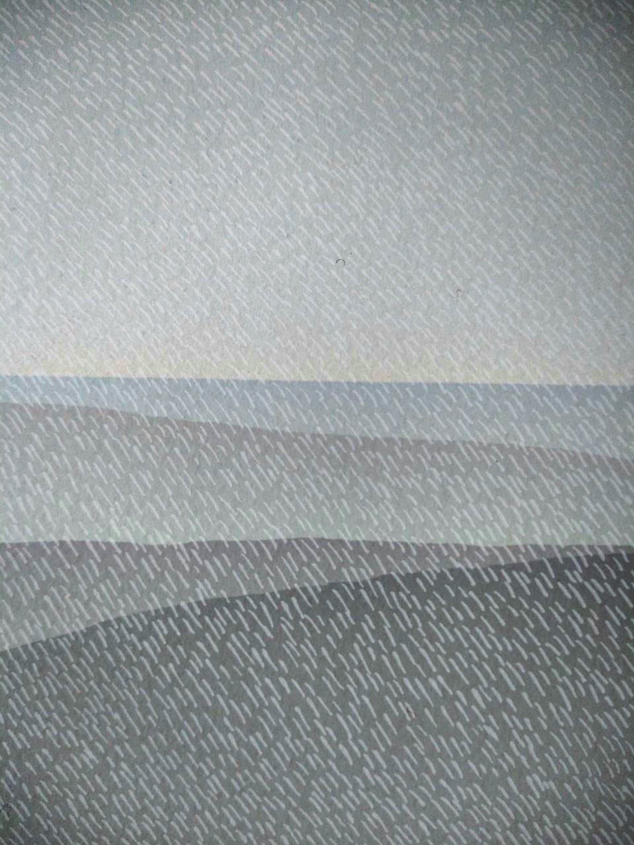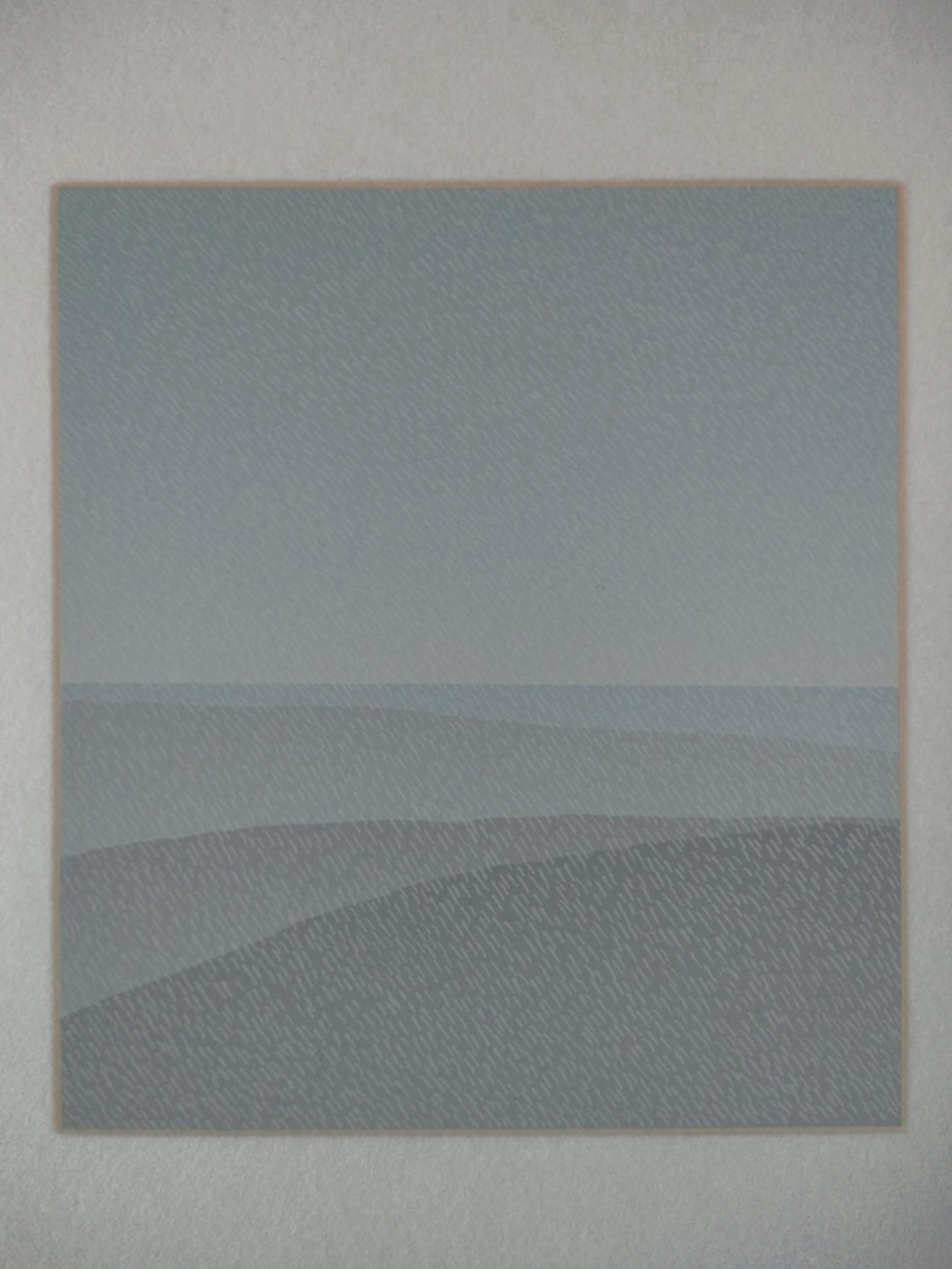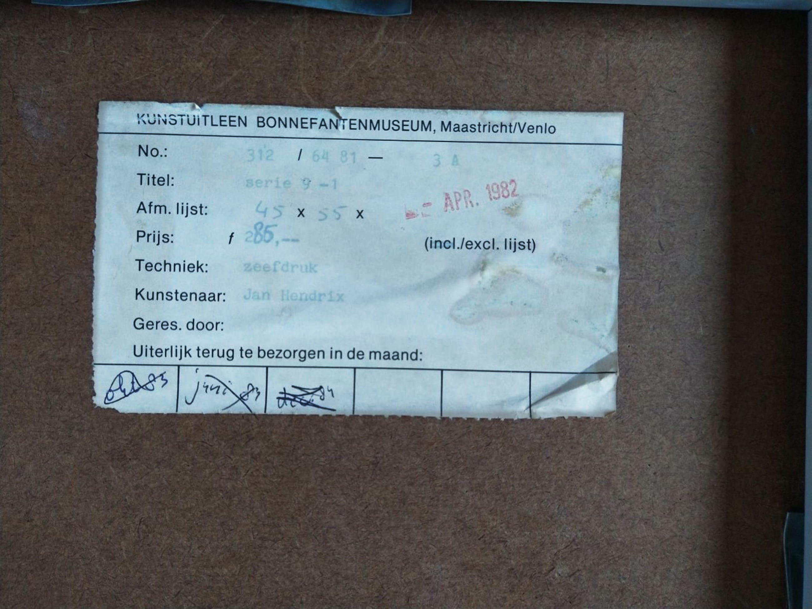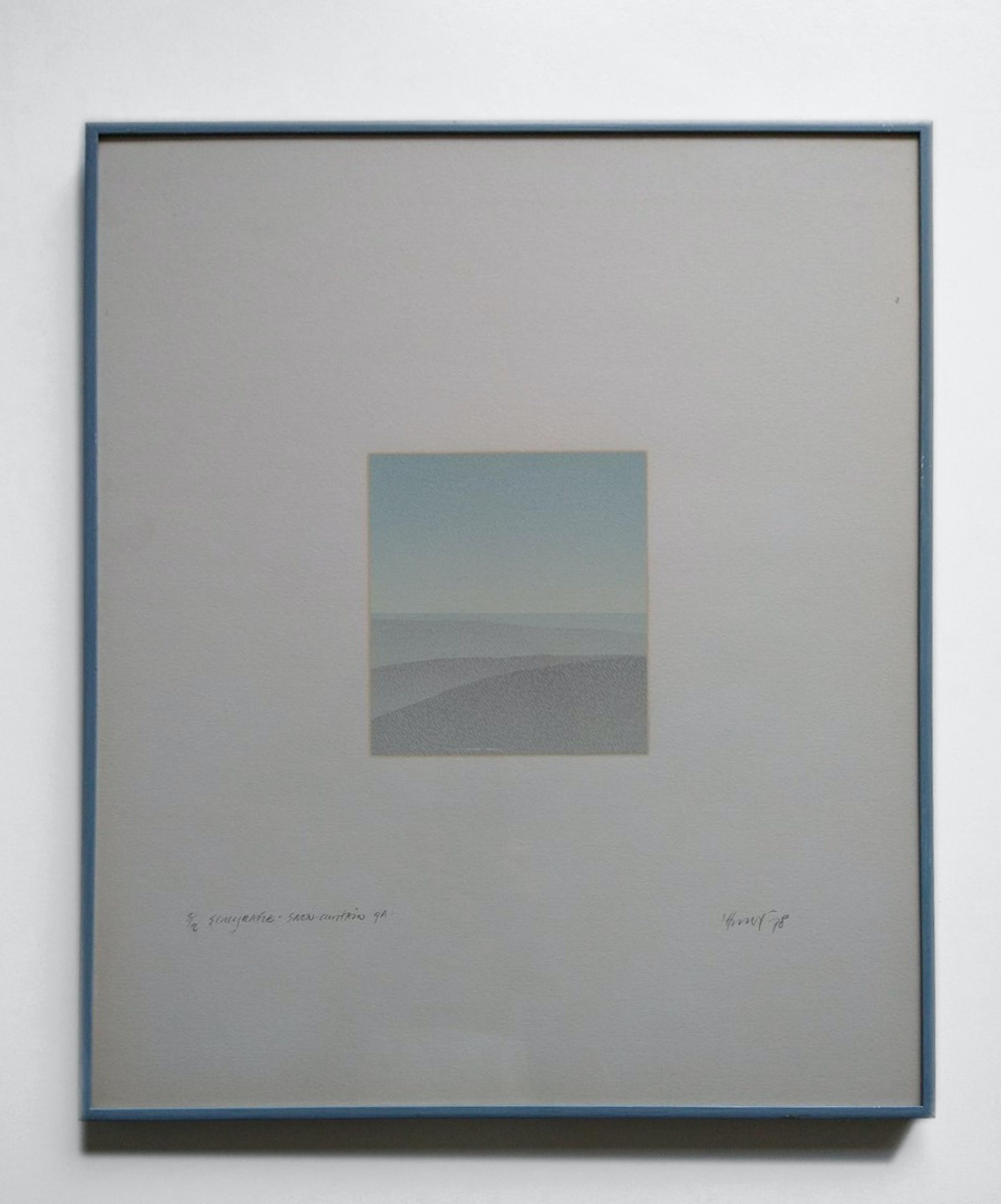 Typisch werk van Jan Hendrix: Snow Curtain 9A. Zeefdruk, in stemmige licht blauwe aluminium lijst. Formaat incl. 46 x 56 cm, beeld 15 x 17,5 cm. Potlood gesigneerd '78 en genummerd 3/12. Achterop van info label voorzien.