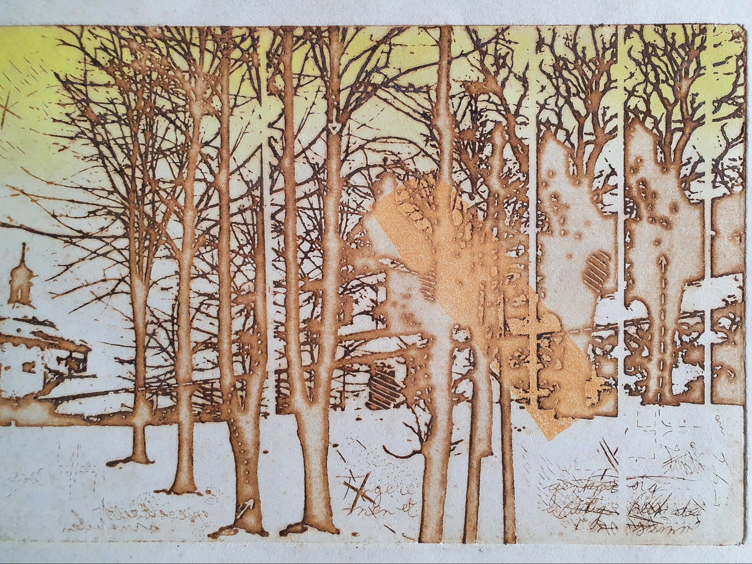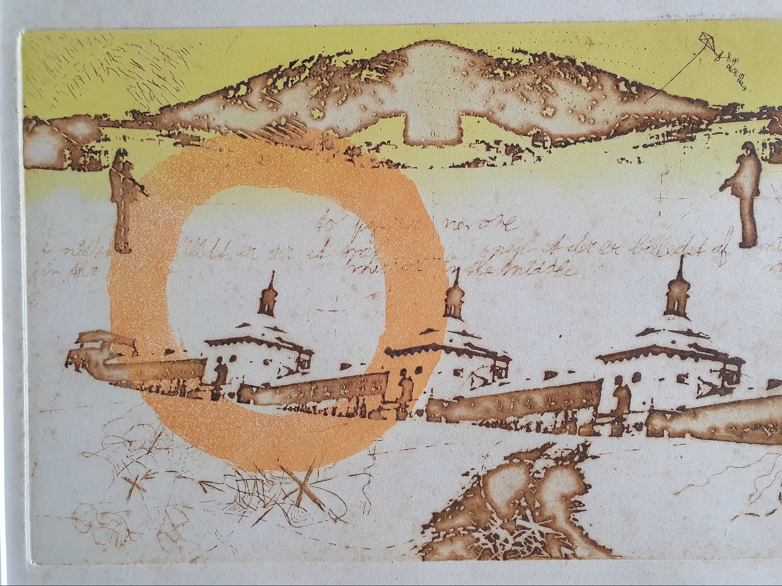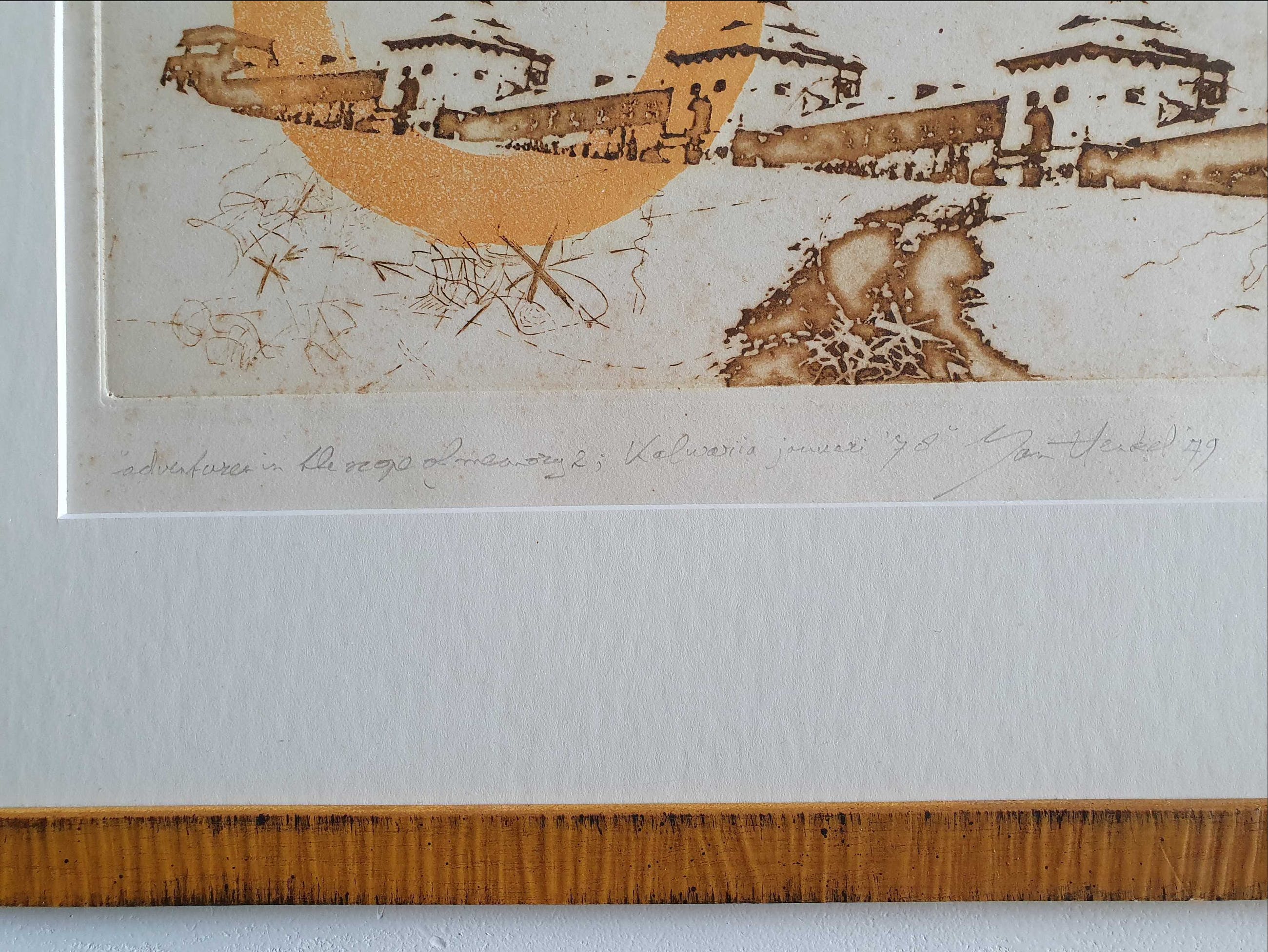 Schitterende ets/aquatint van Jan Henkel uit zijn afstudeerperiode aan de Kunstacademie Minerva in Groningen. Deze gekleurde voorstelling die met dubbele moet werd afgedrukt is vermoedelijk geïnspireerd geweest door een studiereis (de stad Kalwaria ligt in Polen) die hij in die tijd maakte voor zijn studie. Het contrasterende, bijna fluorescerende symboolgebruik en de silhouet van een gewapende grenswacht maken het werk politiek waardoor het in zekere zin ook als een vroege vorm van urban street art gezien kan worden. Vermoedelijk gaat het om een uniek werk.