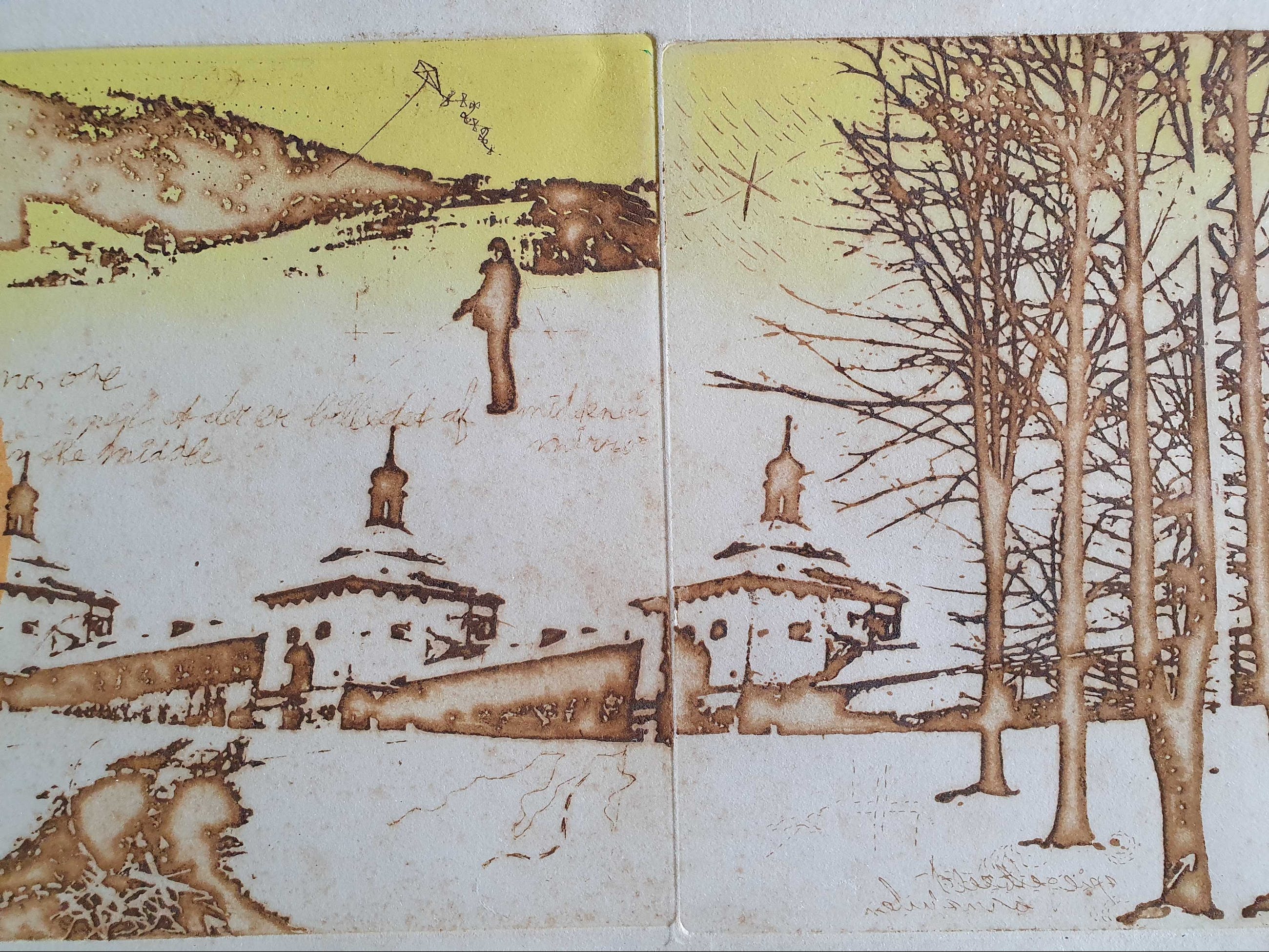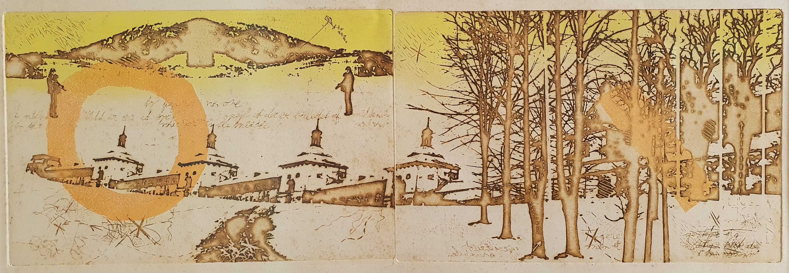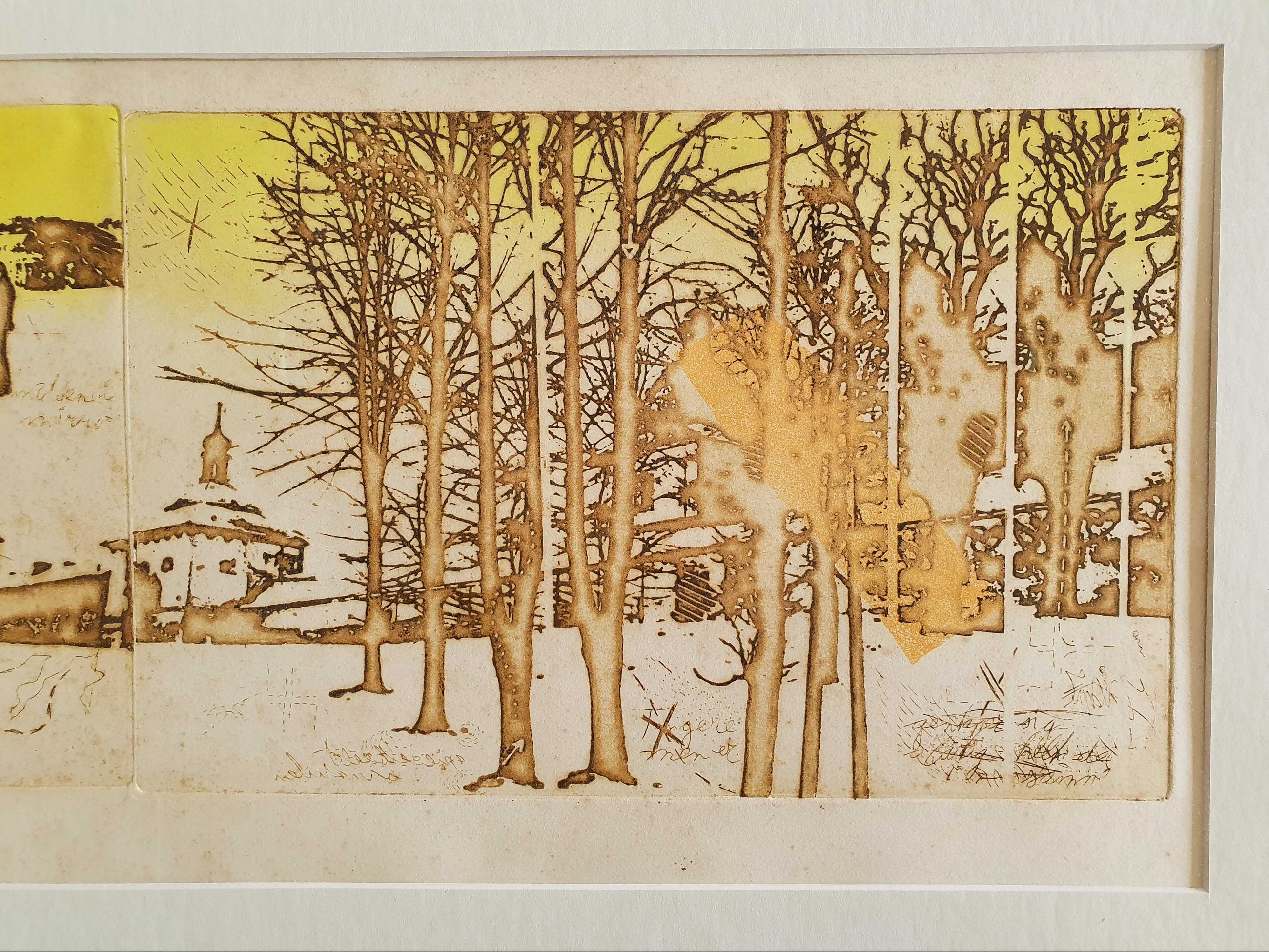 Schitterende ets/aquatint van Jan Henkel uit zijn afstudeerperiode aan de Kunstacademie Minerva in Groningen. Deze gekleurde voorstelling die met dubbele moet werd afgedrukt is vermoedelijk geïnspireerd geweest door een studiereis (de stad Kalwaria ligt in Polen) die hij in die tijd maakte voor zijn studie. Het contrasterende, bijna fluorescerende symboolgebruik en de silhouet van een gewapende grenswacht maken het werk politiek waardoor het in zekere zin ook als een vroege vorm van urban street art gezien kan worden. Vermoedelijk gaat het om een uniek werk.
