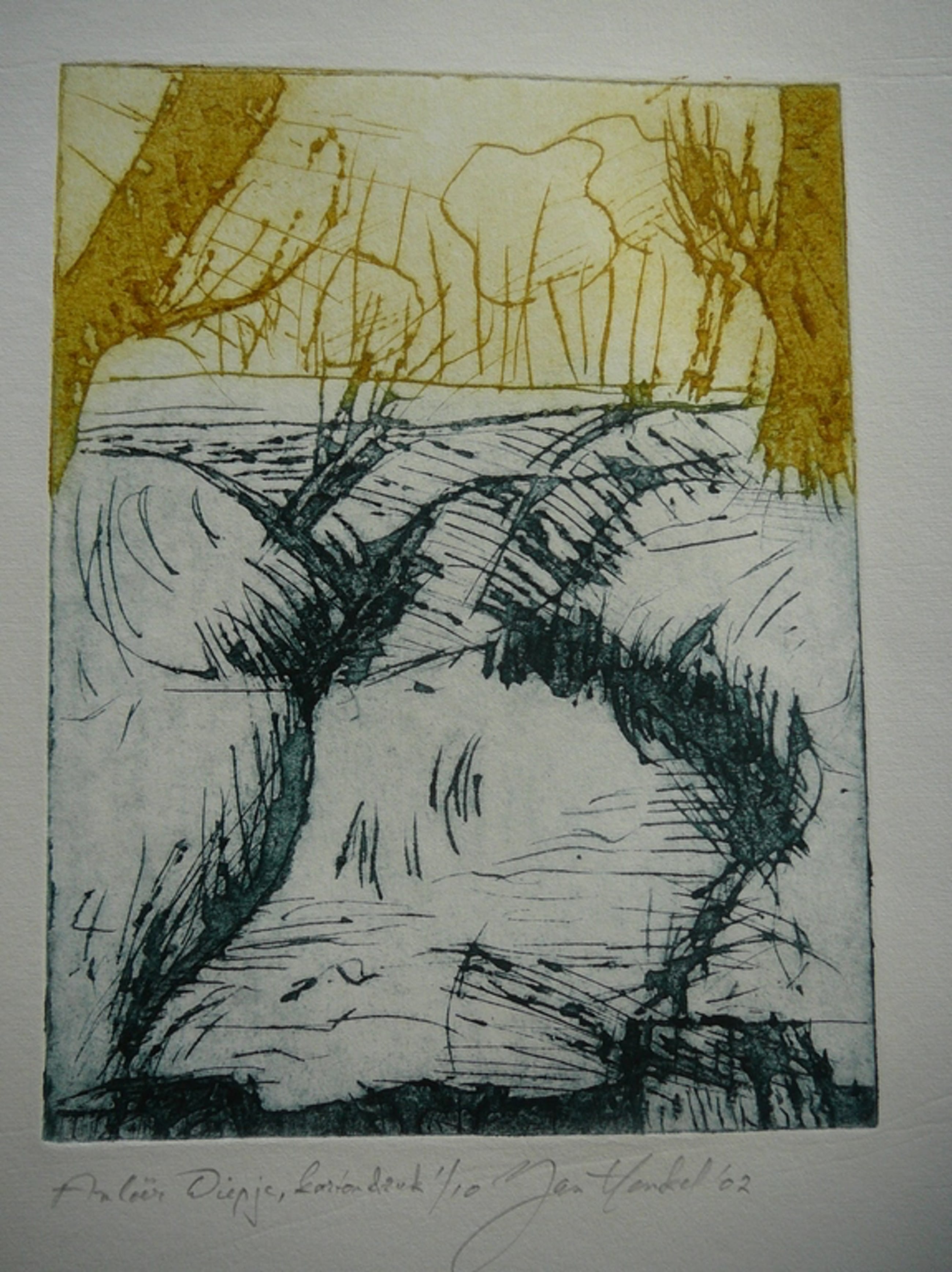 "Anloërdiepje" kartondruk van Jan Henkel uit 2002 in 2 kleuren.