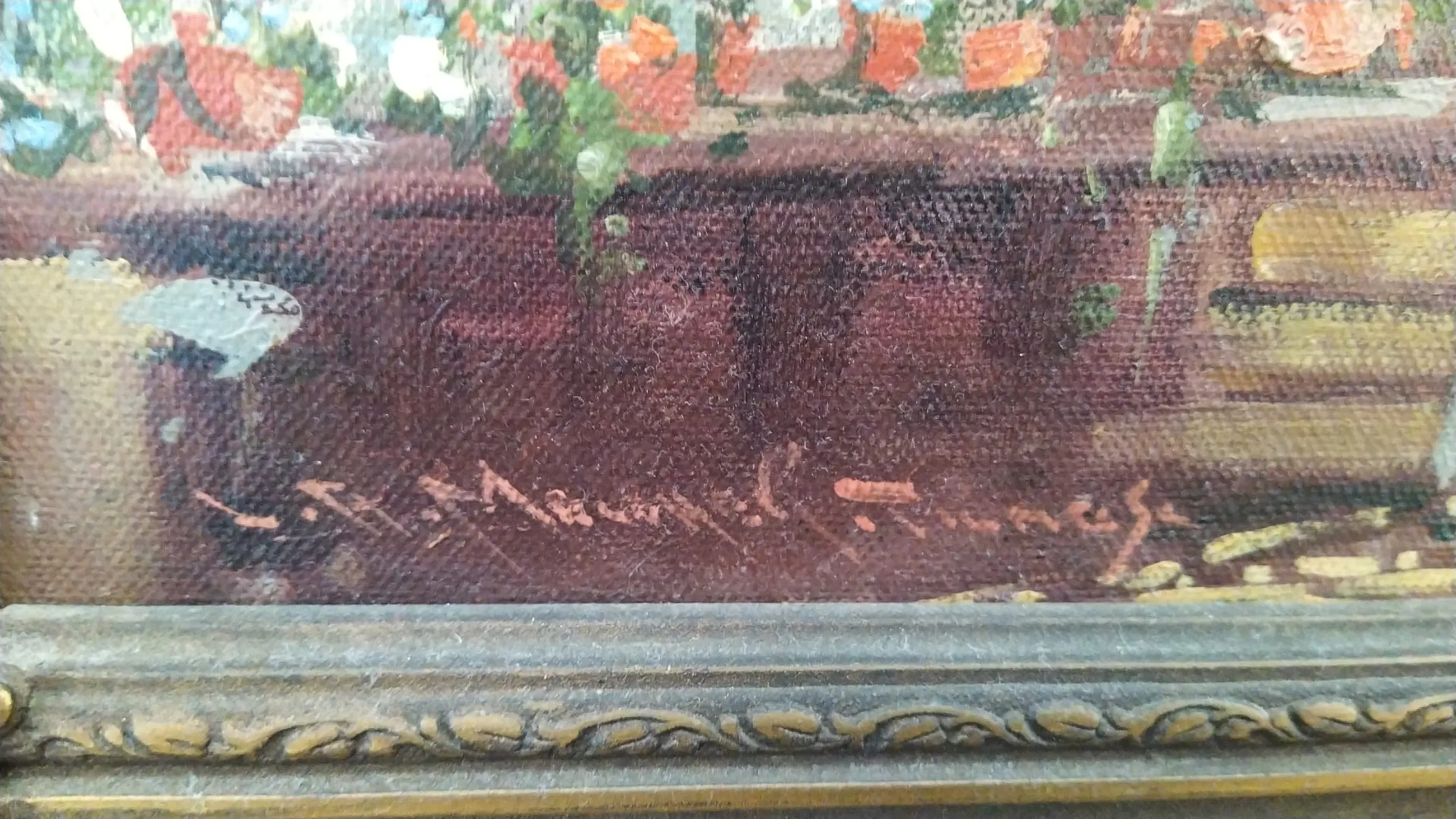 De Amsterdamse grachten met uitzicht op de kerk. De techniek en drager weet ik niet zeker, ik ben geen kenner. Het schilderij is door kunstveilig getaxeerd. De afmetingen van de omlijsting kloppen, de afmetingen van het werk kunnen iets afwijken. Het schilderij staat op een andere locatie, dus kan het momenteel niet opmeten.