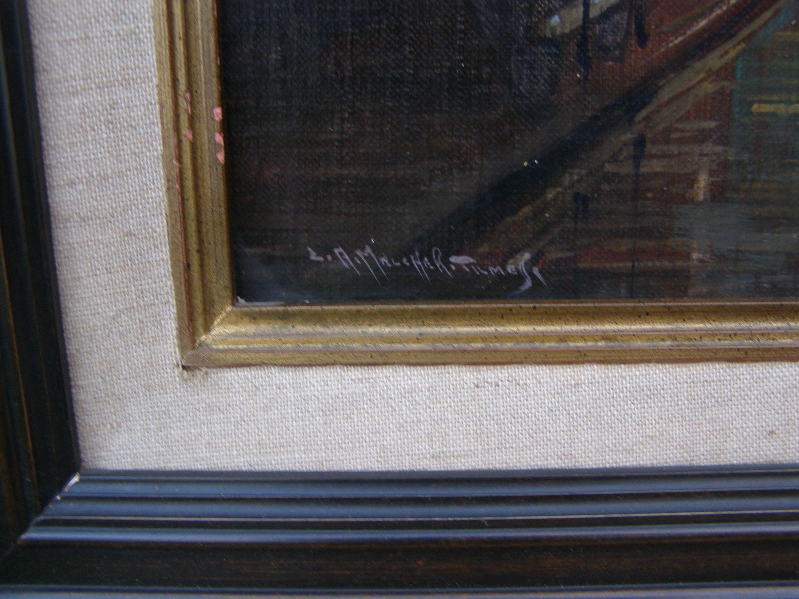 Jan Hermanus Melcher Tilmes woonde en werkte bijna zijn hele leven in Amsterdam. Aanvankelijk specialiseerde hij zich in het schilderen van landschappen met vee en bosgezichten, later legde hij zich steeds meer toe op Amsterdamse stadsgezichten. Melcher Tilmes schilderde niet alleen de bekende plekjes, zoals het Muntplein, de Ronde Lutherse Kerk en de Westerkerk, maar ook talloze schilderachtige, minder bekende stukjes stad. Mensen spelen daarin vaak een ondergeschikte rol. Zijn vroege werken zijn fijn en gedetailleerd maar met de jaren werd zijn schildertoets steeds losser. Daarnaast heeft ook zijn kleurgebruik een ontwikkeling doorgemaakt. Zijn bruingroene palet werd geleidelijk aan steeds kleurrijker en lichter van toon. Lijst heeft wat aandacht nodig.
