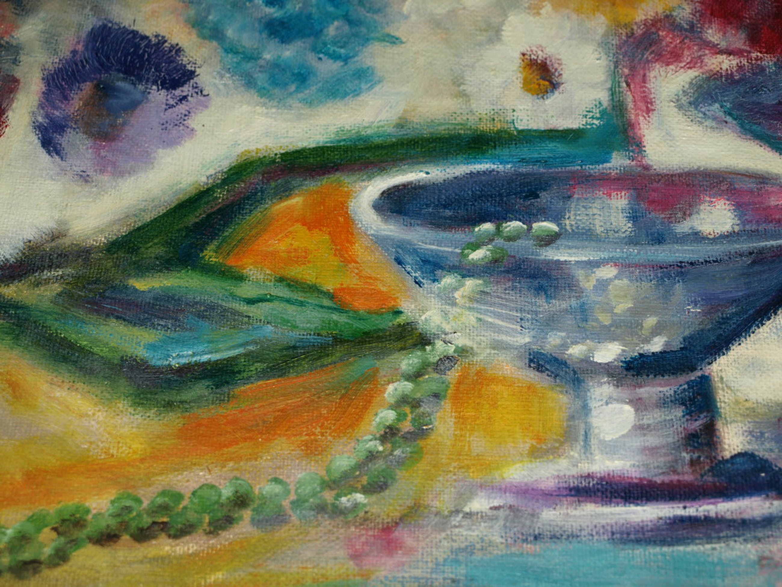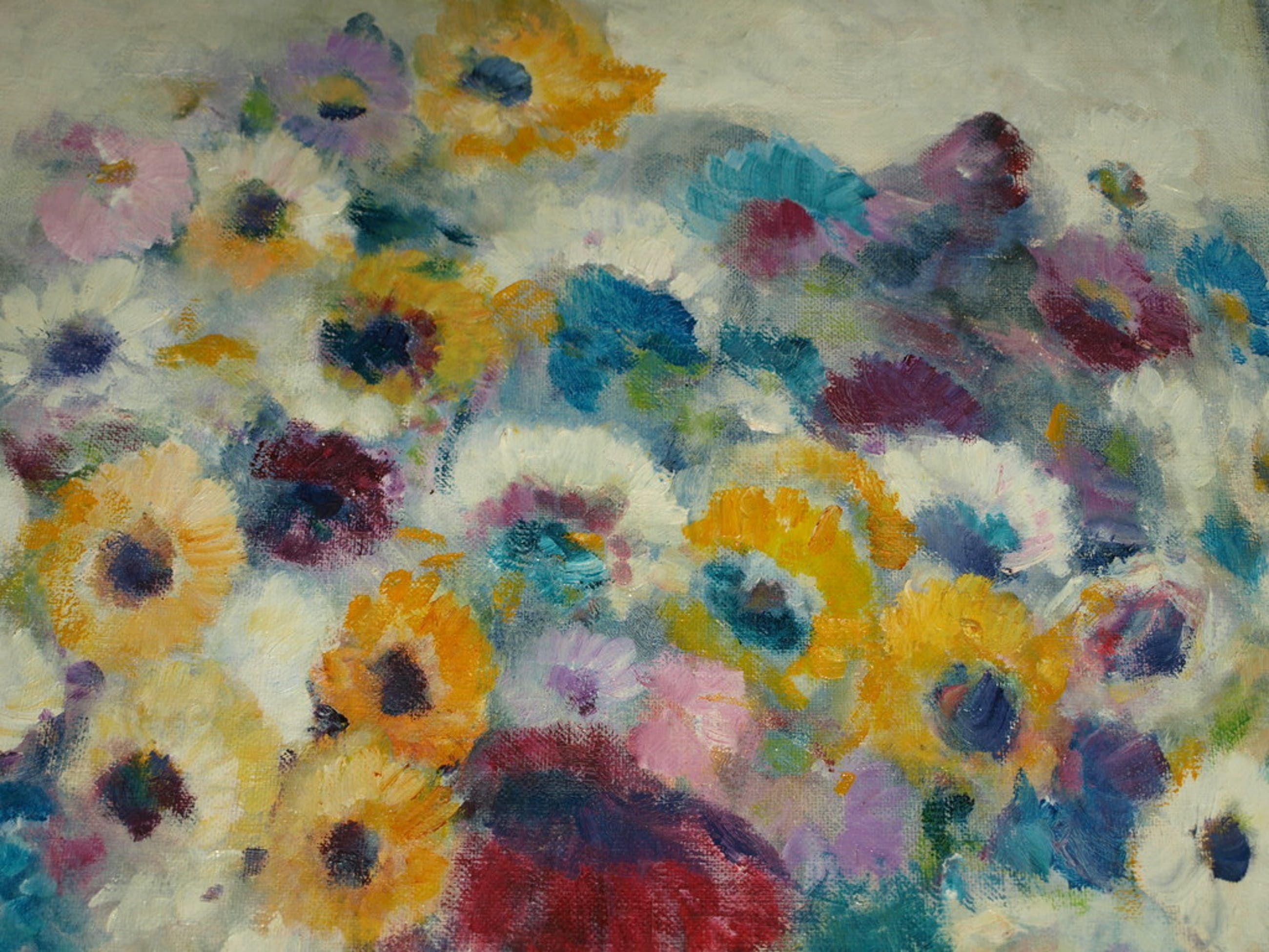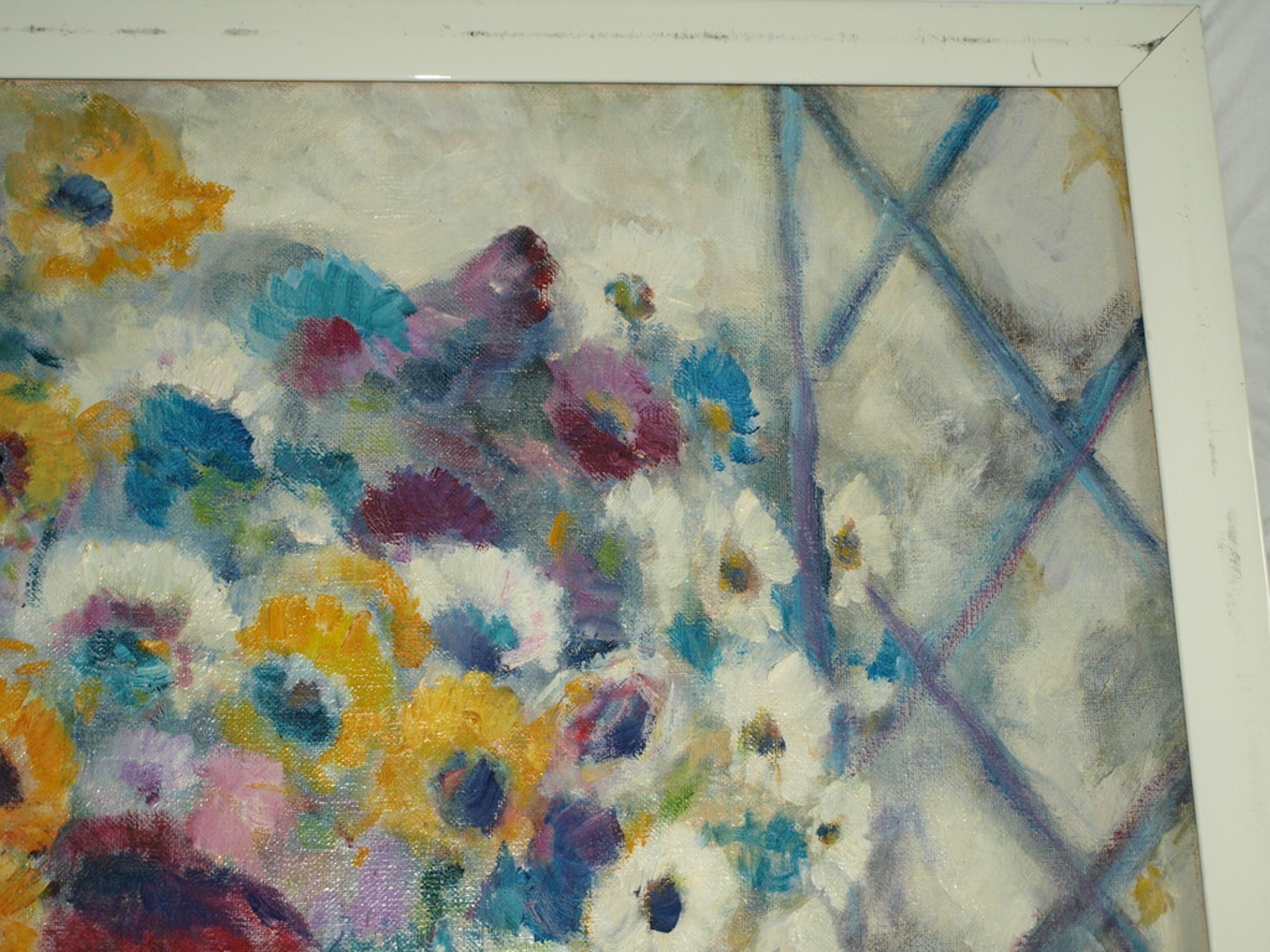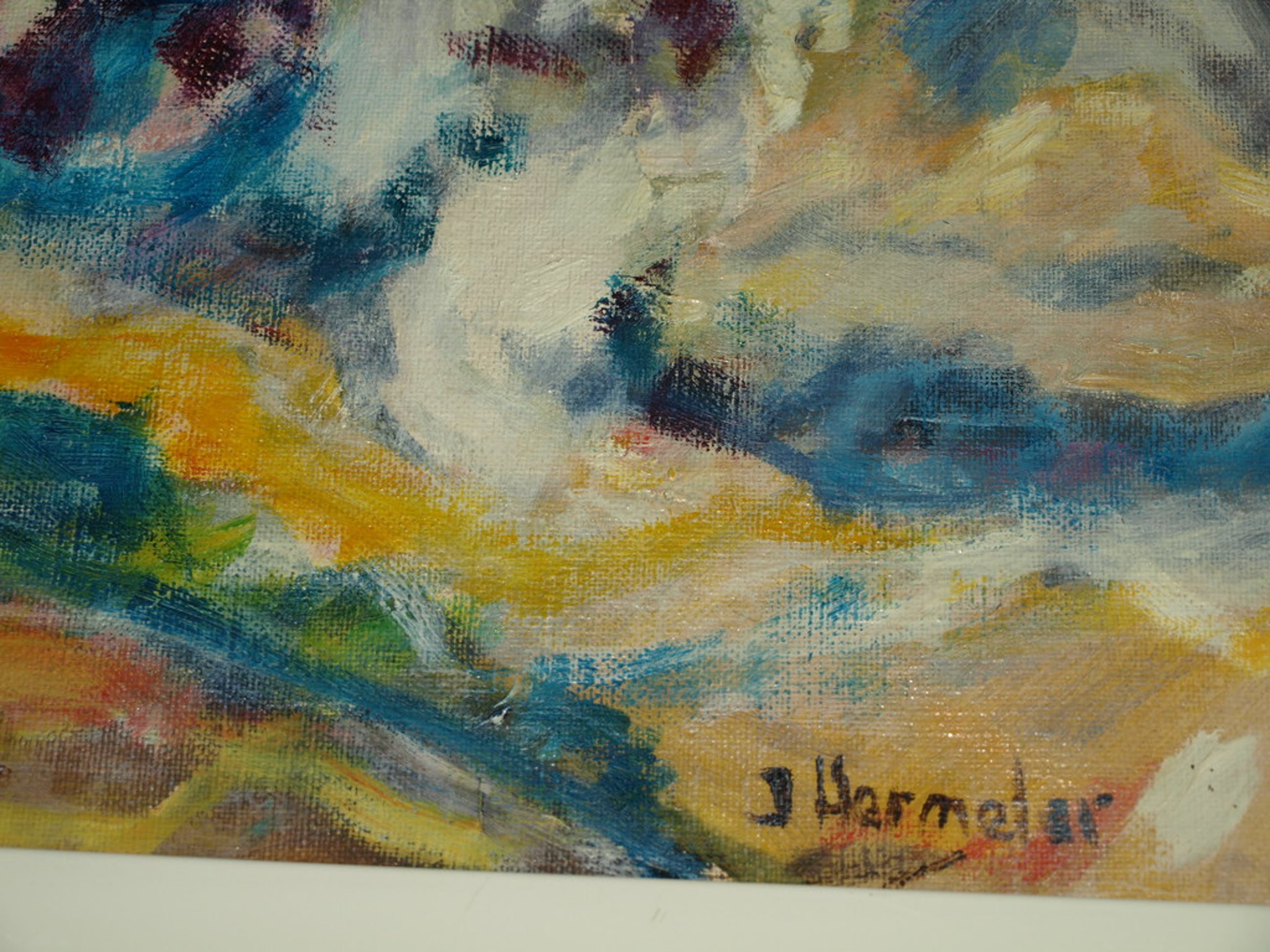 Een groot en kleurrijk schilderij van de kunstenaar Jan Hermeler met een voorstelling van een stilleven met bloemen.