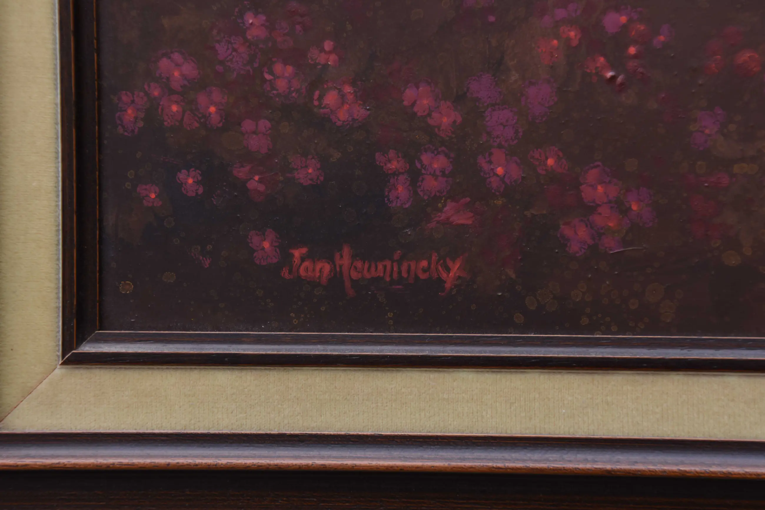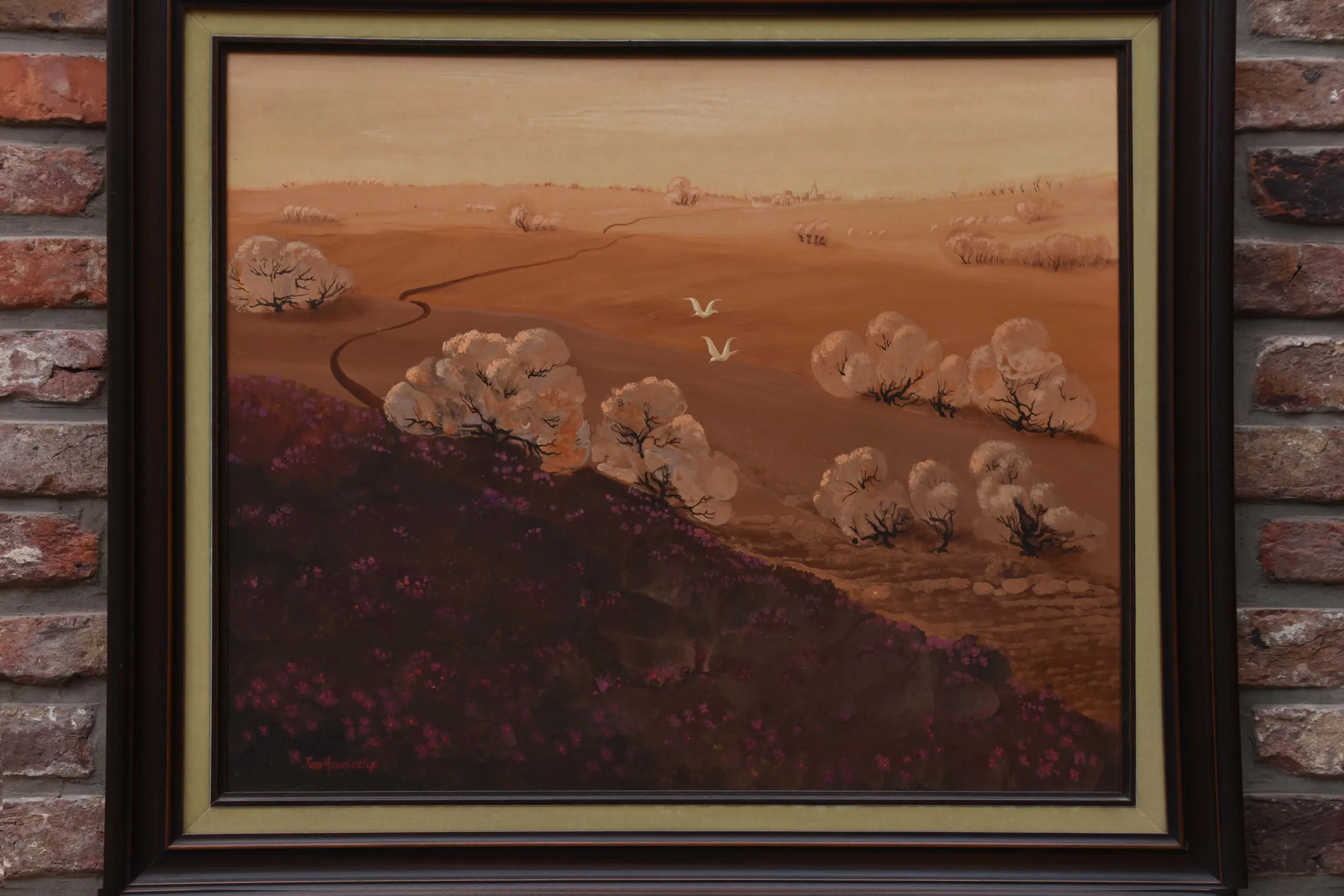Landschap vol licht en diepte, geschilderd in zachte tonen. De geleidelijke overgang van donkere naar lichte tonen schept heel veel diepgang. De S-weg slingert zich op subtiele wijze naar de verre einder. De mooie details in de bloemen op de voorgrond maken het werk volledig. De schilder is Jan Heuninckx (+), gewezen docent aan het Hoger Instituut voor Opvoedkundige wetenschappen te Gent en diocesaan inspecteur Plastische Opvoeding, tevens stichter van het Regentaat Plastische Kunsten in het Sint-Thomasinstituut van Brussel. Voor Talens- Nederland publiceerde hij over plakkaatverf-, olieverf- en aquareltechnieken. Zijn werken kenmerken zich door het gebruik van meerdere technieken en het deskundig aanwenden van licht en diepte.