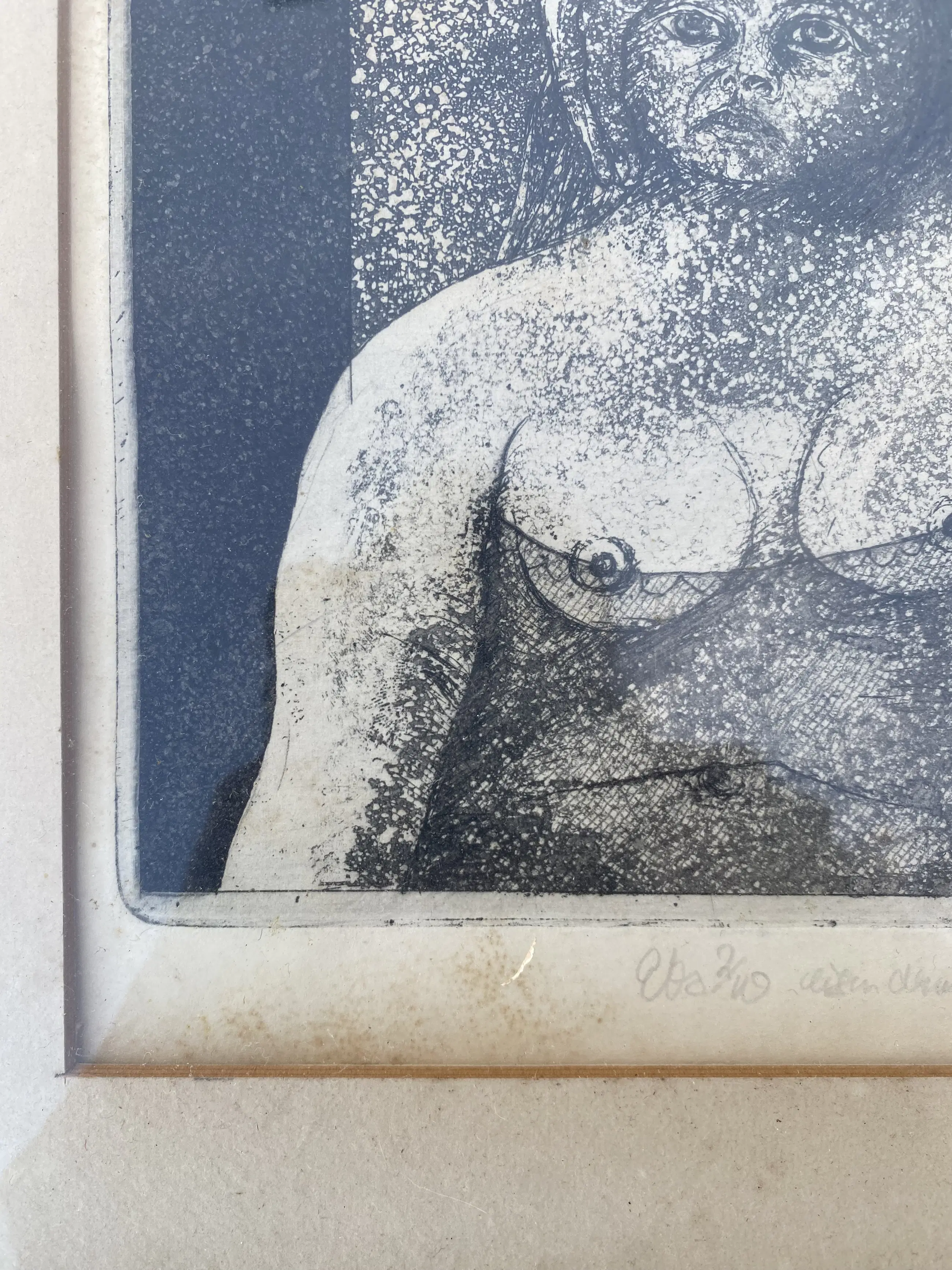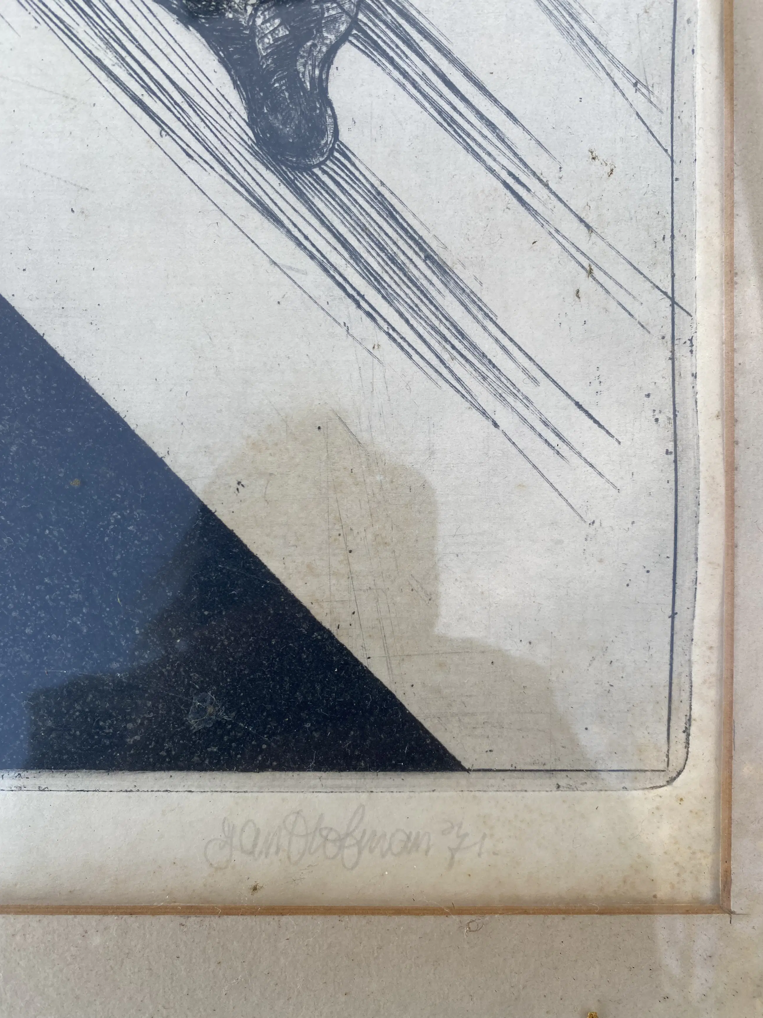 Verkleuringen in passepartout en papier.