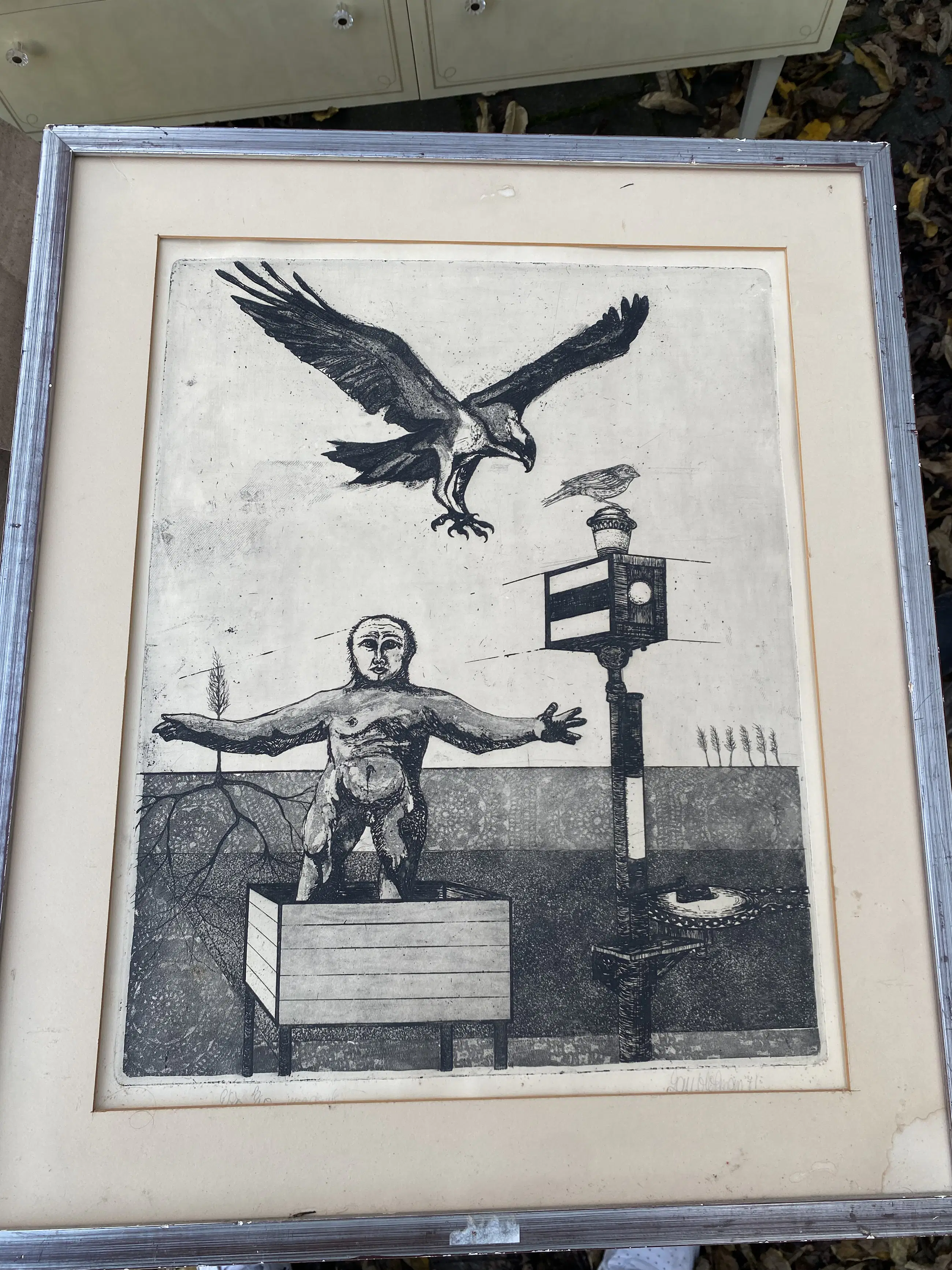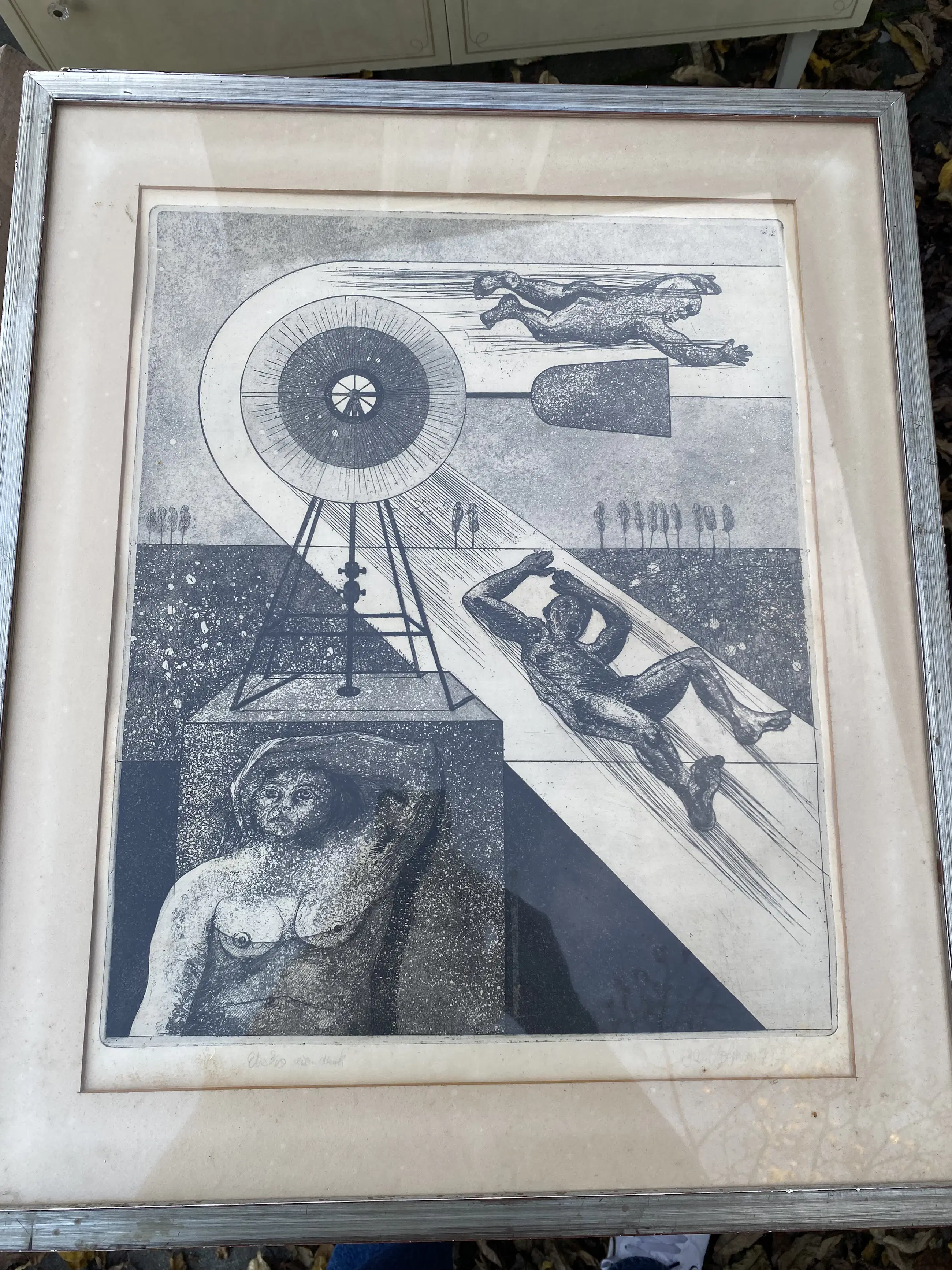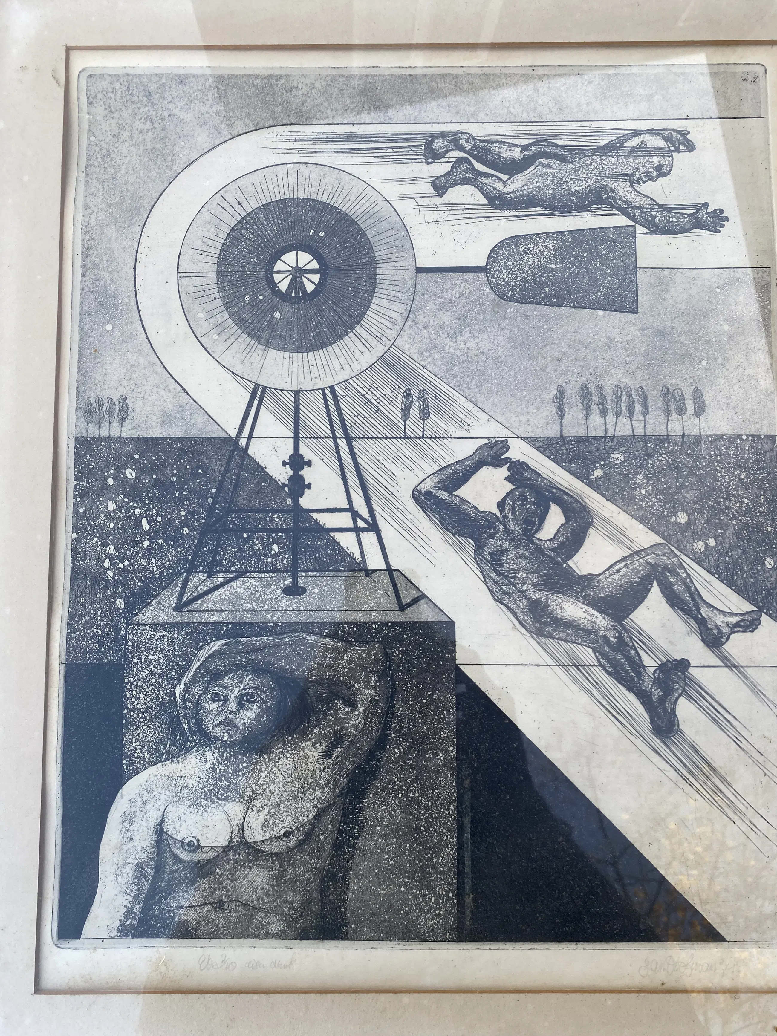 Twee mooie mystieke etsen van Jan Hofman, handgesigneerd en gedateerd 1971 ej 1972z Belletjes Blazen en Stroming. Bij het tweede werk ontbreekt het glas. In aluminium lijst.