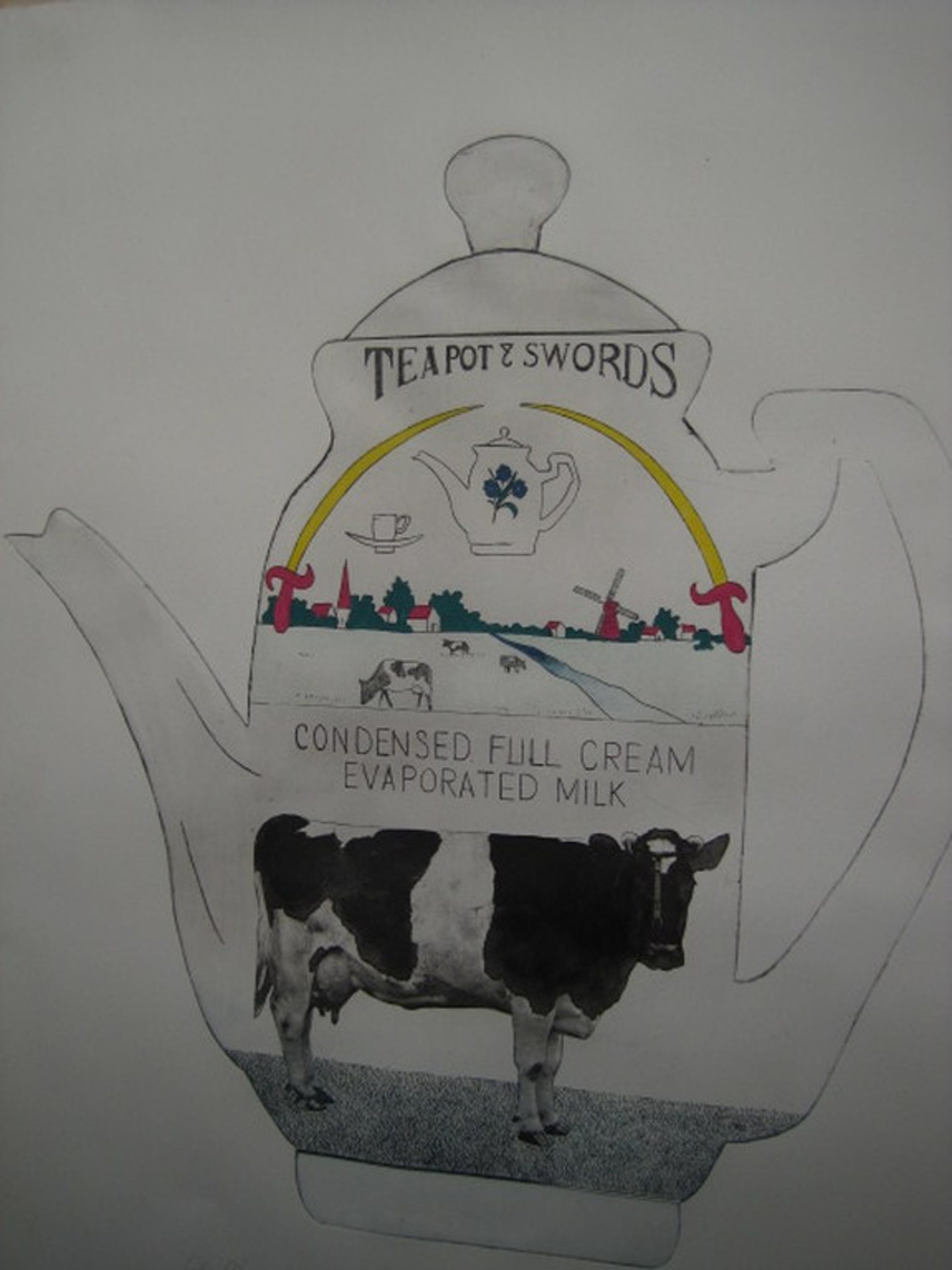 Grote stukken zink met grillige vormen en rafelige randen worden met verf bewerkt en vloeien uit buiten de randen van een traditionele omlijsting. Karakteristieke bladen van bomen en planten worden geprepareerd en van dikke verflagen voorzien om vervolgens te worden samengebracht in een grootschalige harmonische compositie