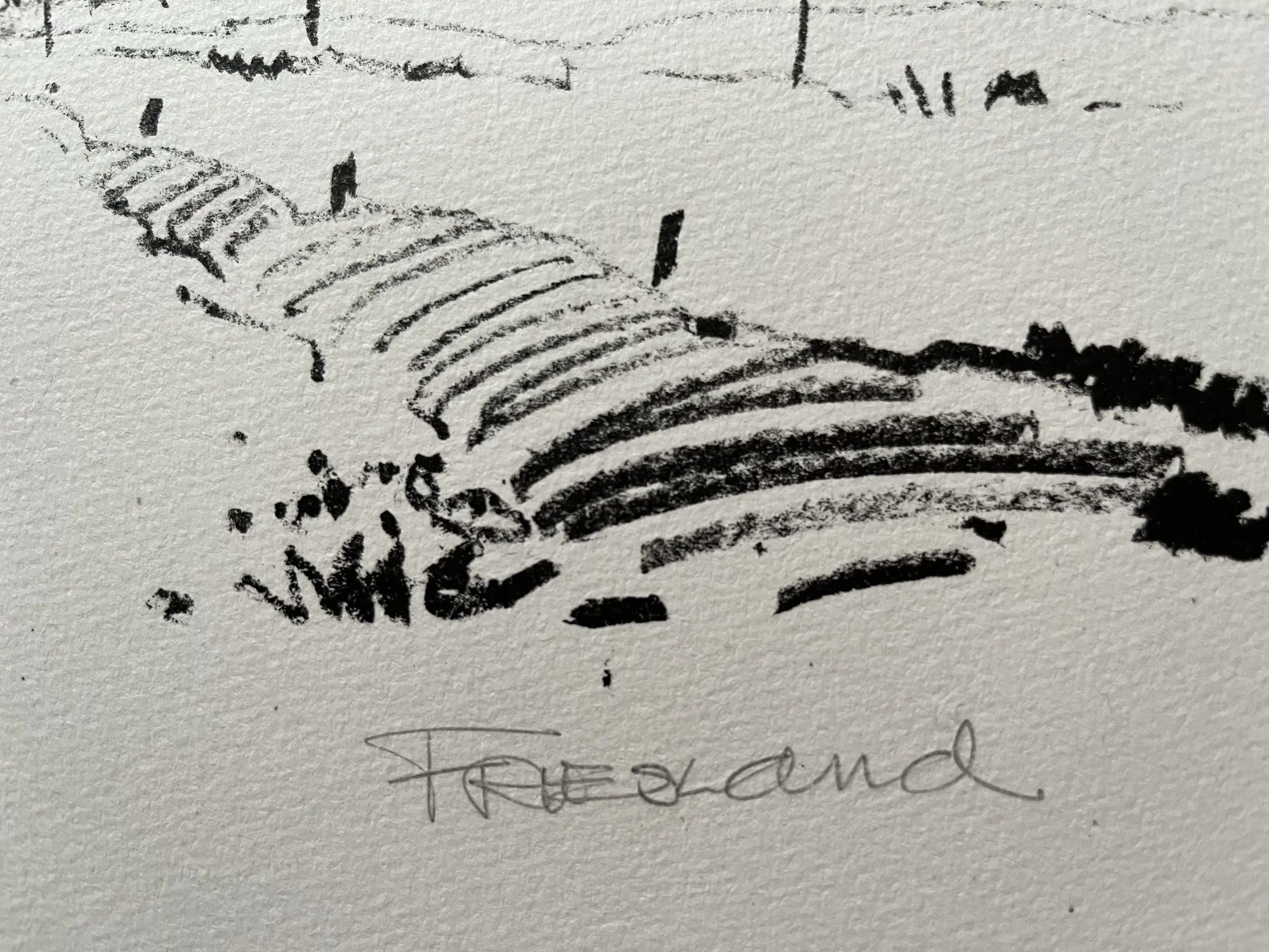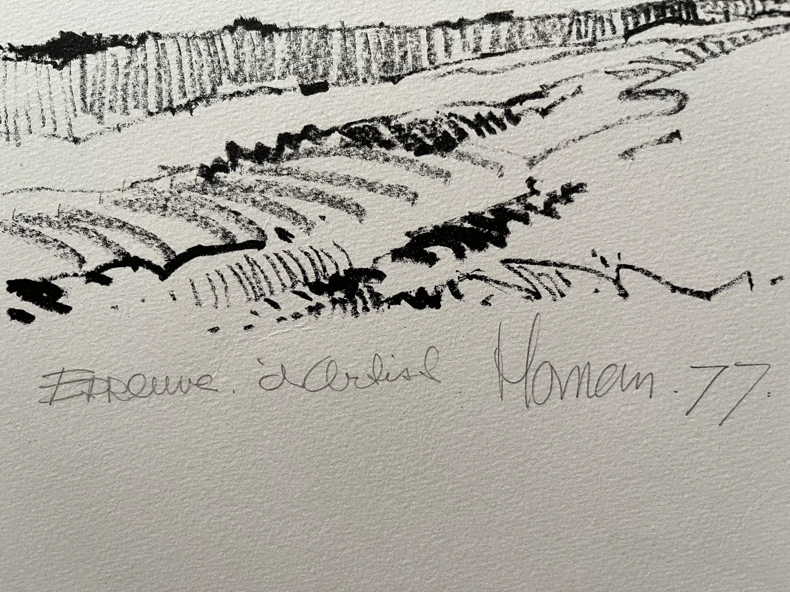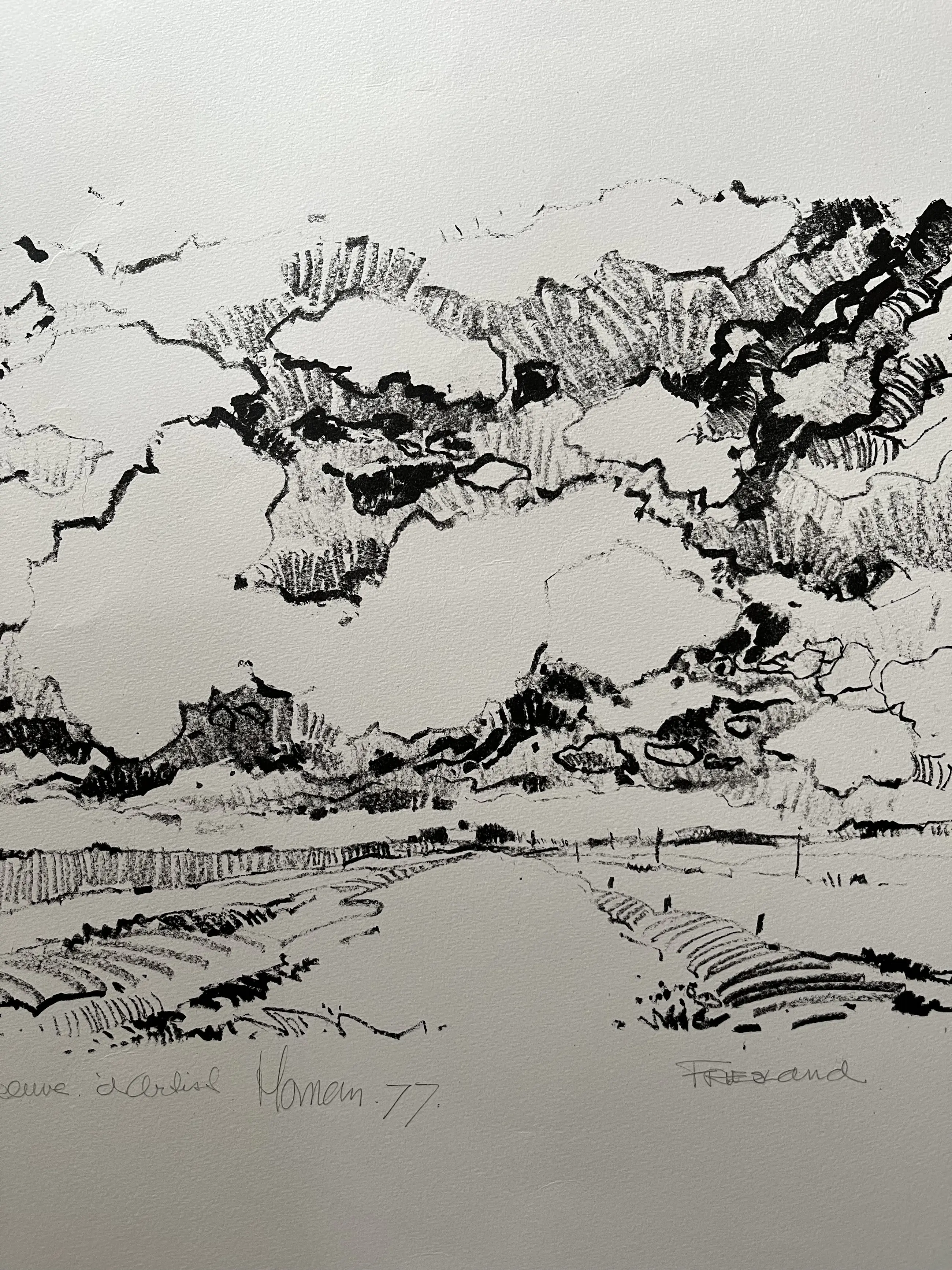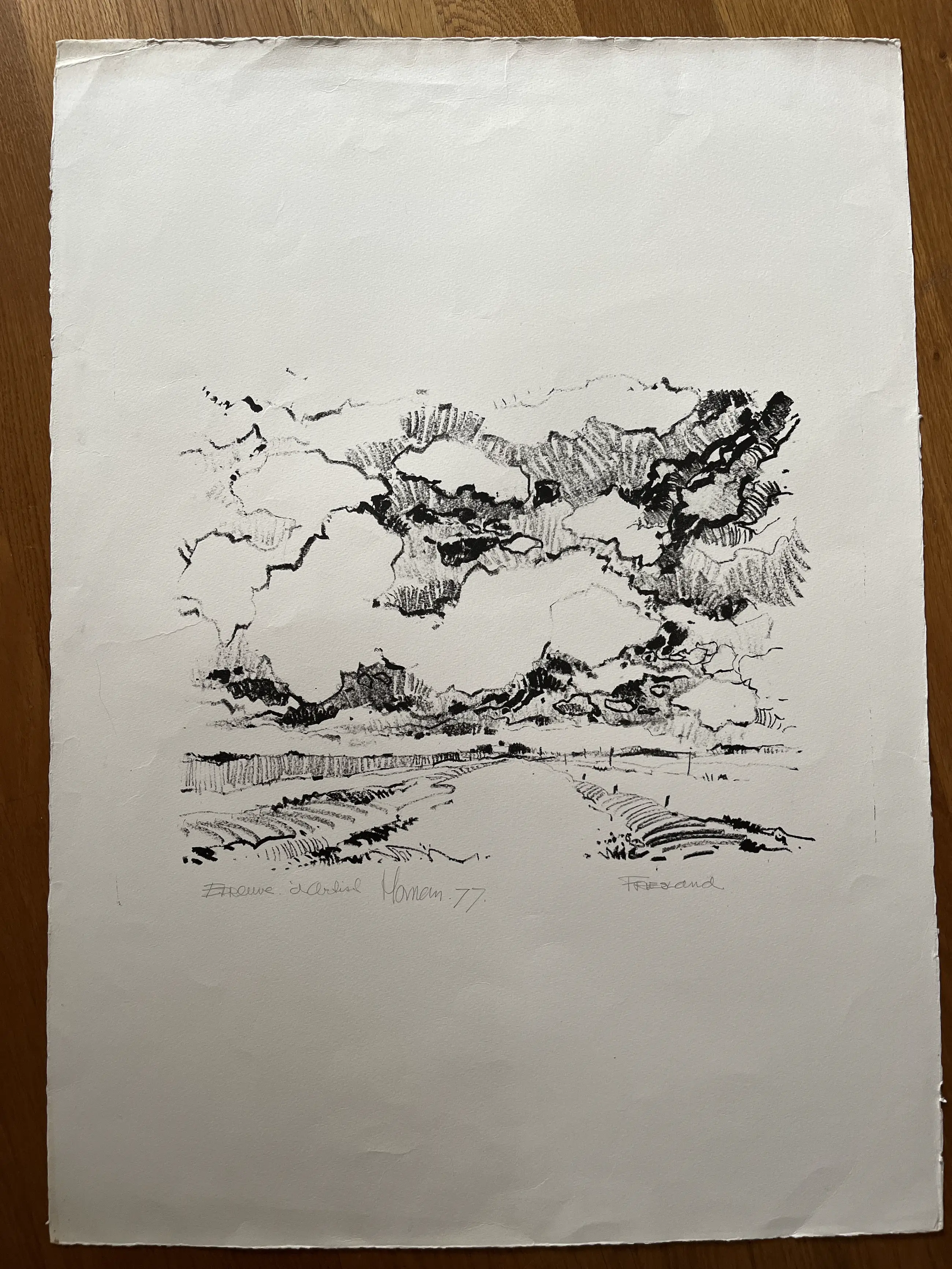 Grafiekblad uit 1977 getiteld : “Friesland”. Dit is een EP exemplaar. Blad is m.n. aan de randen wat gekreukt en een rand van 2 cm. aan bovenzijde is verkleurd. ( zie detailfoto’s)