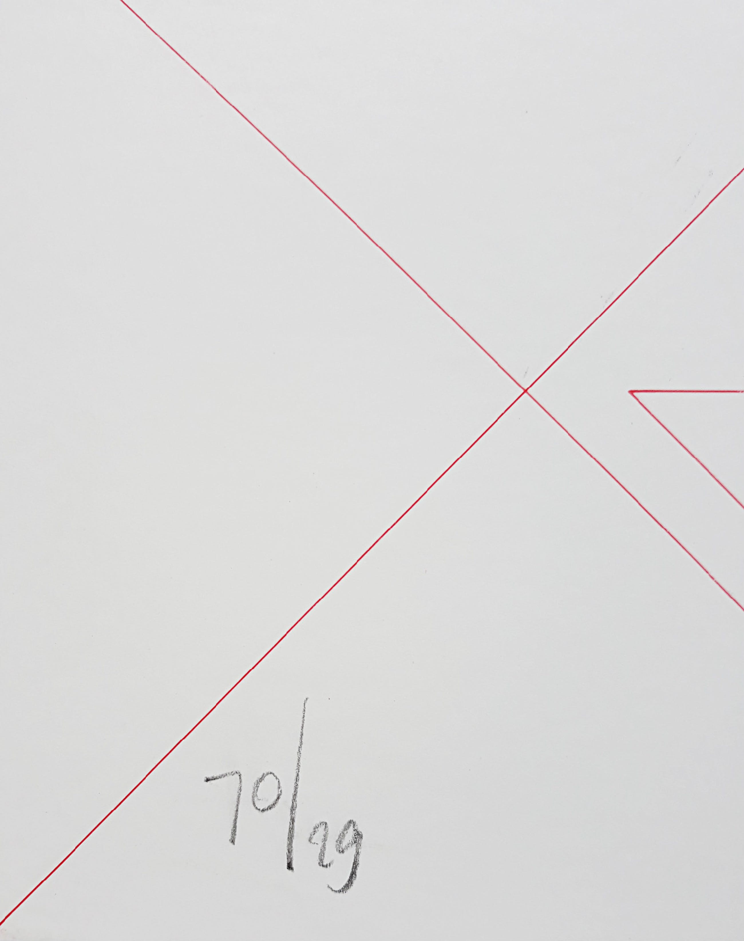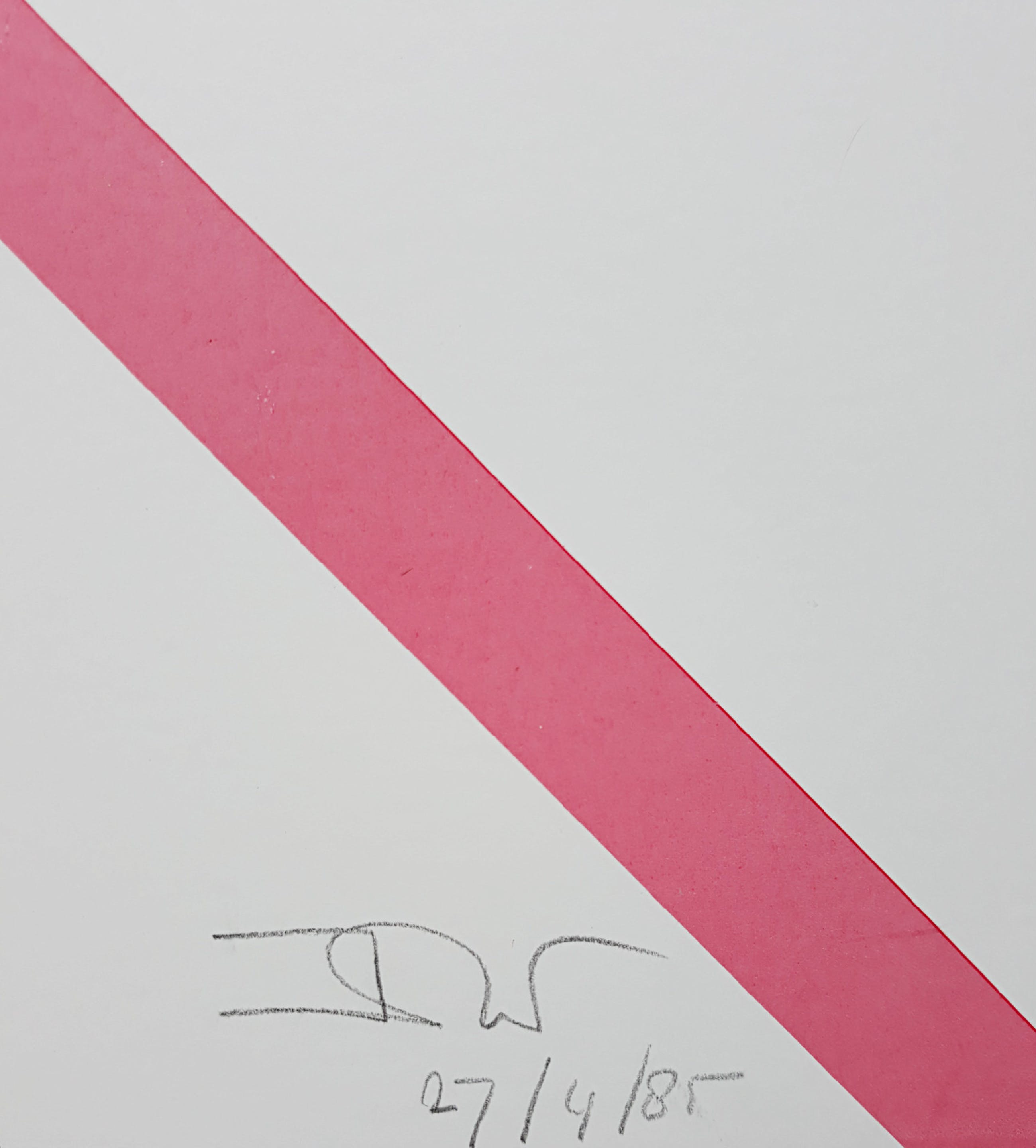 Een werk dat het midden houdt tussen architectuur en kunst, ik herken als leek in ieder geval geen bestaand gebouw. Zeefdruk op dik glad papier/karton, met potlood gesigneerd, gedateerd (27/4/85) en genummerd (70/29). In zeer goede conditie.