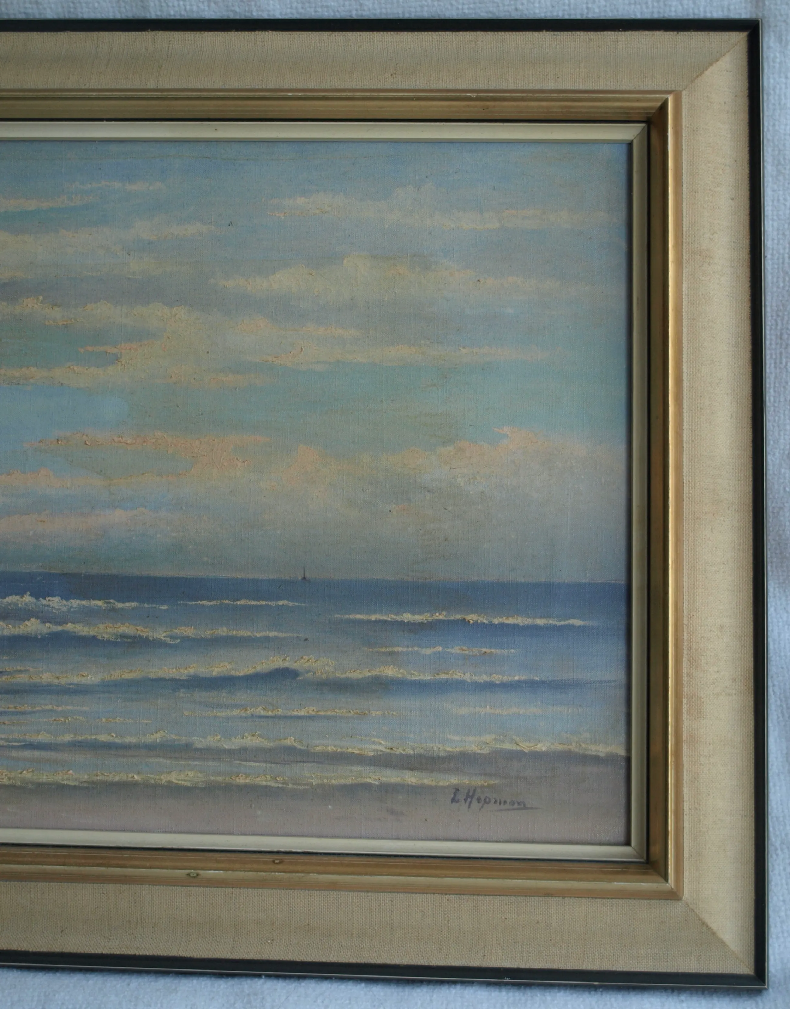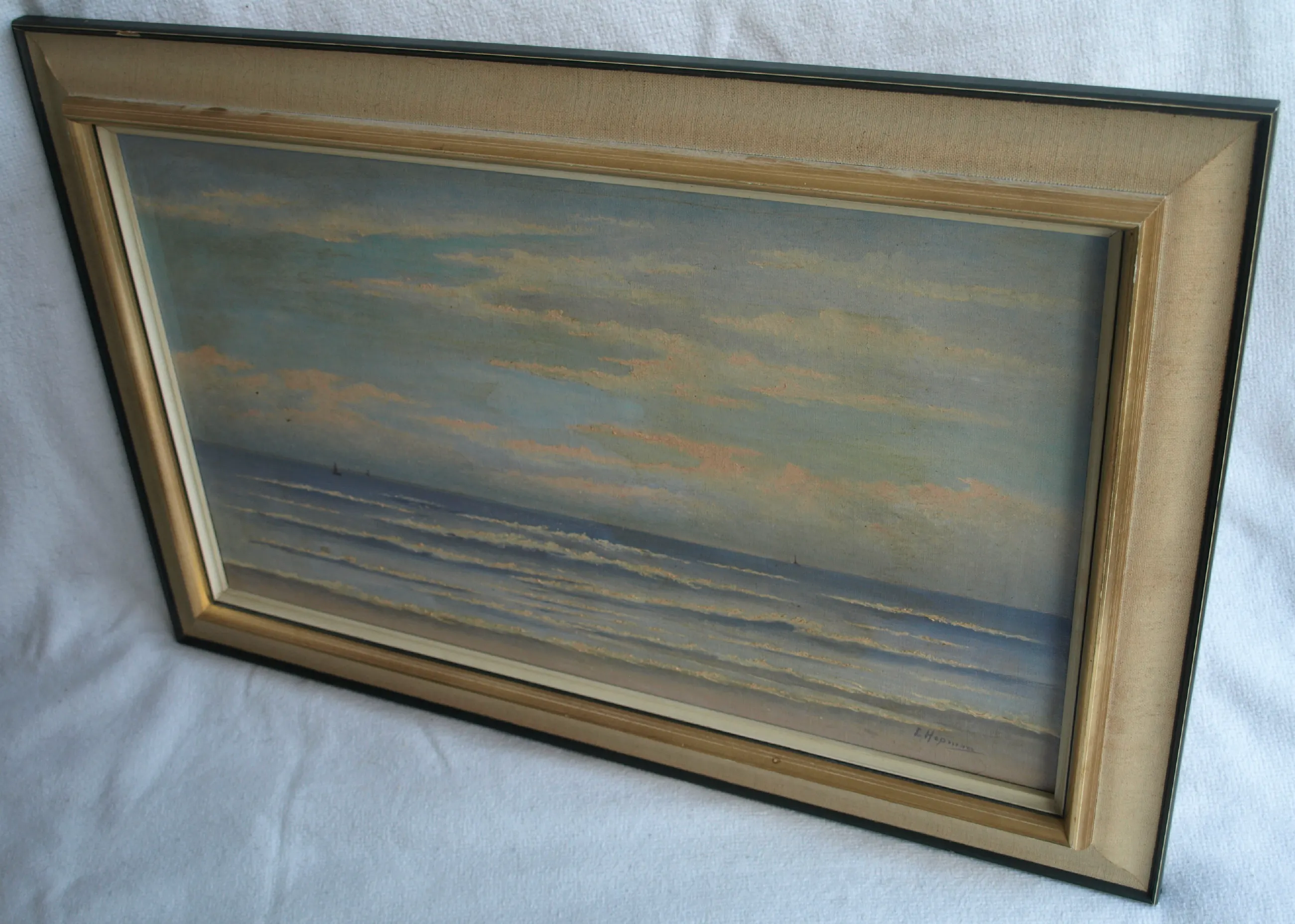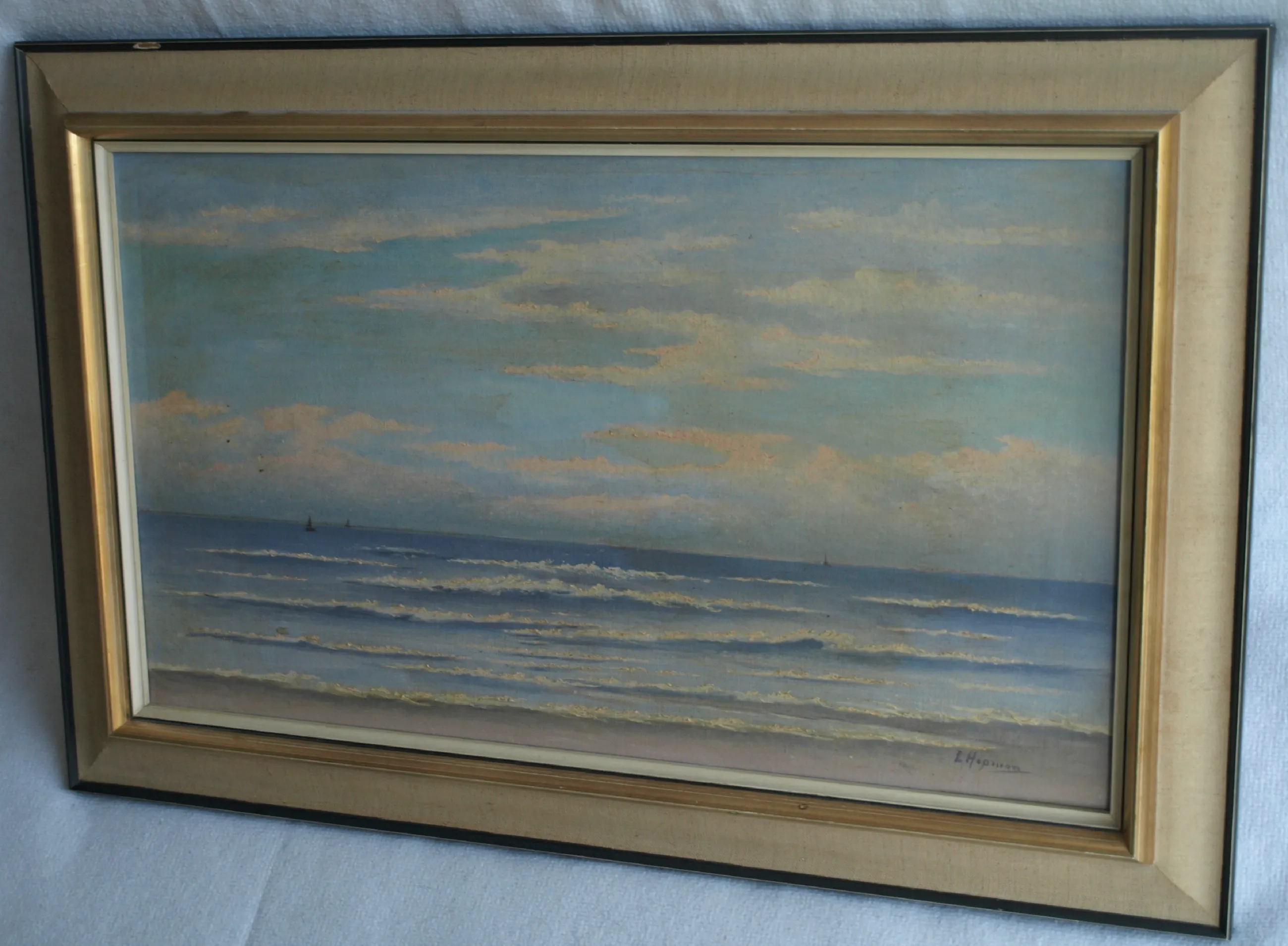 Een ingelijst schilderij van de Nederlandse kunstenaar Jan Hopman (1908-1975. -Olieverf op doek, opgespannen op een houten spieraam. -Gesigneerd rechtsonder en ingelijst in de originele houten lijst met linnen rand. -Afmetingen: Lijst, 47 x 72 cm. Spieraam, 35 x 60 cm. Beeld, 34 x 59 cm. -Herkomst: Uit een inboedel. -Conditie: In redelijke staat. Het doek heeft oppervlaktevuil en zou schoongemaakt kunnen worden. De lijst heeft slijtplekjes en heeft een beschadiging aan de bovenrand. Zie ook de foto’s voor een eigen indruk. Kan zo aan de muur.