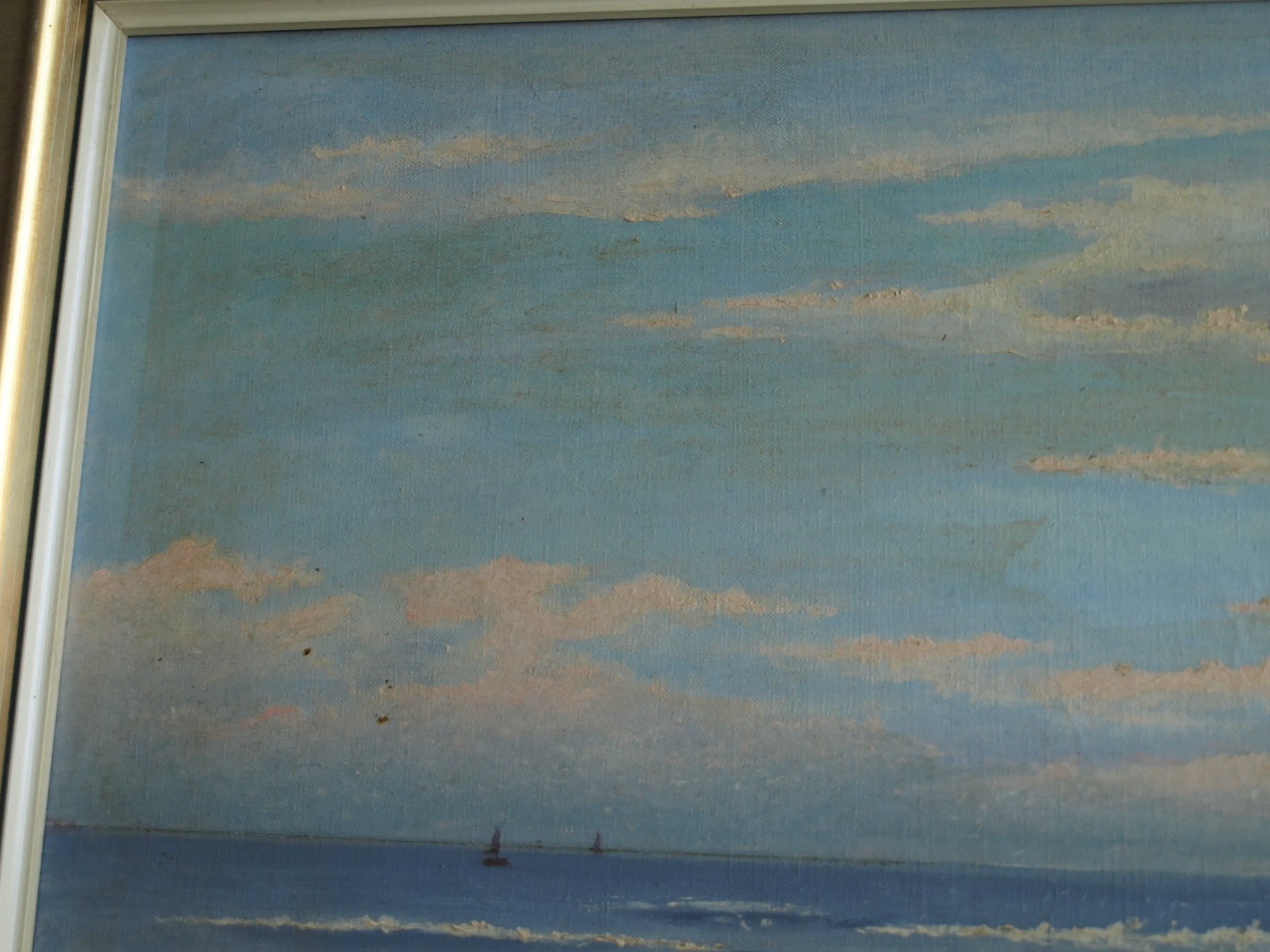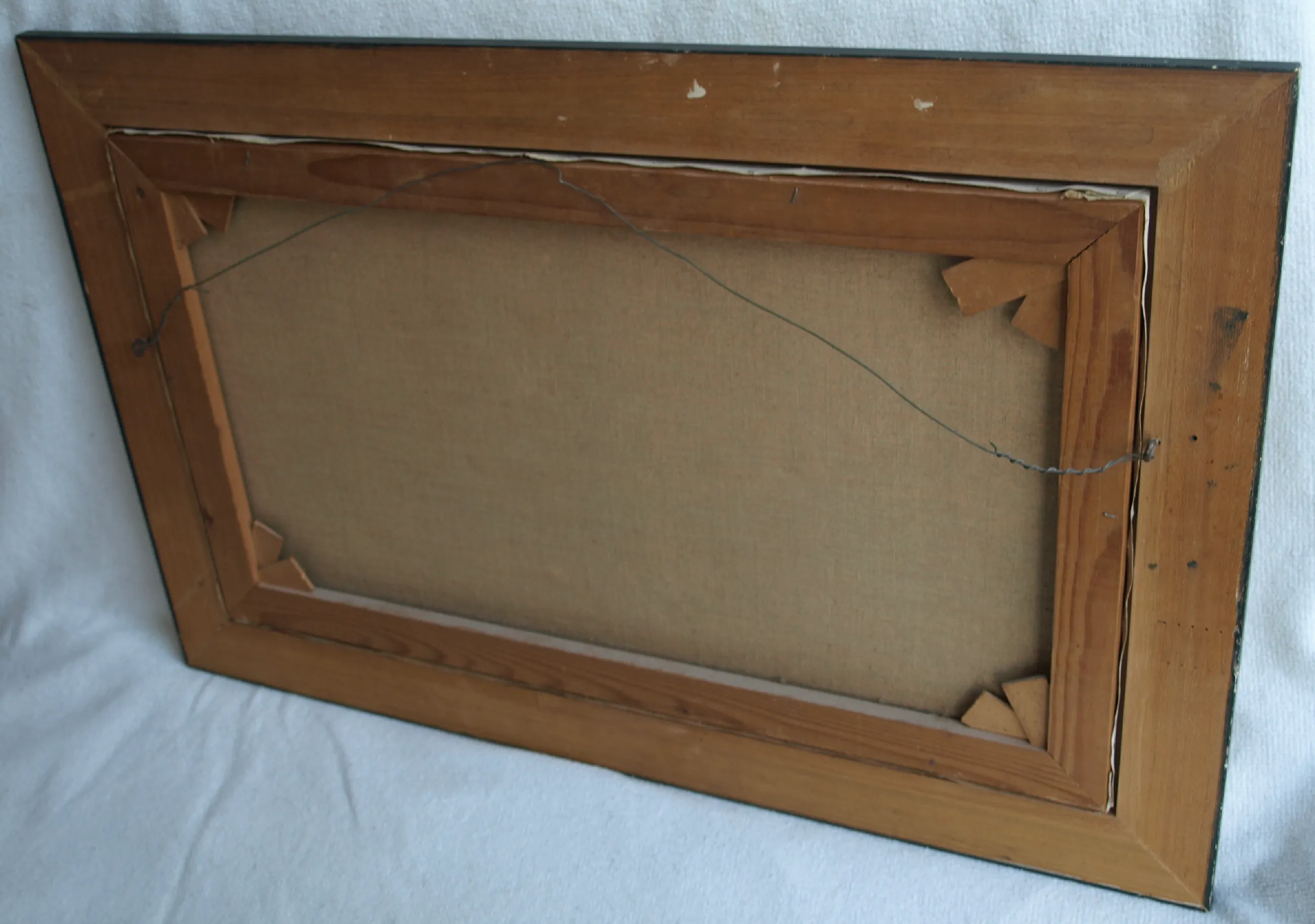 In redelijke staat. Het doek heeft oppervlaktevuil en zou schoongemaakt kunnen worden. De lijst heeft slijtplekjes en heeft een beschadiging aan de bovenrand. Zie ook de foto’s voor een eigen indruk. Kan zo aan de muur.