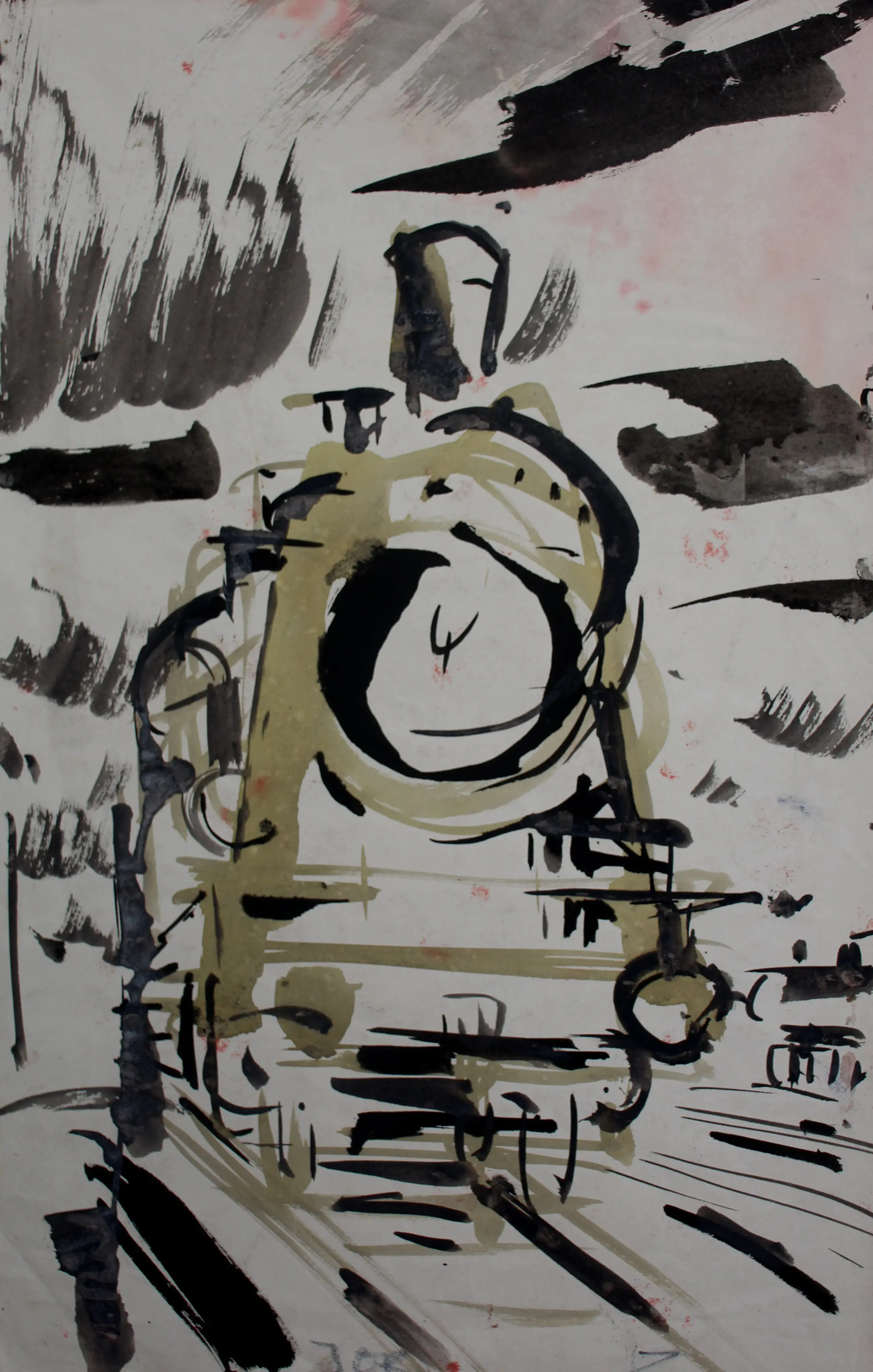 Aquarel van Jan Jordens. Voorstelling van een locomotief. Afmetingen blad: H43.5 x b28cm. Het werk is, midden onderaan door de kunstenaar gesigneerd. De authenticiteit van het, aangeboden, werk wordt volledig gegarandeerd. Een certificaat van echtheid kan, op aanvraag, worden gemaild.
