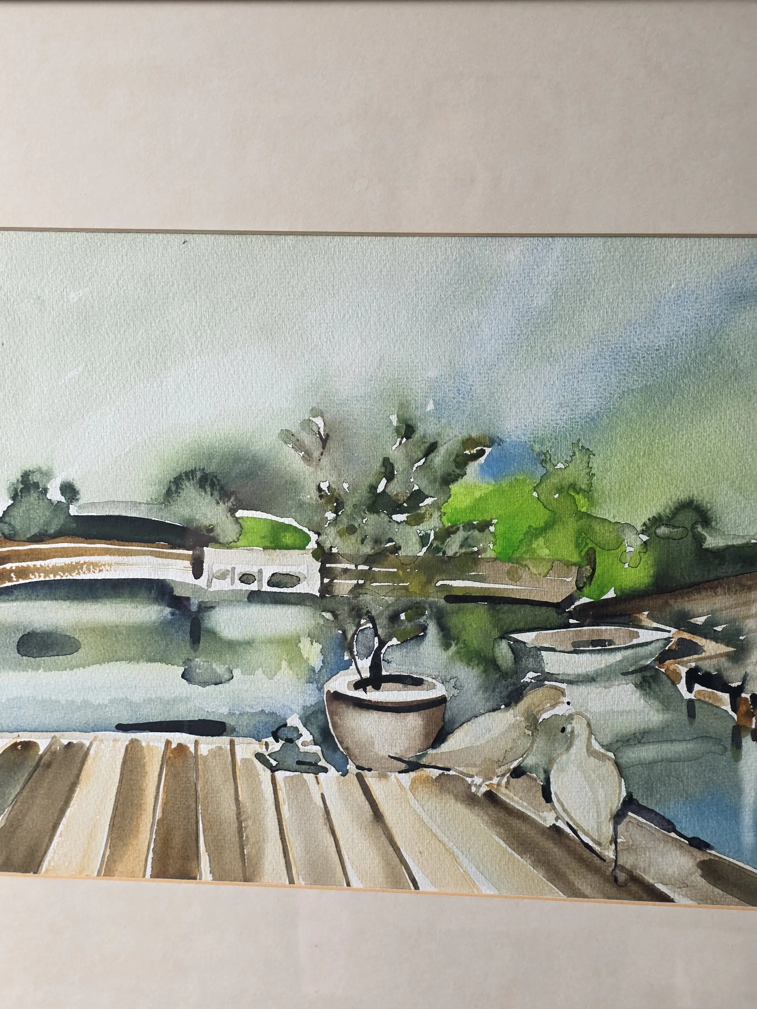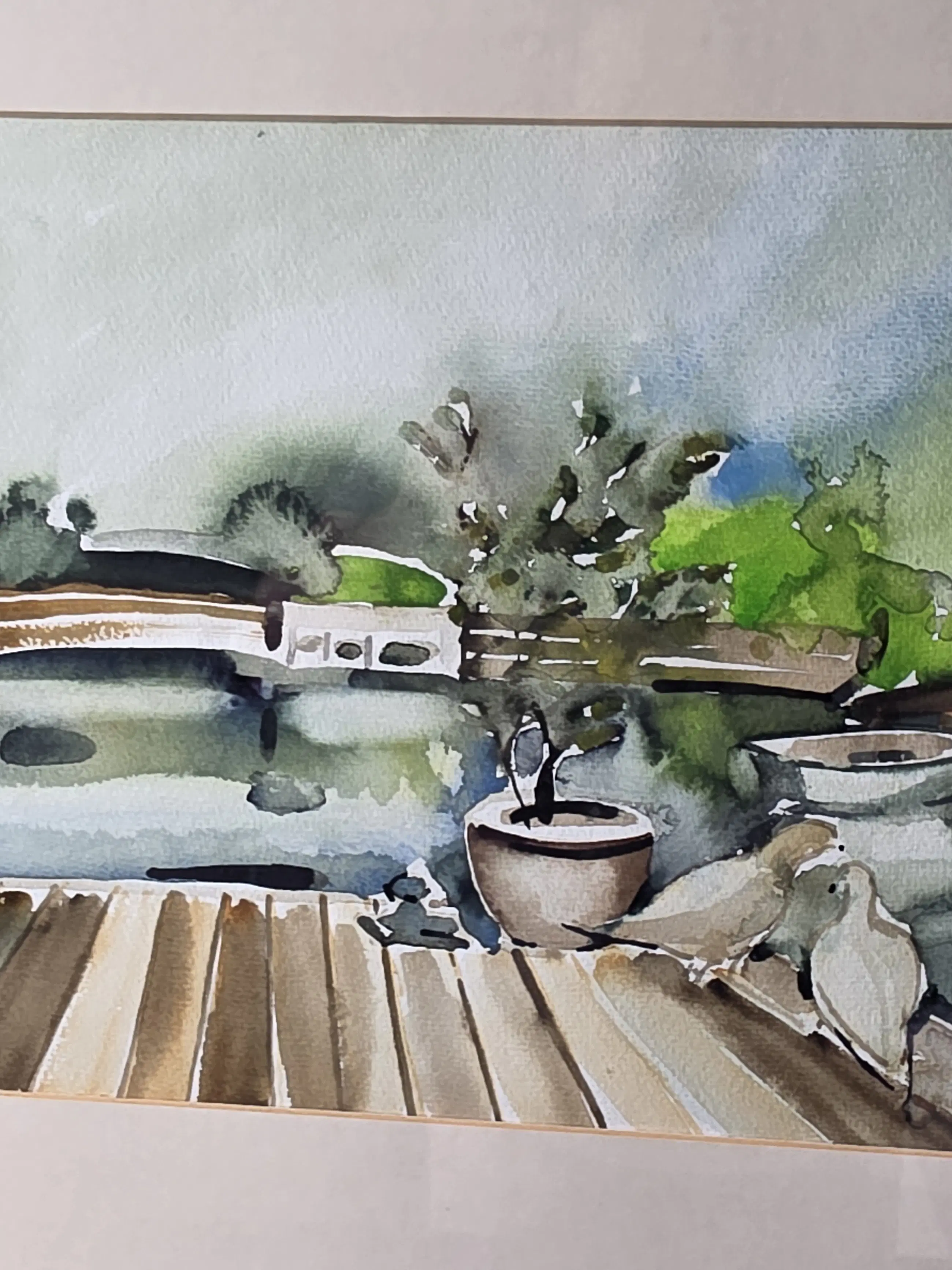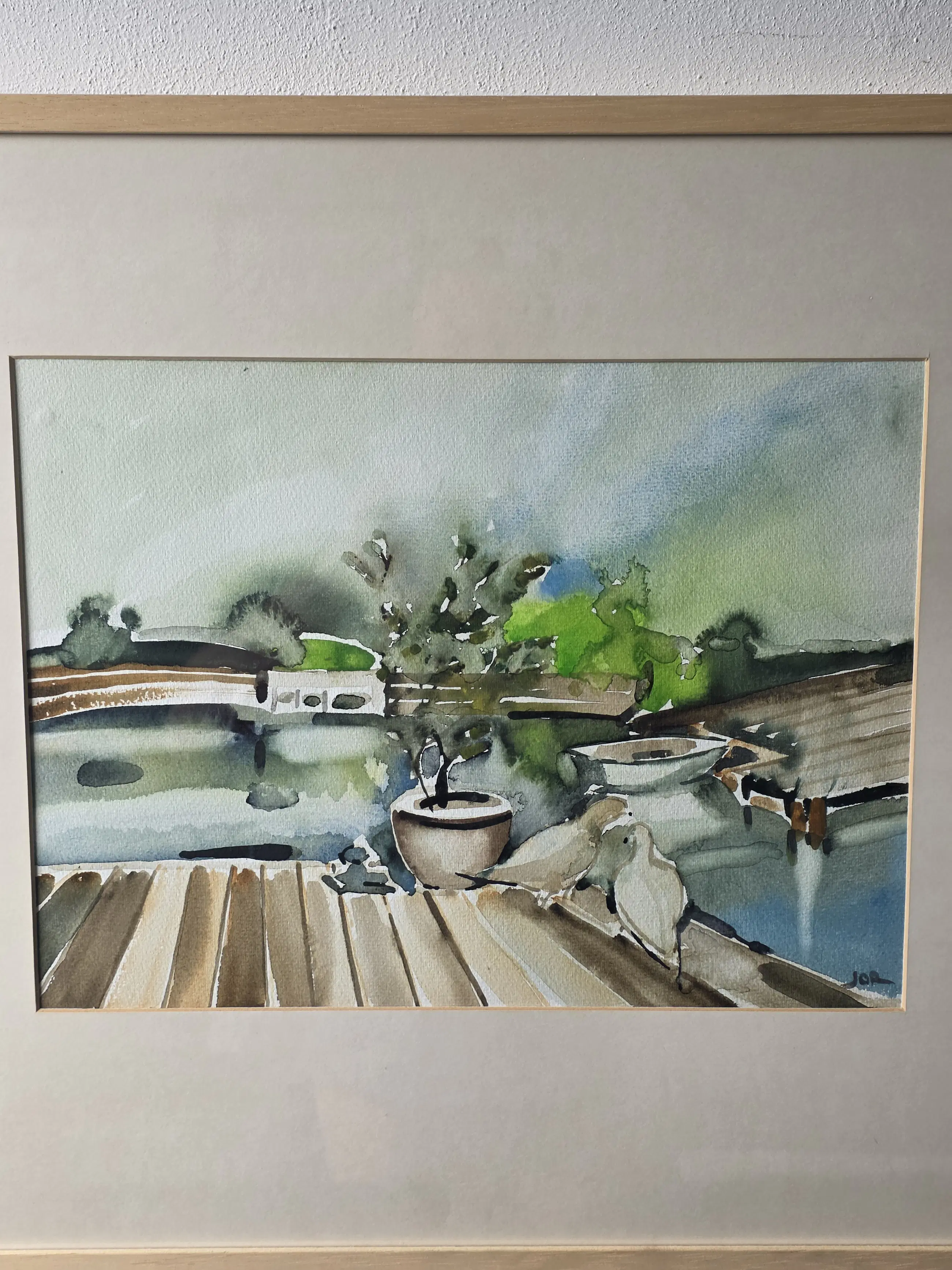 Duiven in de tuin, aquarel van Jan Jordens in zeer goede staat, 24x34 met lijst 47x37 word zorgvuldig verpakt en verzekerd verzonden.